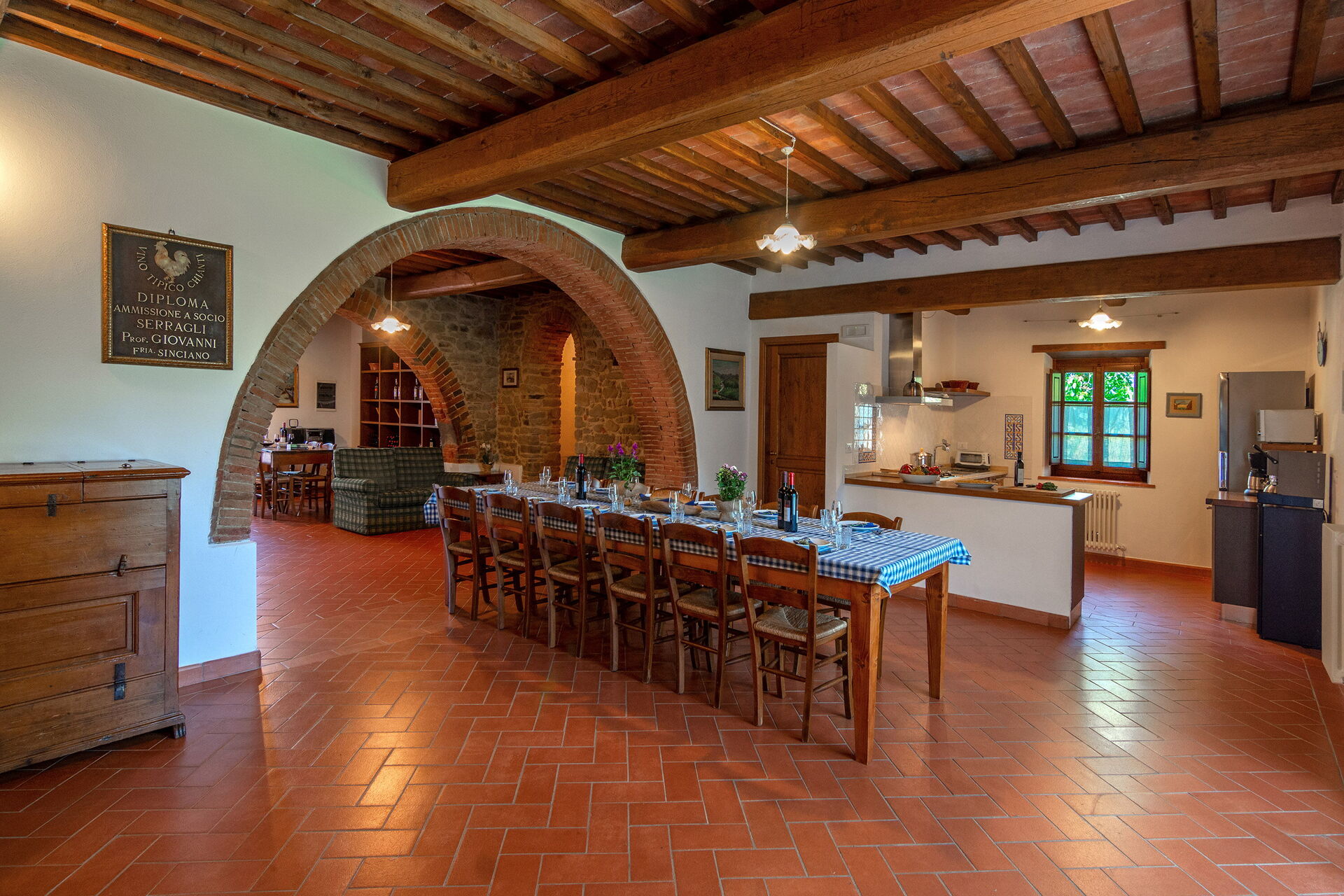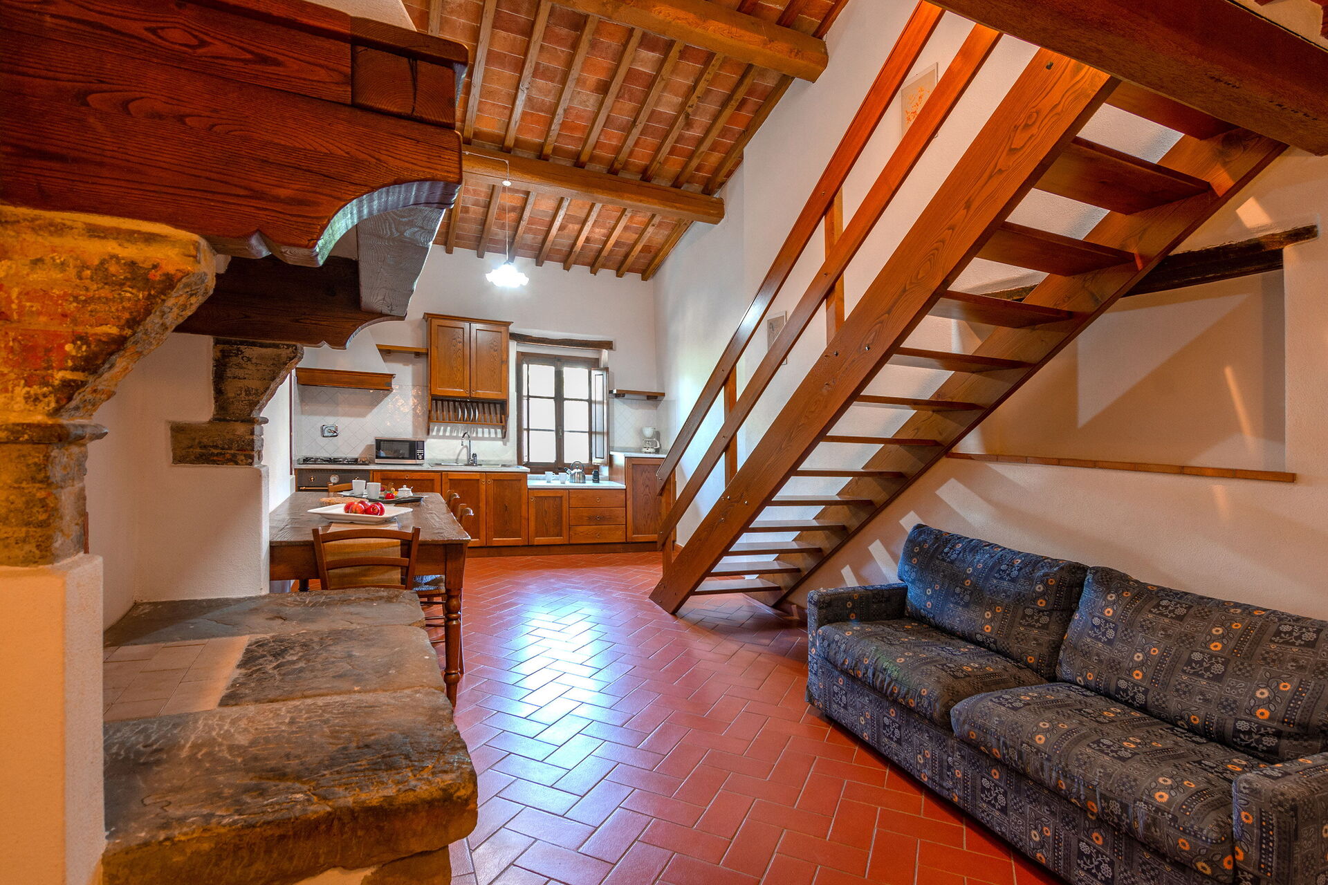 Cocina-salón: mesa de comedor, lavavajillas, frigorífico, microondas, cocina de gas, máquina de café italiana, sofa, chimenea.