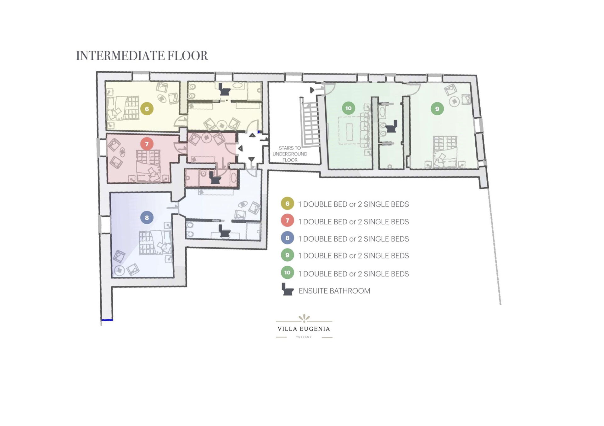 Incluye: 3 habitaciones con baño, 2 habitaciones, baño, habitación.