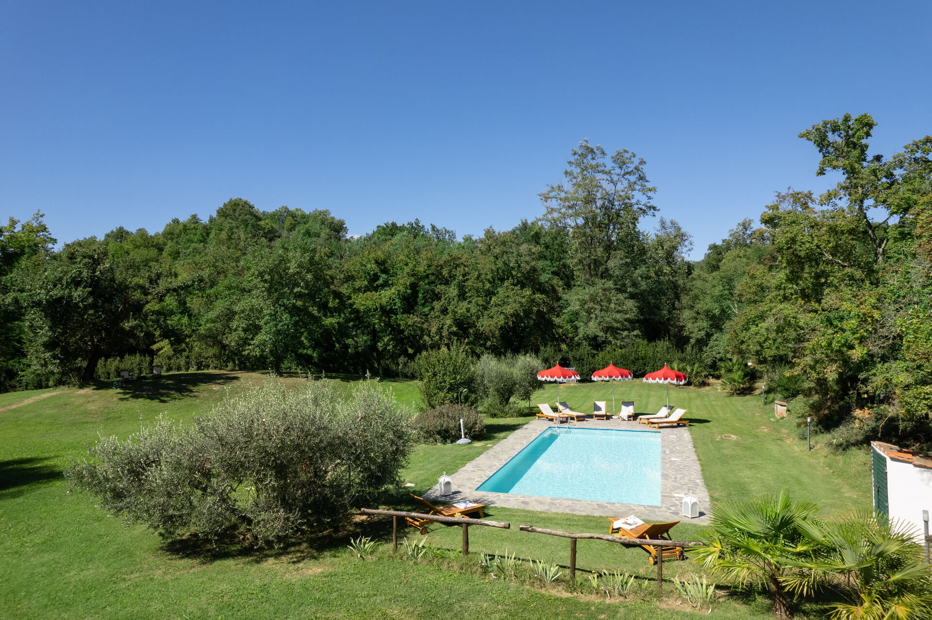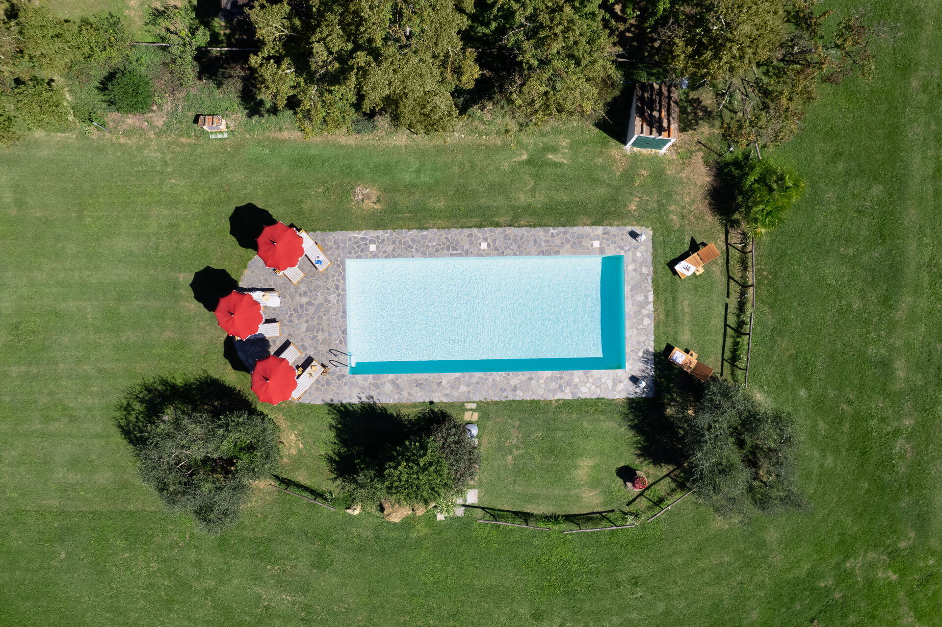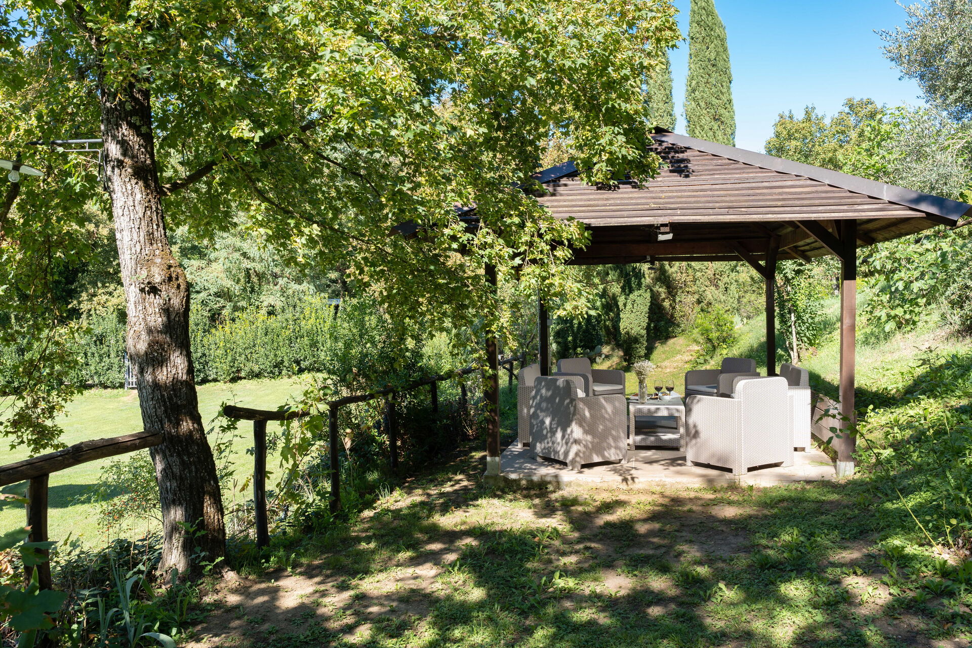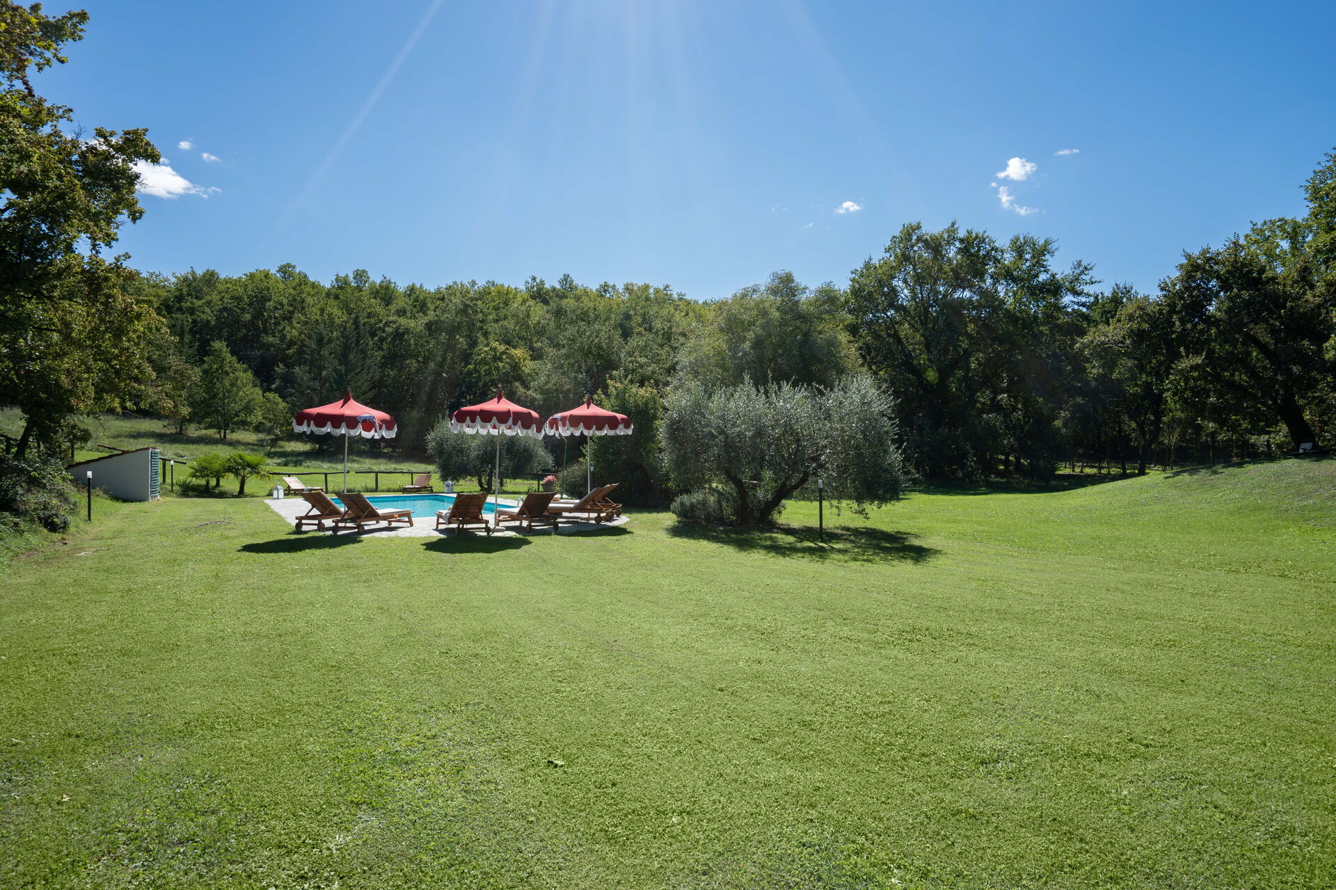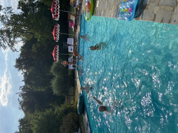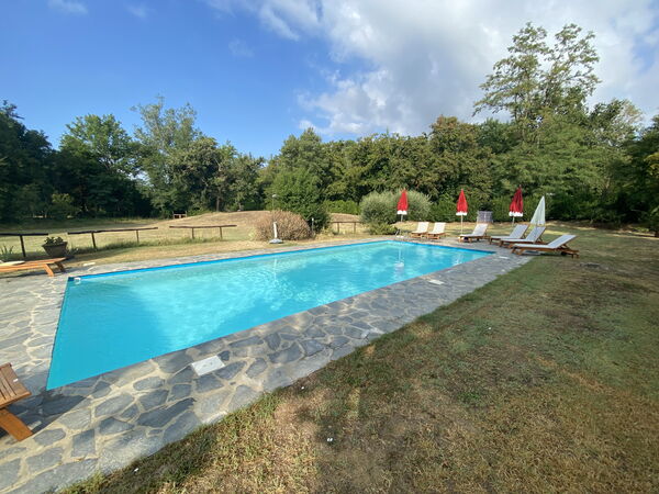 Outside a vast area is entirely private for you. The pool area has a huge park for a large pool (12mt*5mt) with deckchairs and a shower. Two marquees and a wooden pagoda if you want to chill in the shade, eat a snack or drink some wine!