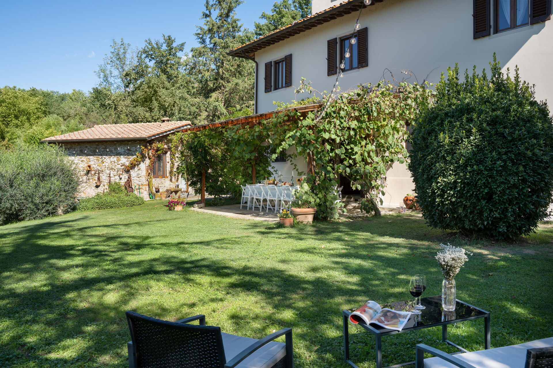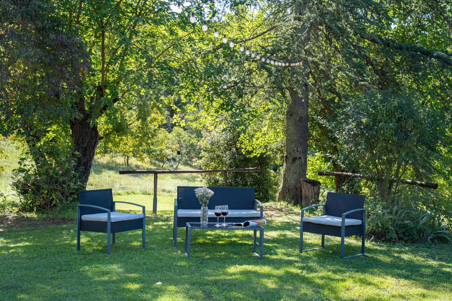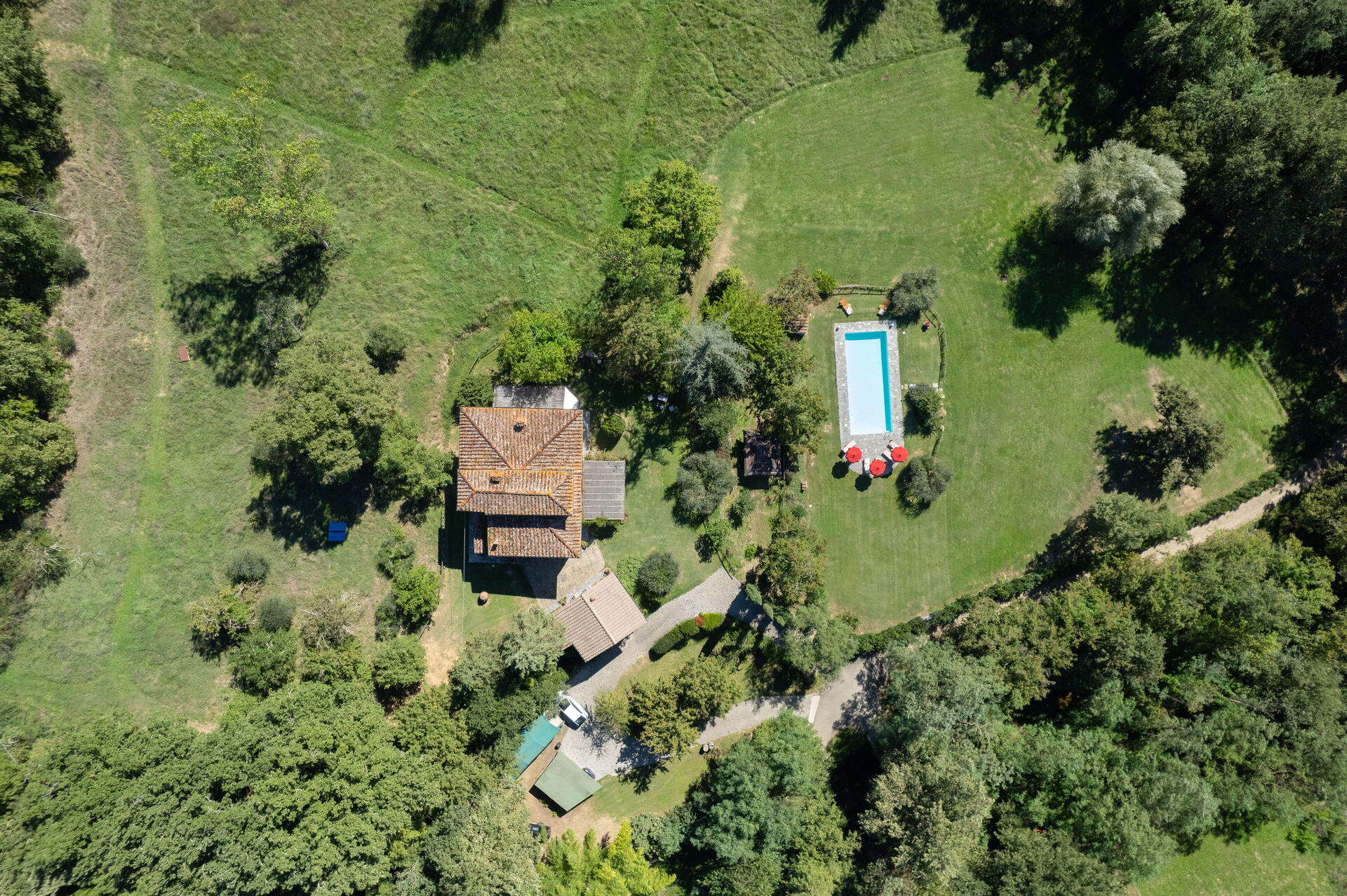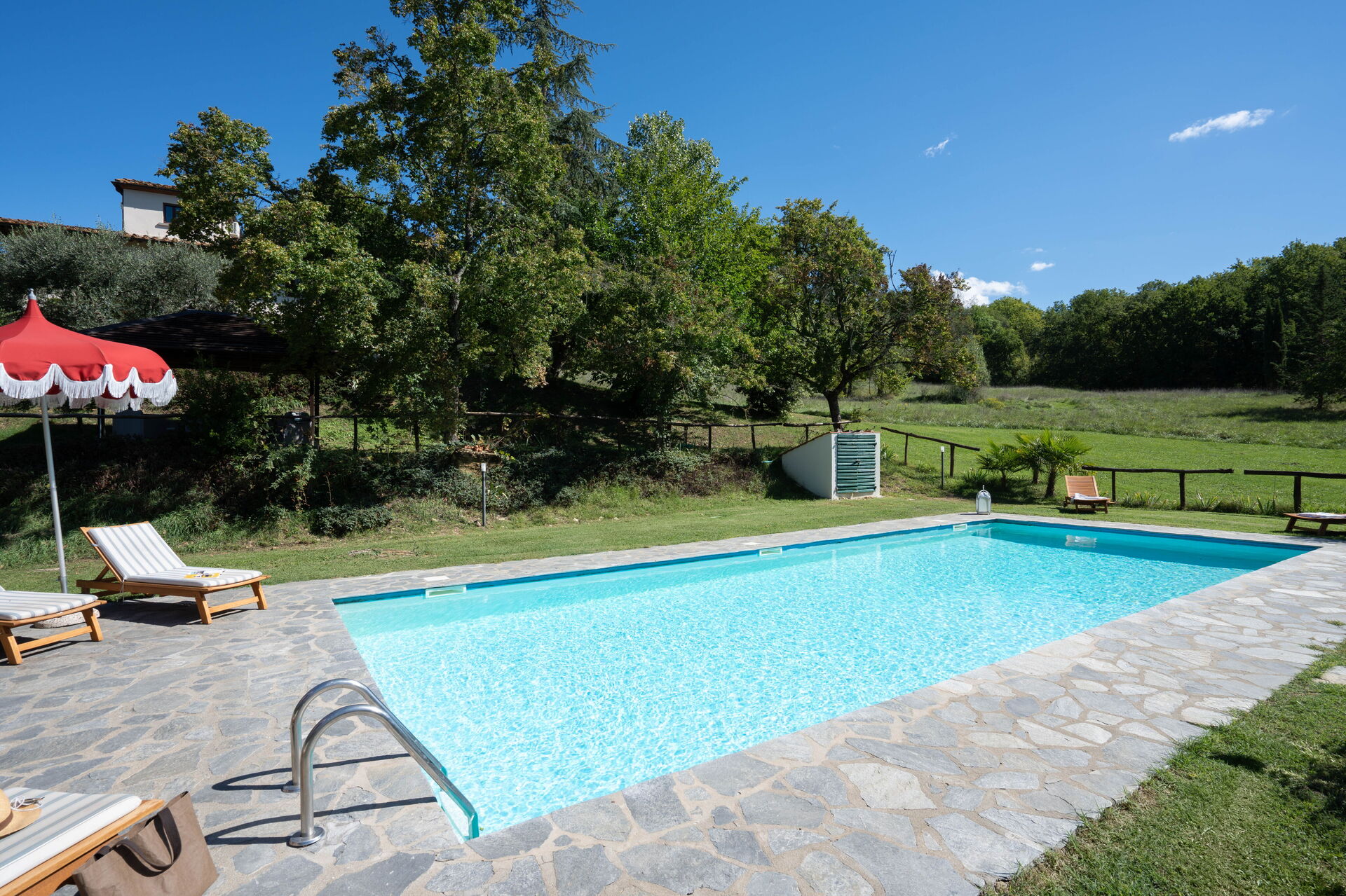 Outside a vast area is entirely private for you. The pool area has a huge park for a large pool (12mt*5mt) with deckchairs and a shower. Two marquees and a wooden pagoda if you want to chill in the shade, eat a snack or drink some wine!