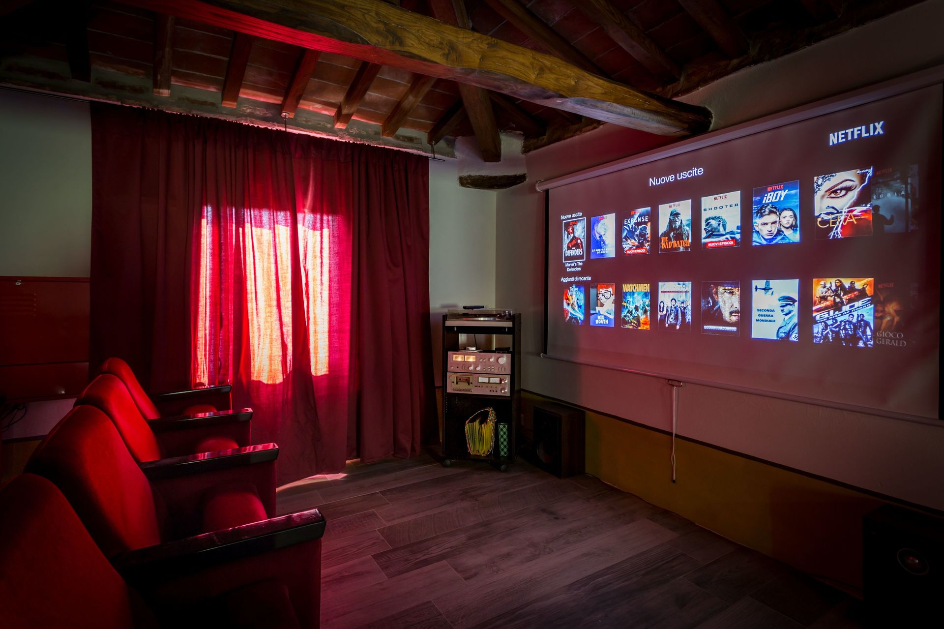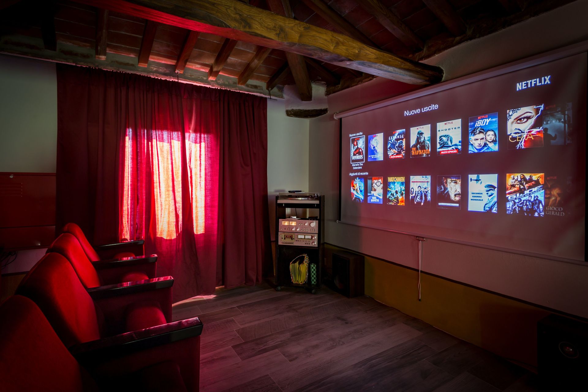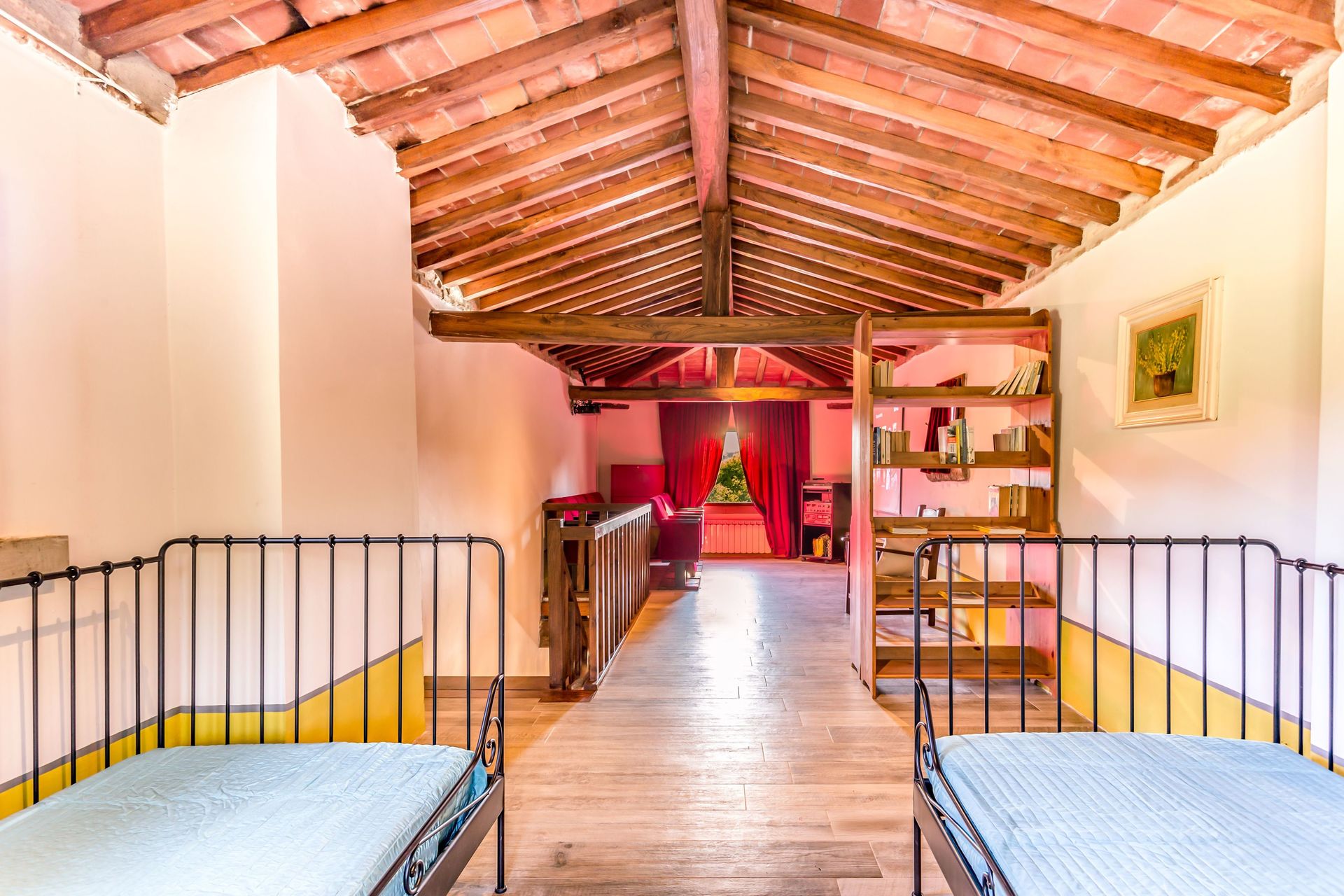 On the first floor you get to the corridor with a big desk if you have some emails to check. From the corridor you can get to the three bedrooms and bathrooms (two double, one twin beds). There is also a wooden staircase to the second floor where we have made a reading area with two twin sofas and an authentic home theater with 2 rows of REAL vintage red velvet seats: You can watch your favorite programs on a cinema screen!
