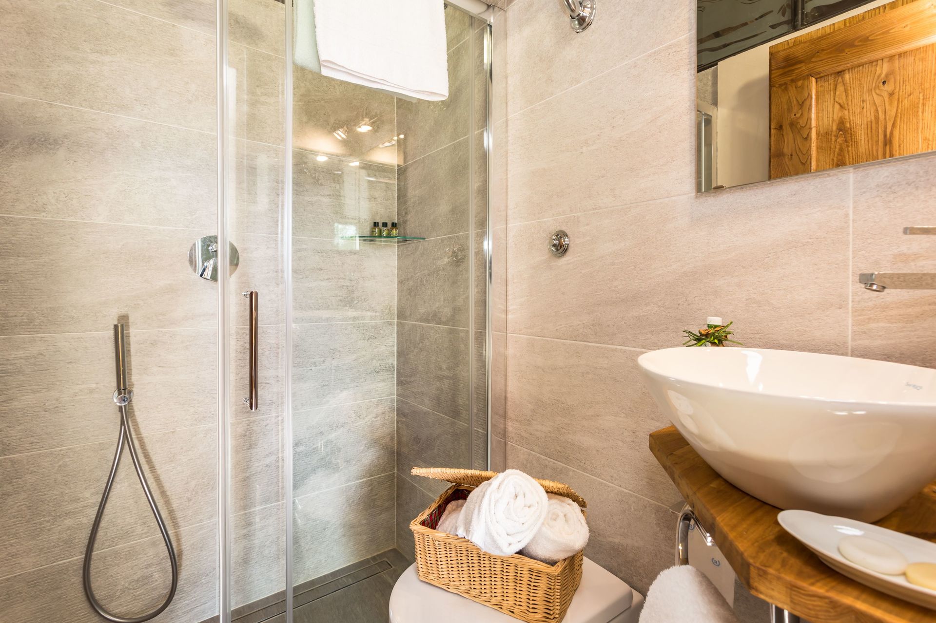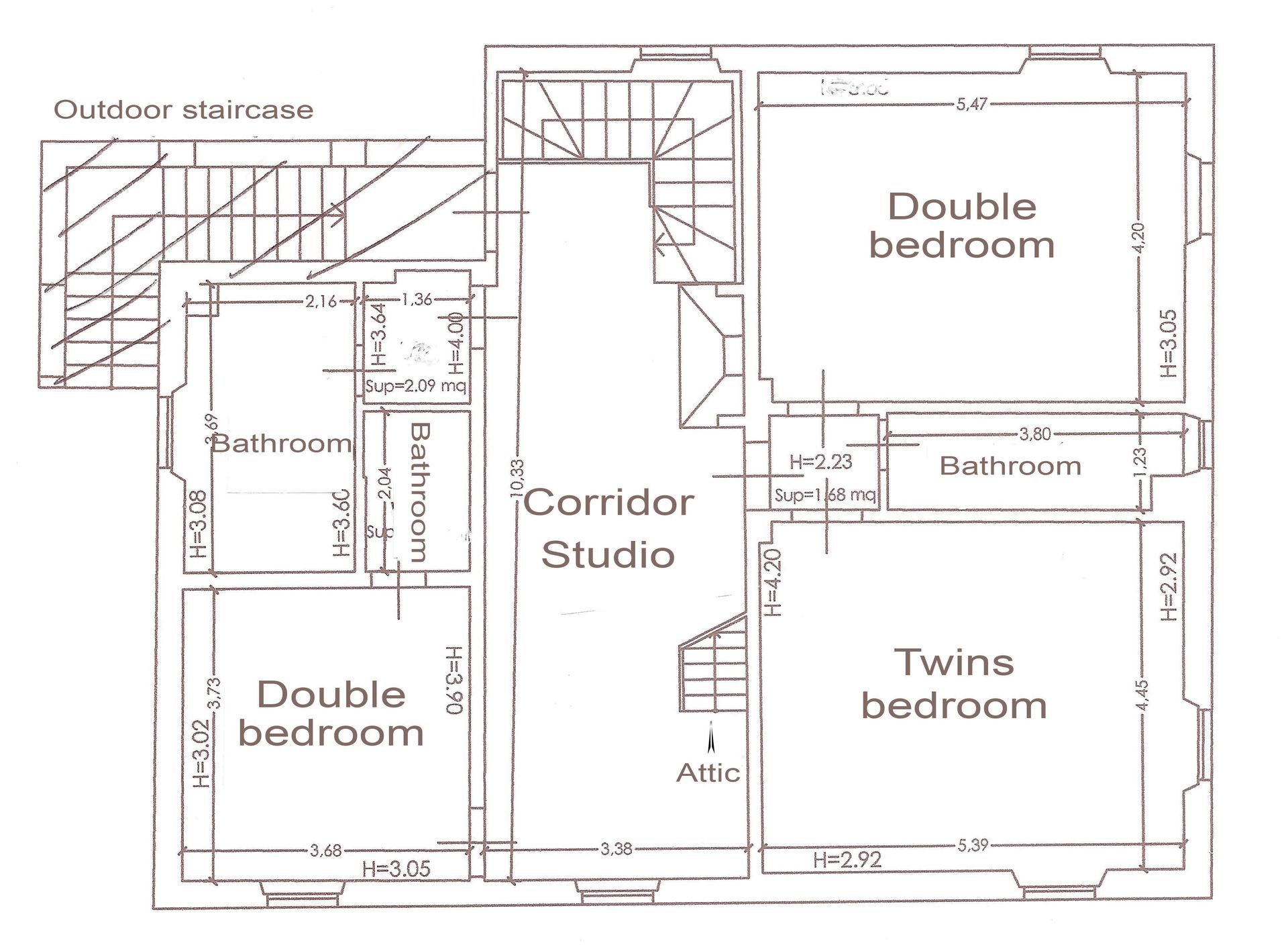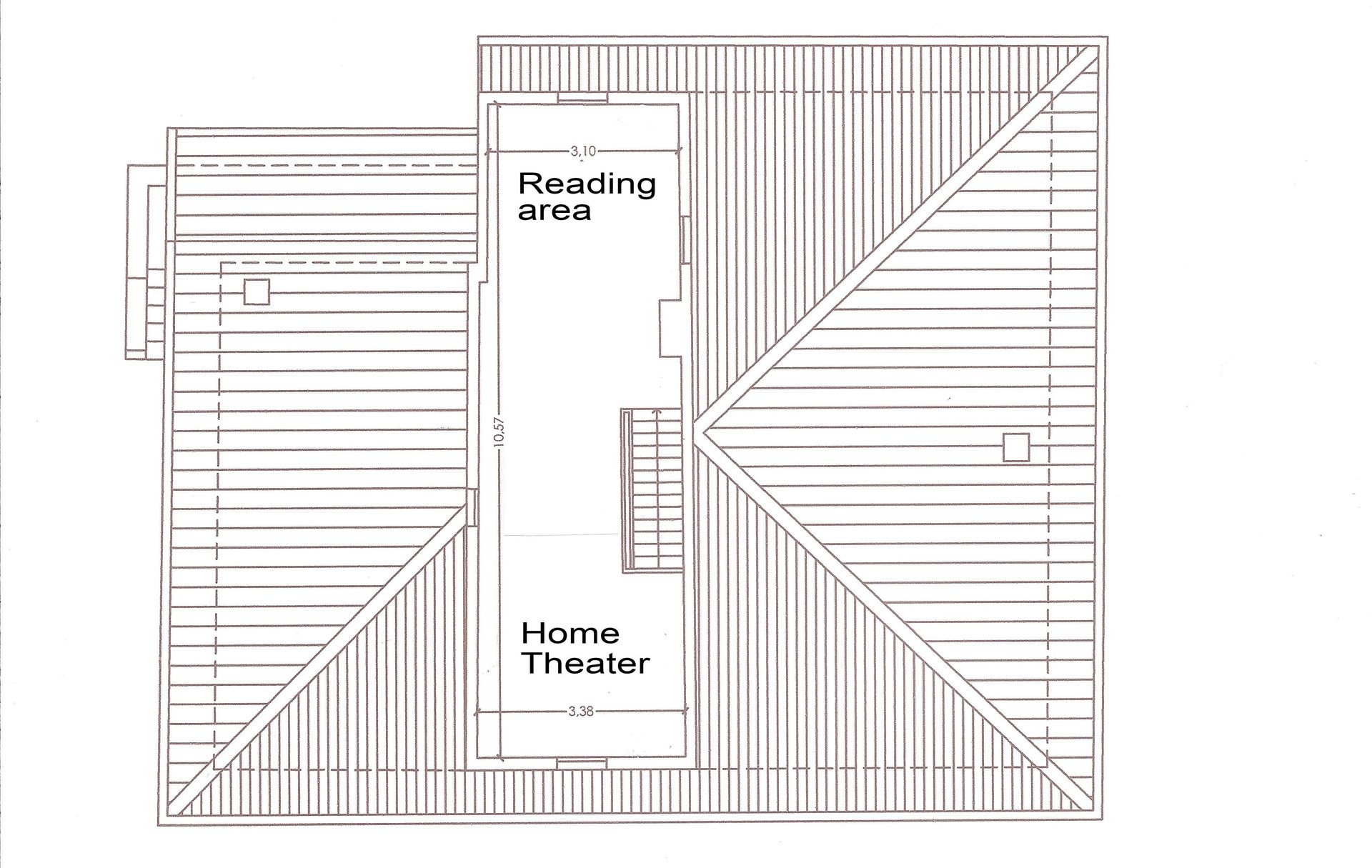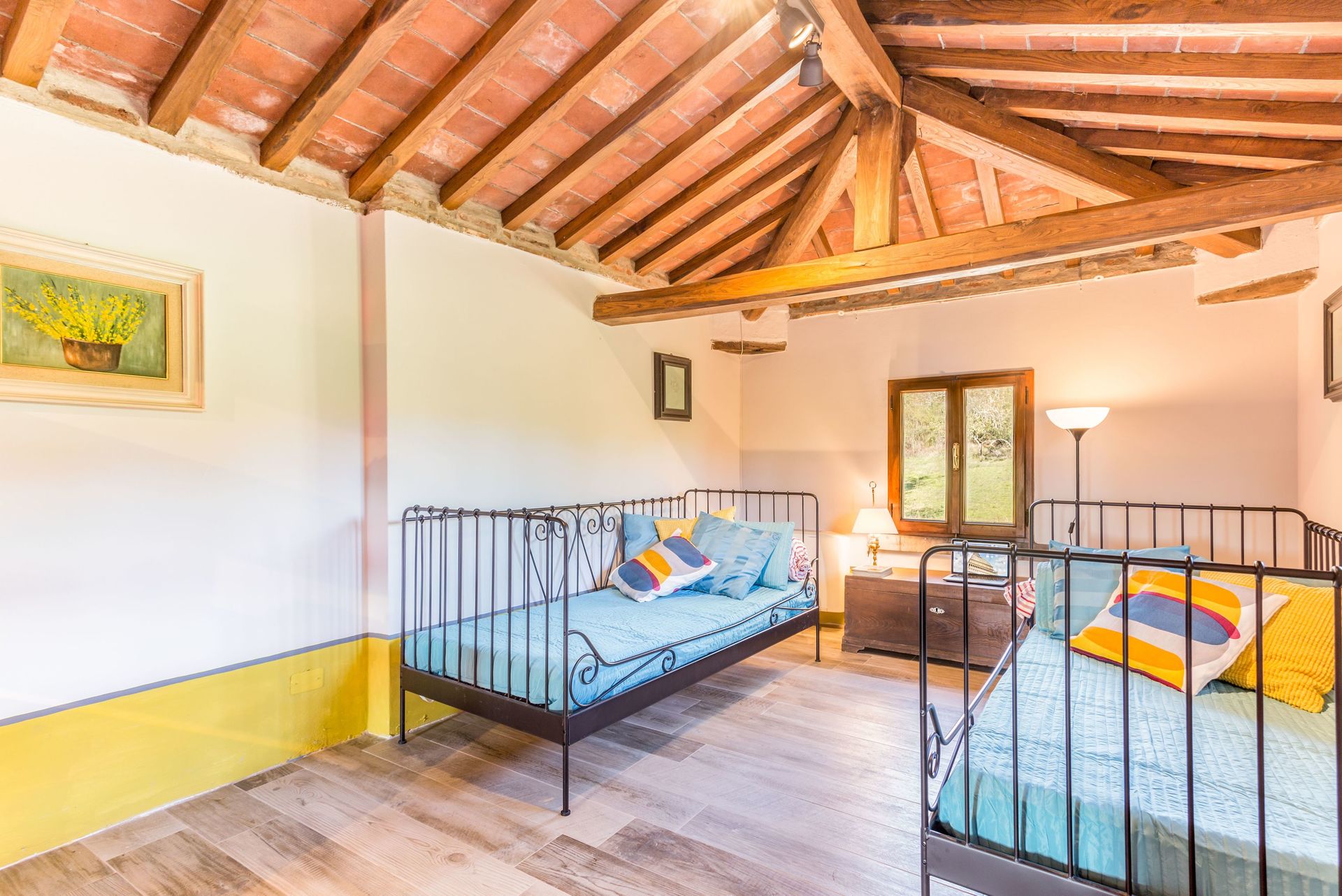 On the first floor you get to the corridor with a big desk if you have some emails to check. From the corridor you can get to the three bedrooms and bathrooms (two double, one twin beds). There is also a wooden staircase to the second floor where we have made a reading area with two twin sofas and an authentic home theater with 2 rows of REAL vintage red velvet seats: You can watch your favorite programs on a cinema screen!