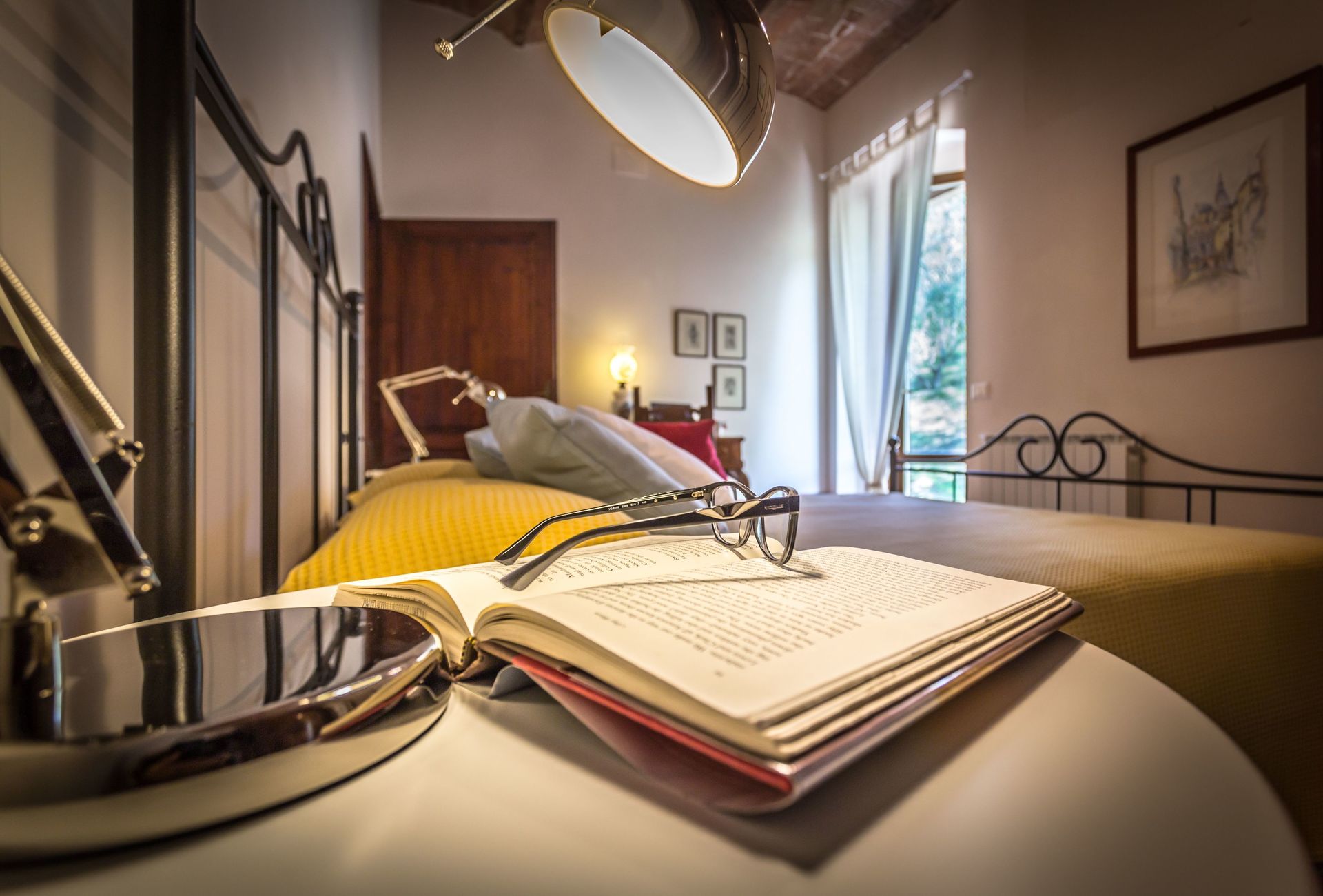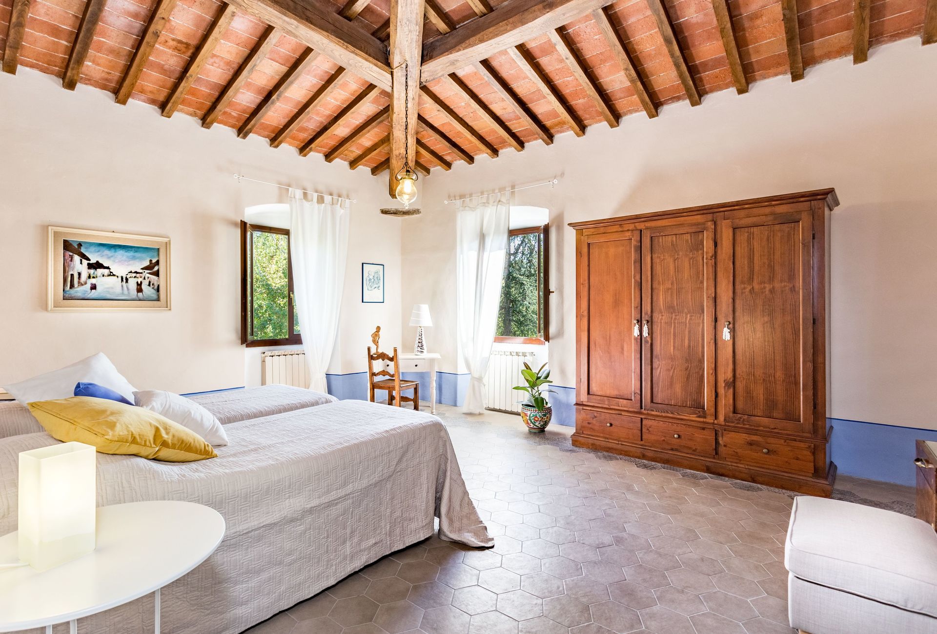 From the kitchen, walking anticlockwise direction, a beautiful wooden table dominates the dining room where we used to gather with our family. The living room has a large chimney and several sofas with colorful pillows and paintings to watch TV or to read a book. You can access the patio from here: the perfect room to read a book watching the vivid green nature outside the glass doors.