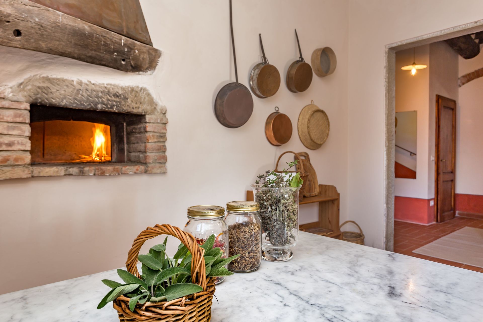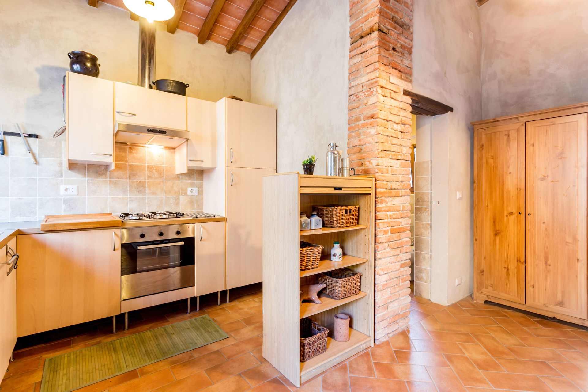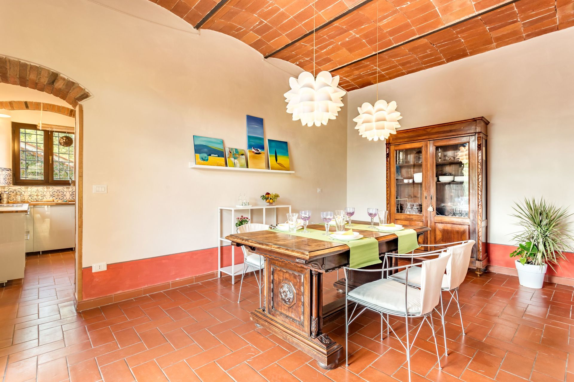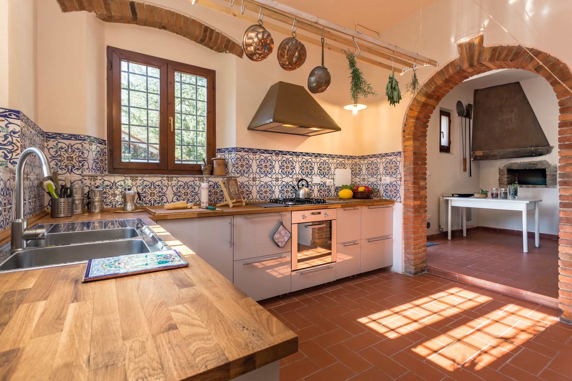From any of the two doors, you will be enchanted by the size and beauty of this house. The interiors are original with red bricks archways and tall ceilings. Right between the two entrances a large and bright "double" kitchen: the classic one with all the kitchen furniture, fridge and stoves/oven and the old one with a wood oven and a marble top table for your home cook preparations.