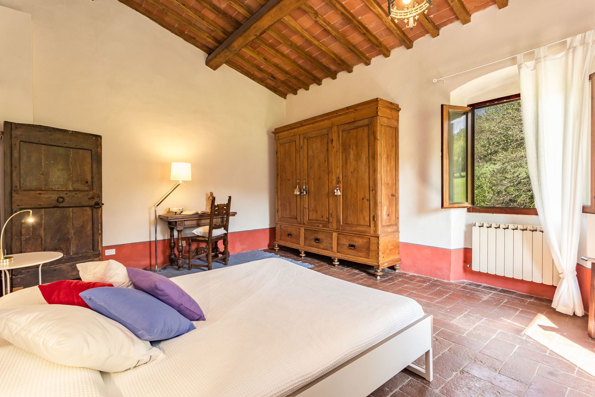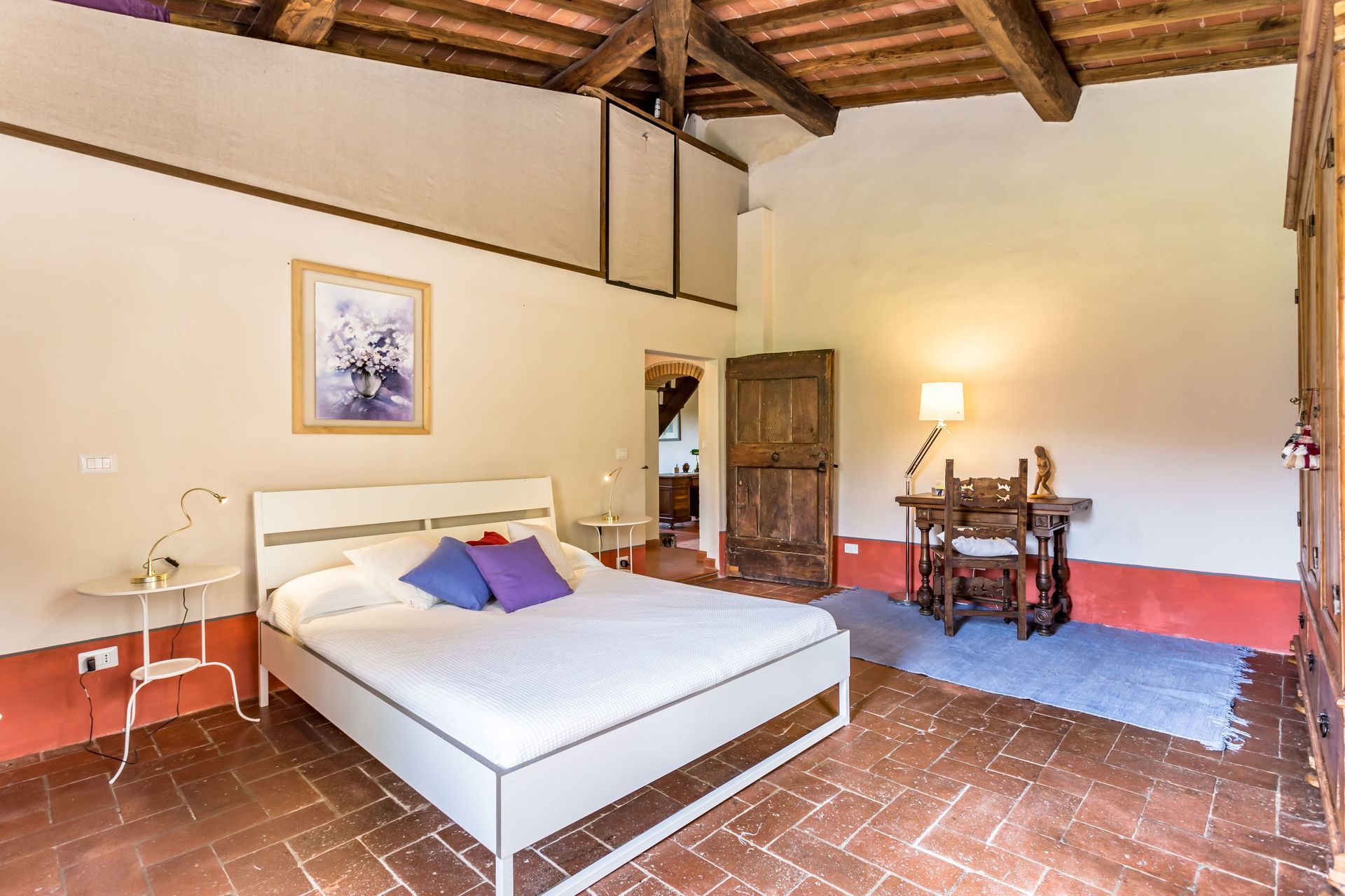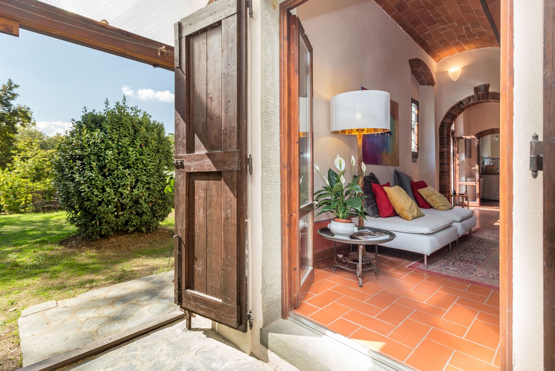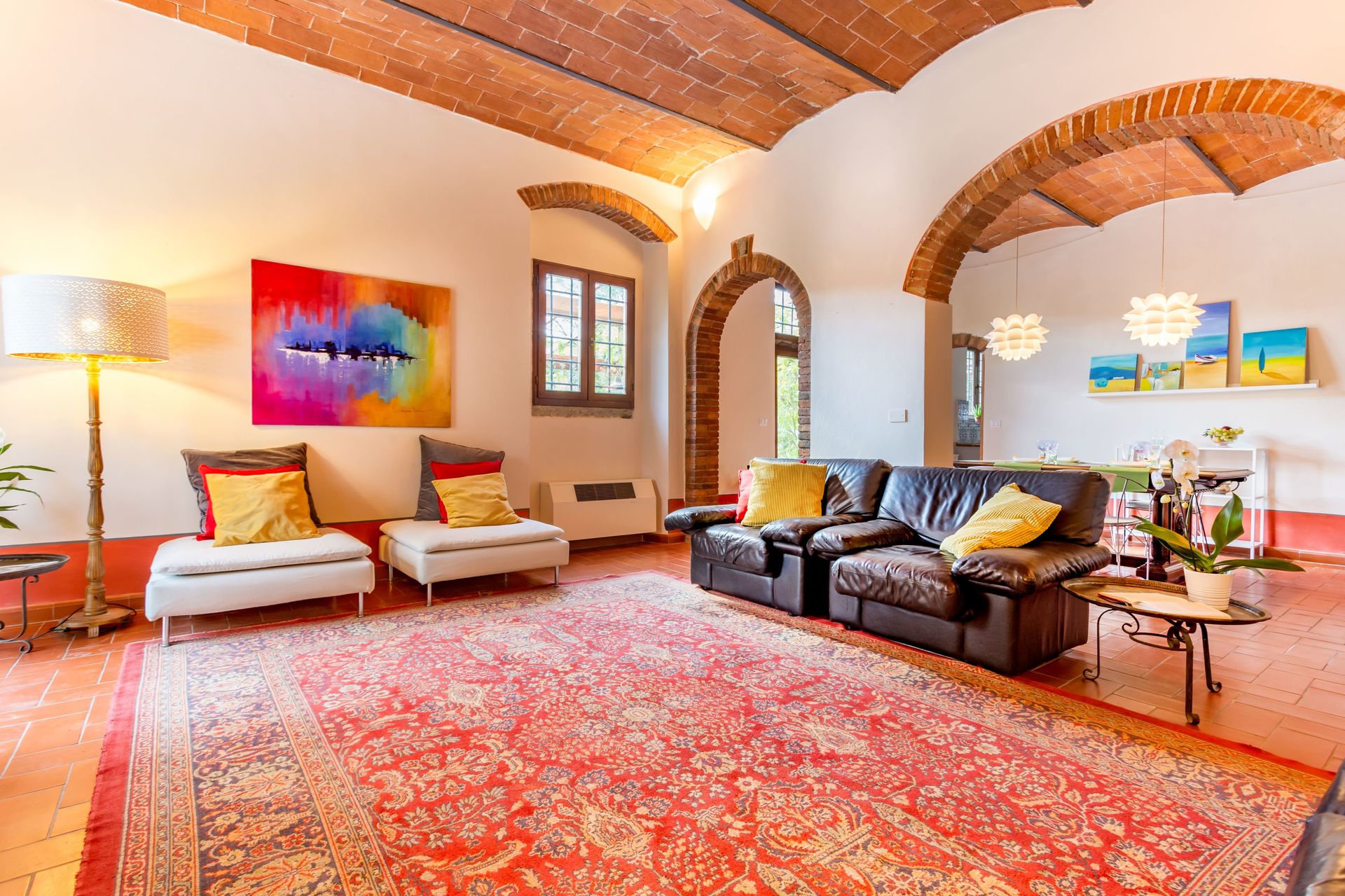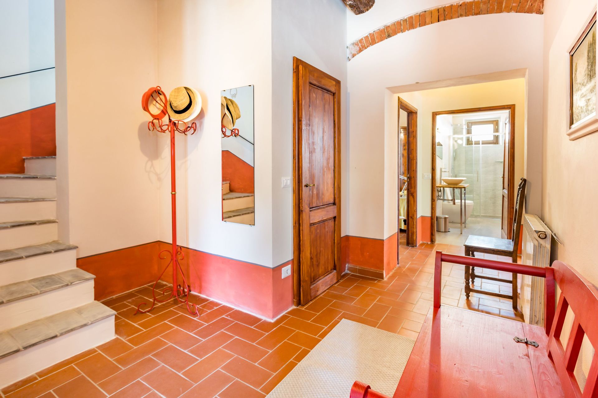 From any of the two doors, you will be enchanted by the size and beauty of this house. The interiors are original with red bricks archways and tall ceilings. Right between the two entrances a large and bright "double" kitchen: the classic one with all the kitchen furniture, fridge and stoves/oven and the old one with a wood oven and a marble top table for your home cook preparations.