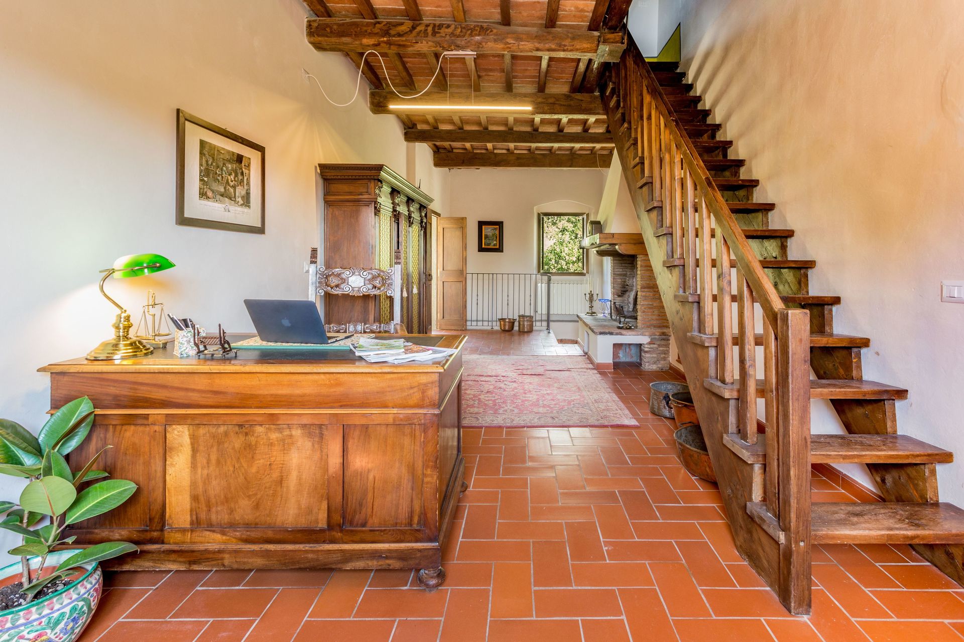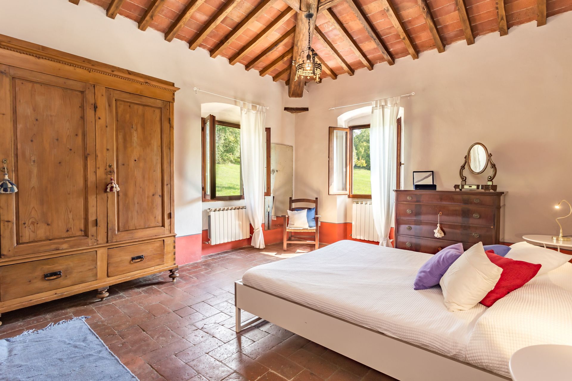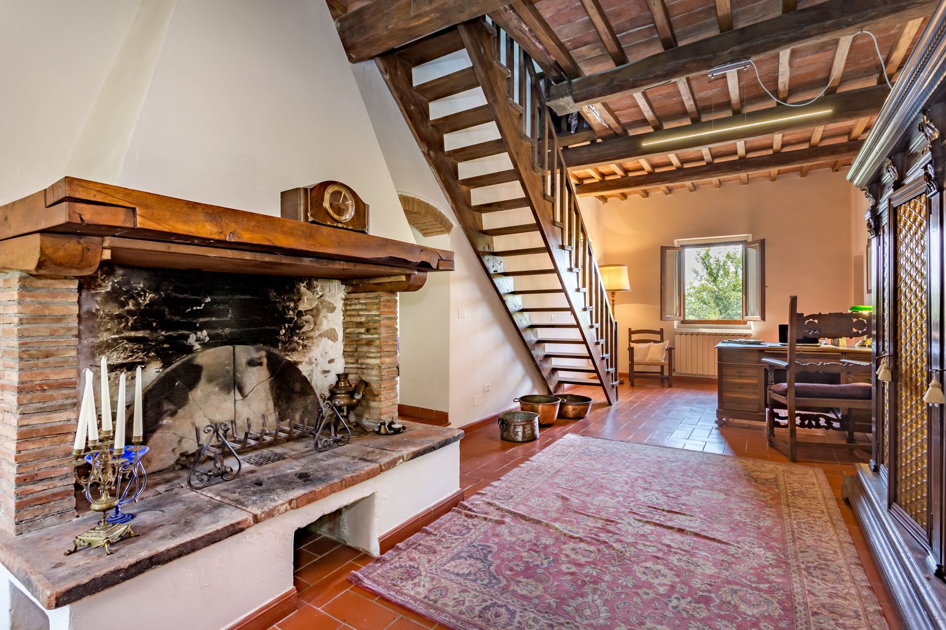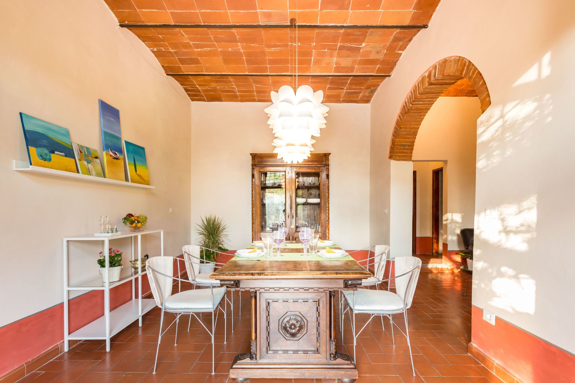 From any of the two doors, you will be enchanted by the size and beauty of this house. The interiors are original with red bricks archways and tall ceilings. Right between the two entrances a large and bright "double" kitchen: the classic one with all the kitchen furniture, fridge and stoves/oven and the old one with a wood oven and a marble top table for your home cook preparations.