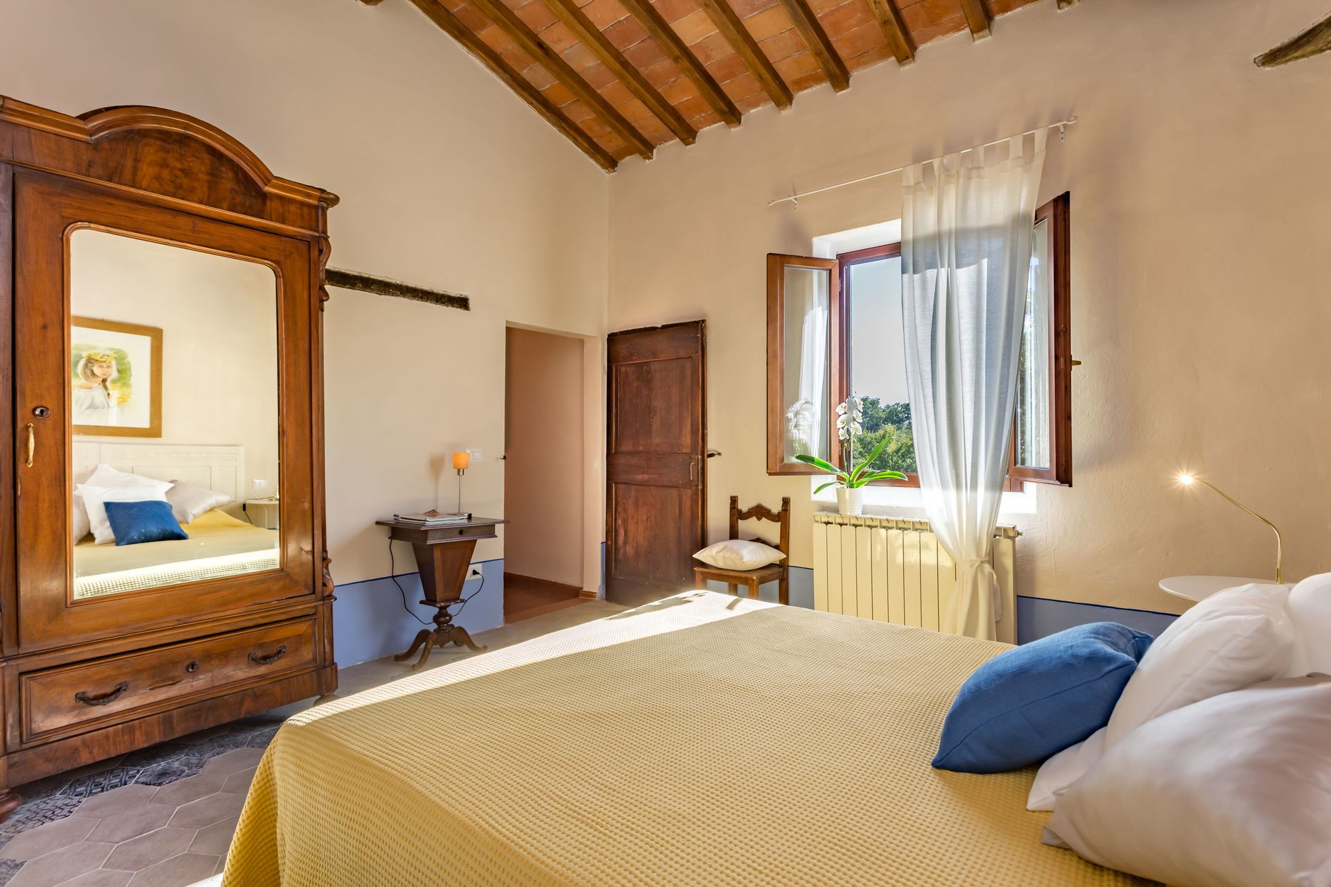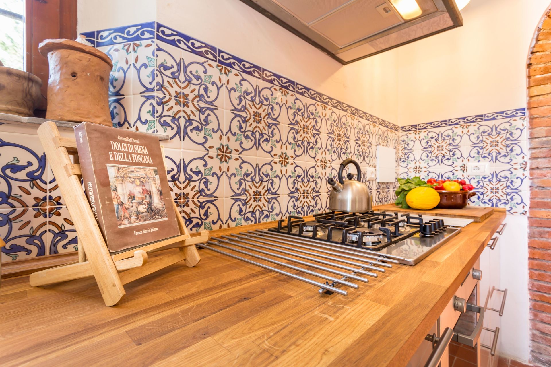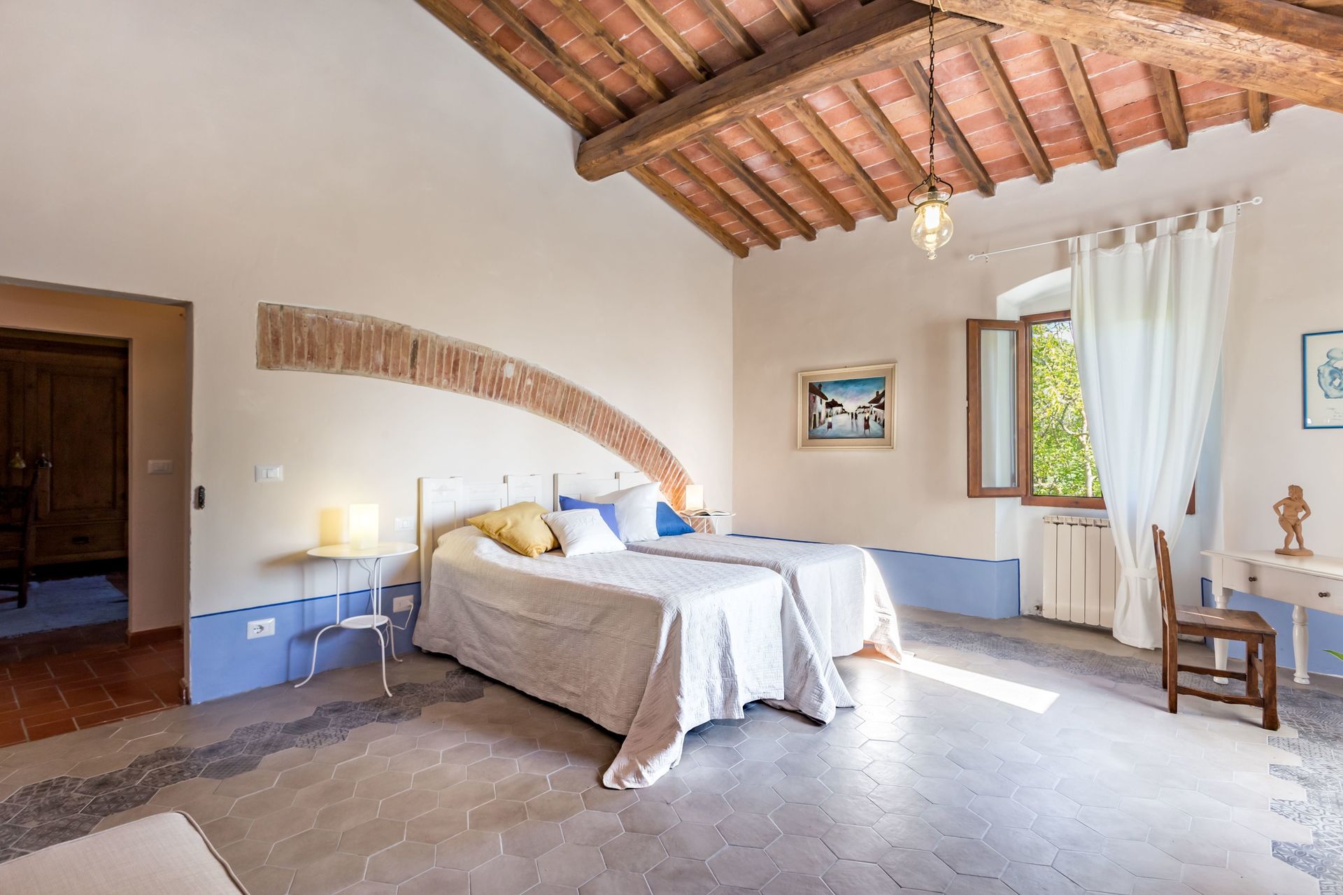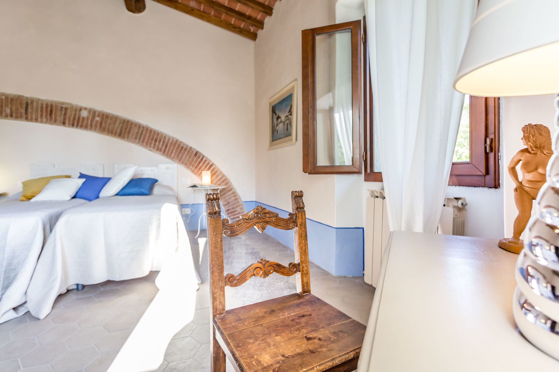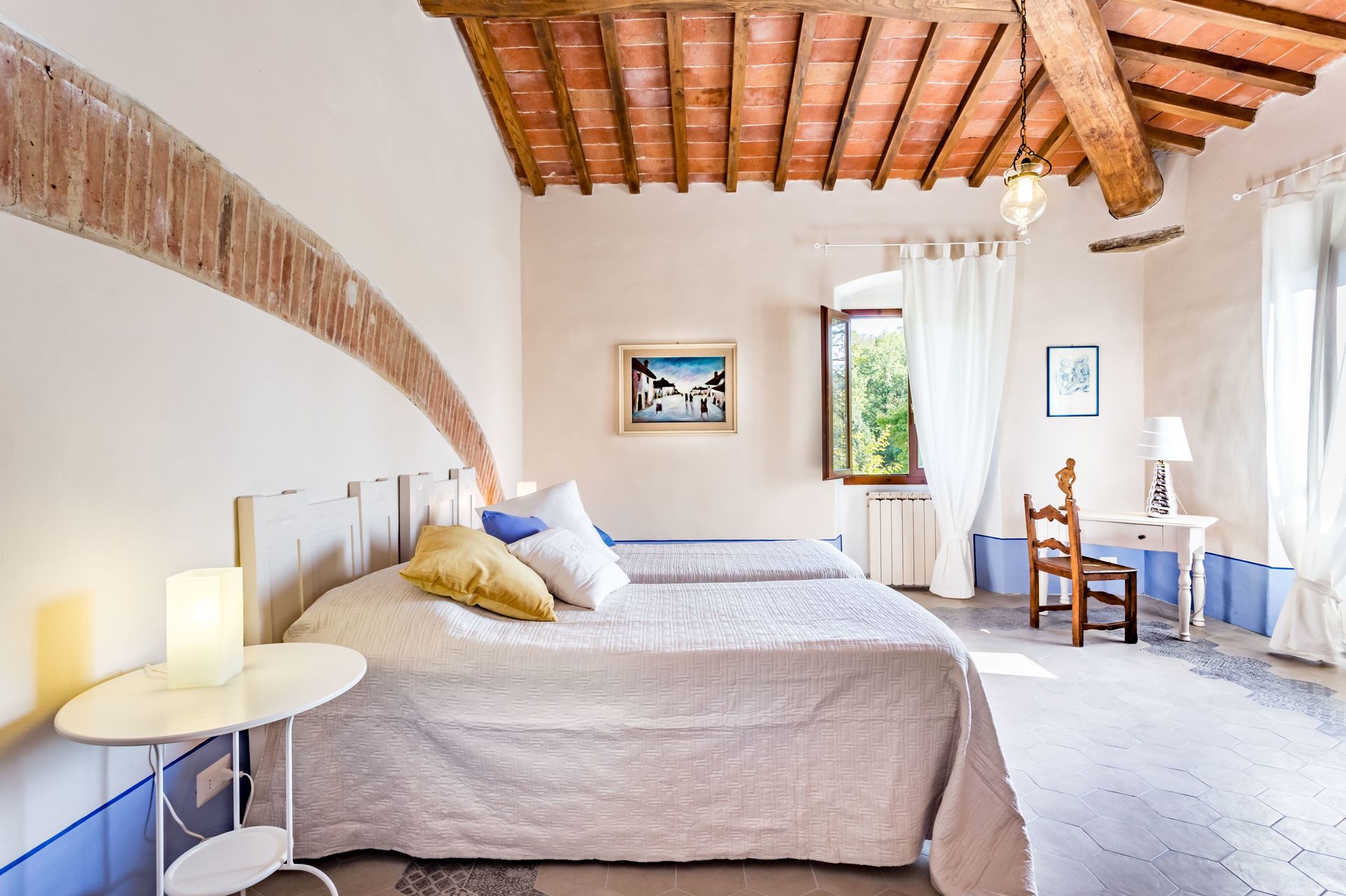 From any of the two doors, you will be enchanted by the size and beauty of this house. The interiors are original with red bricks archways and tall ceilings. Right between the two entrances a large and bright "double" kitchen: the classic one with all the kitchen furniture, fridge and stoves/oven and the old one with a wood oven and a marble top table for your home cook preparations.