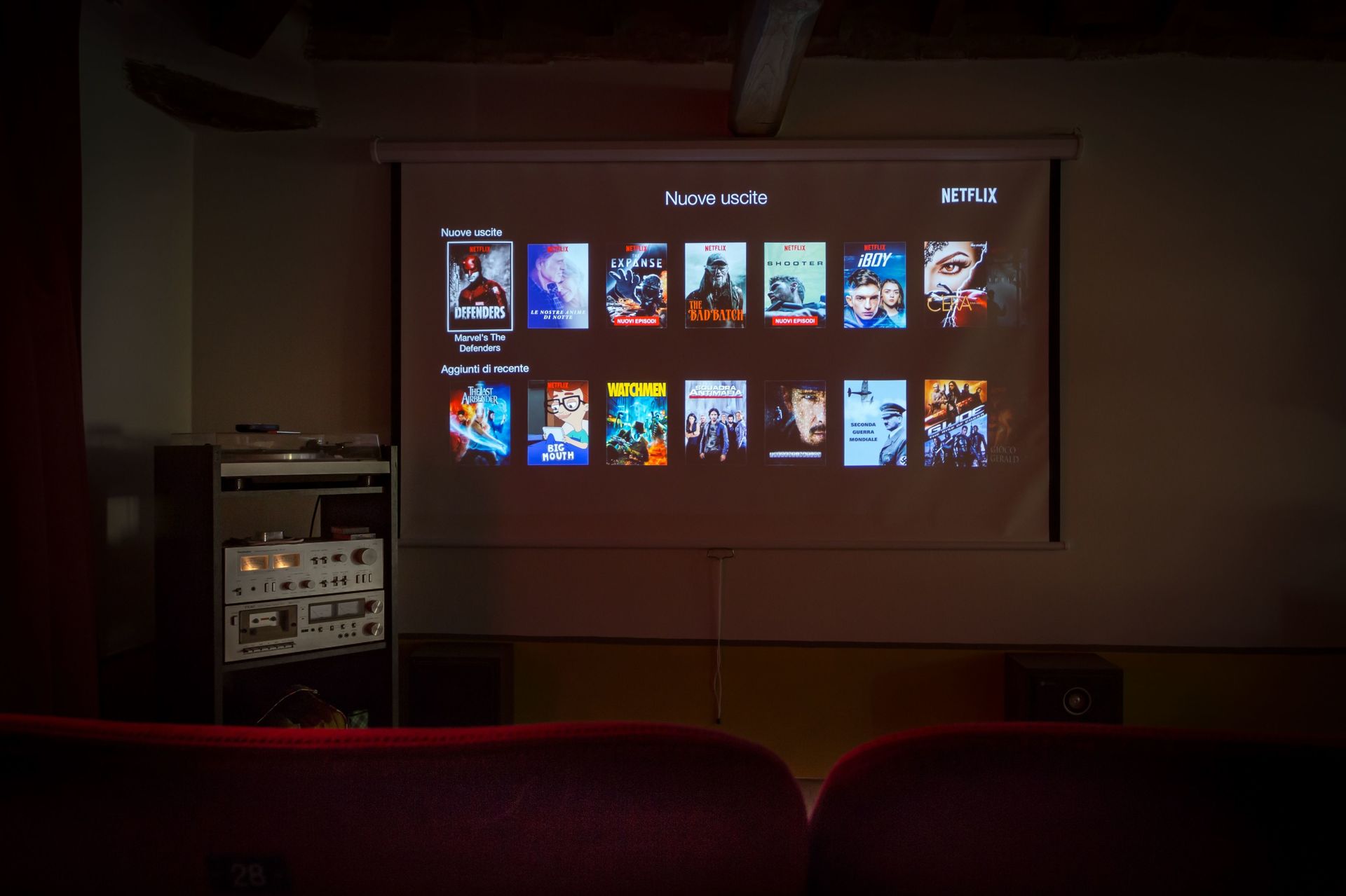 En la parte superior, en el ático, cine en casa con sillas de cine reales y área de lectura.