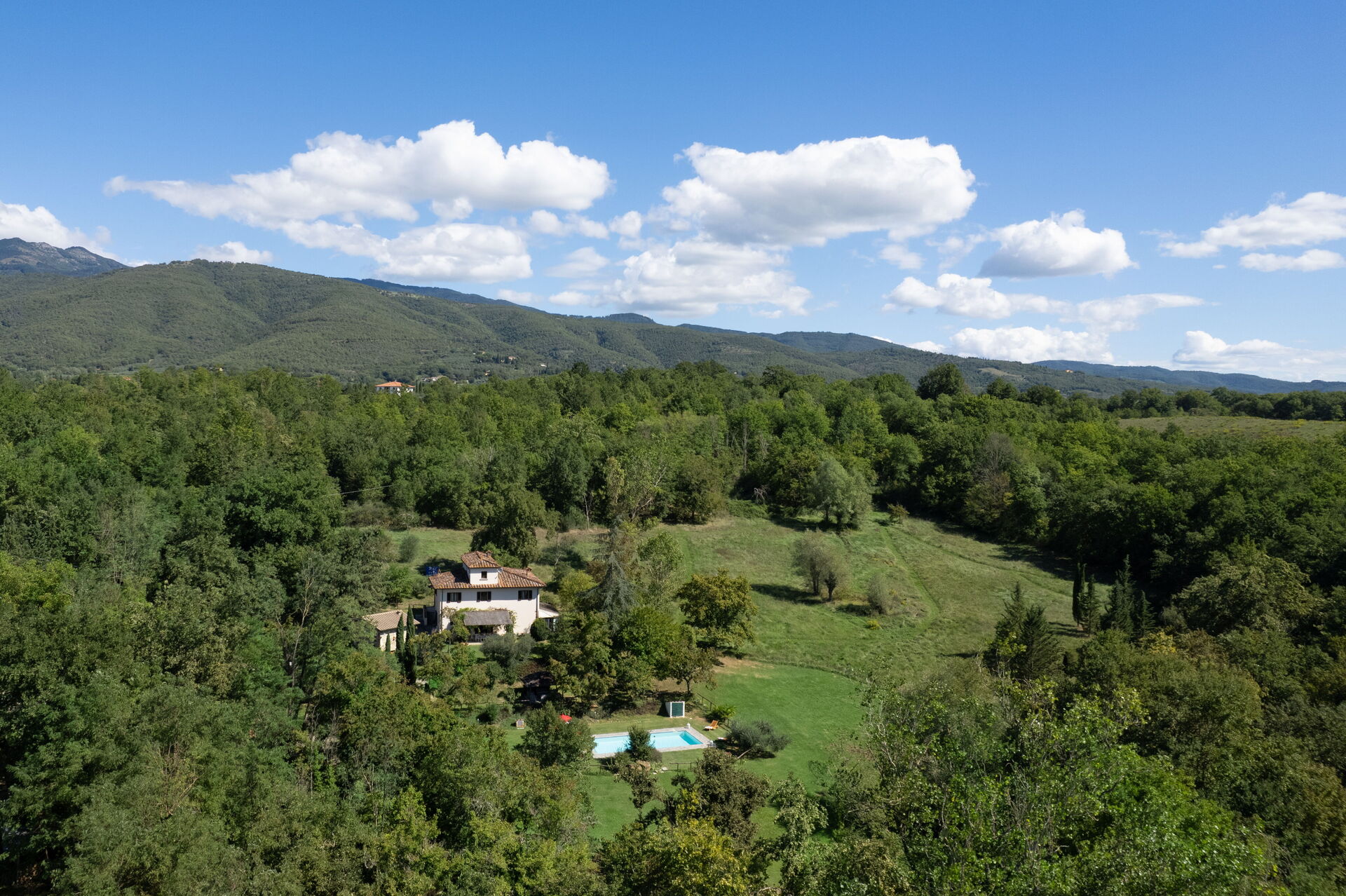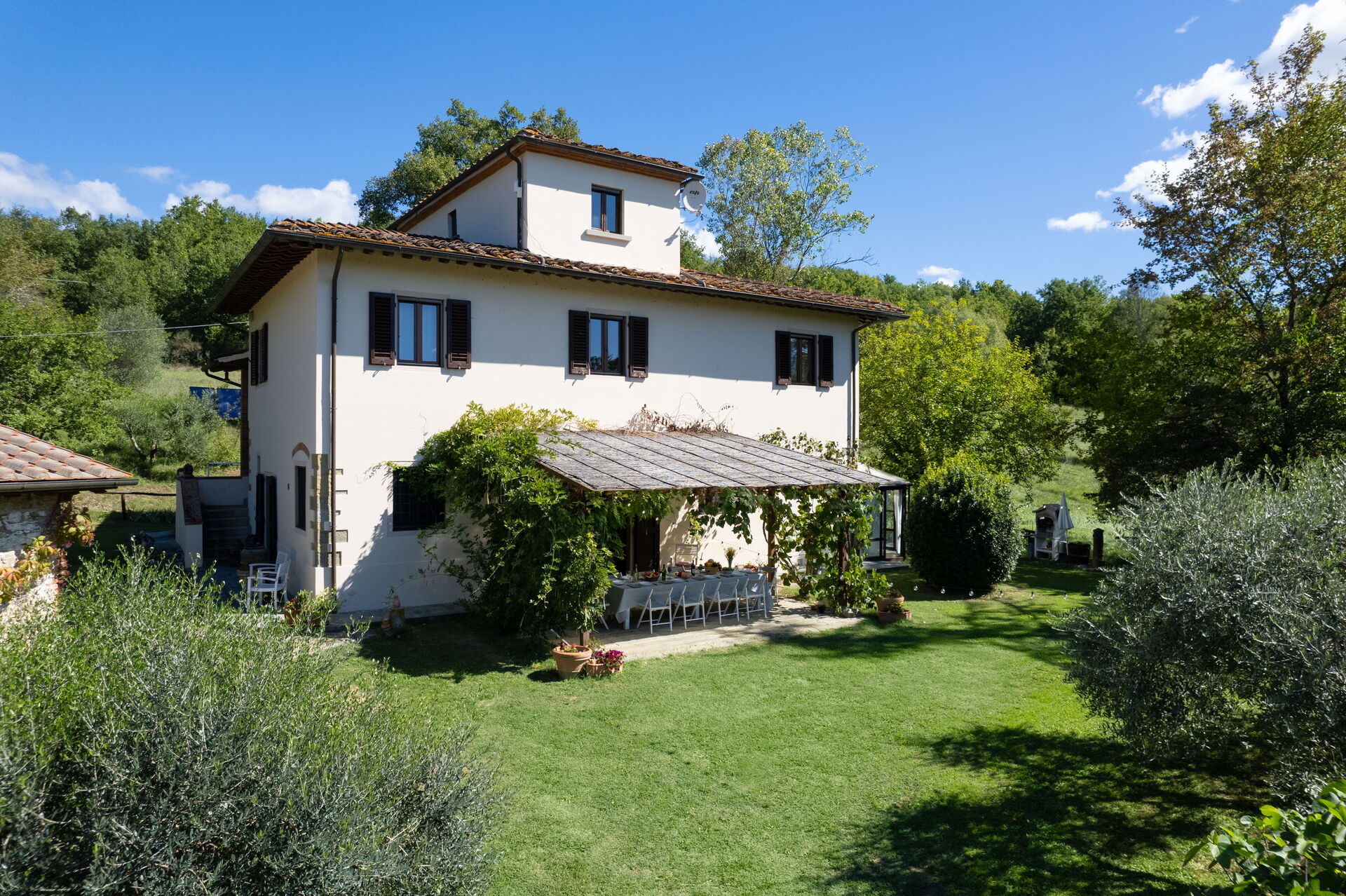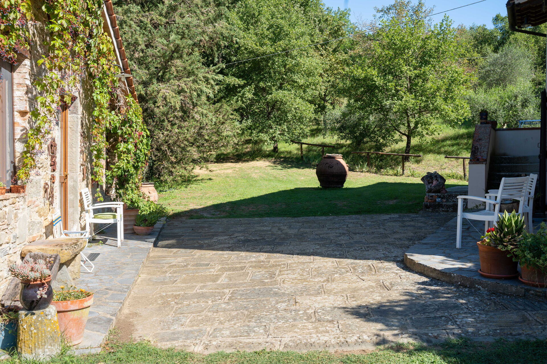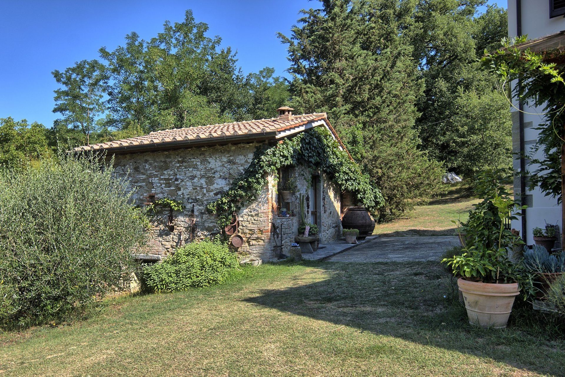La villa se encuentra en una pequeña colina, con jardín y campos alrededor. Junto a ella, una pequeña dependencia con dormitorio doble, cocina y baño con ducha.