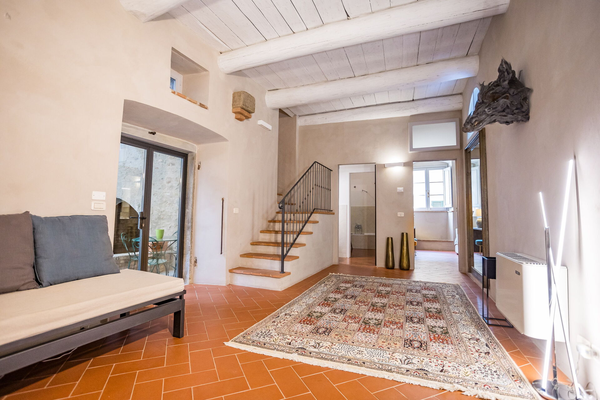 Salón: sofa, WIFI internet, aire acondicionado, acceso a la terraza.