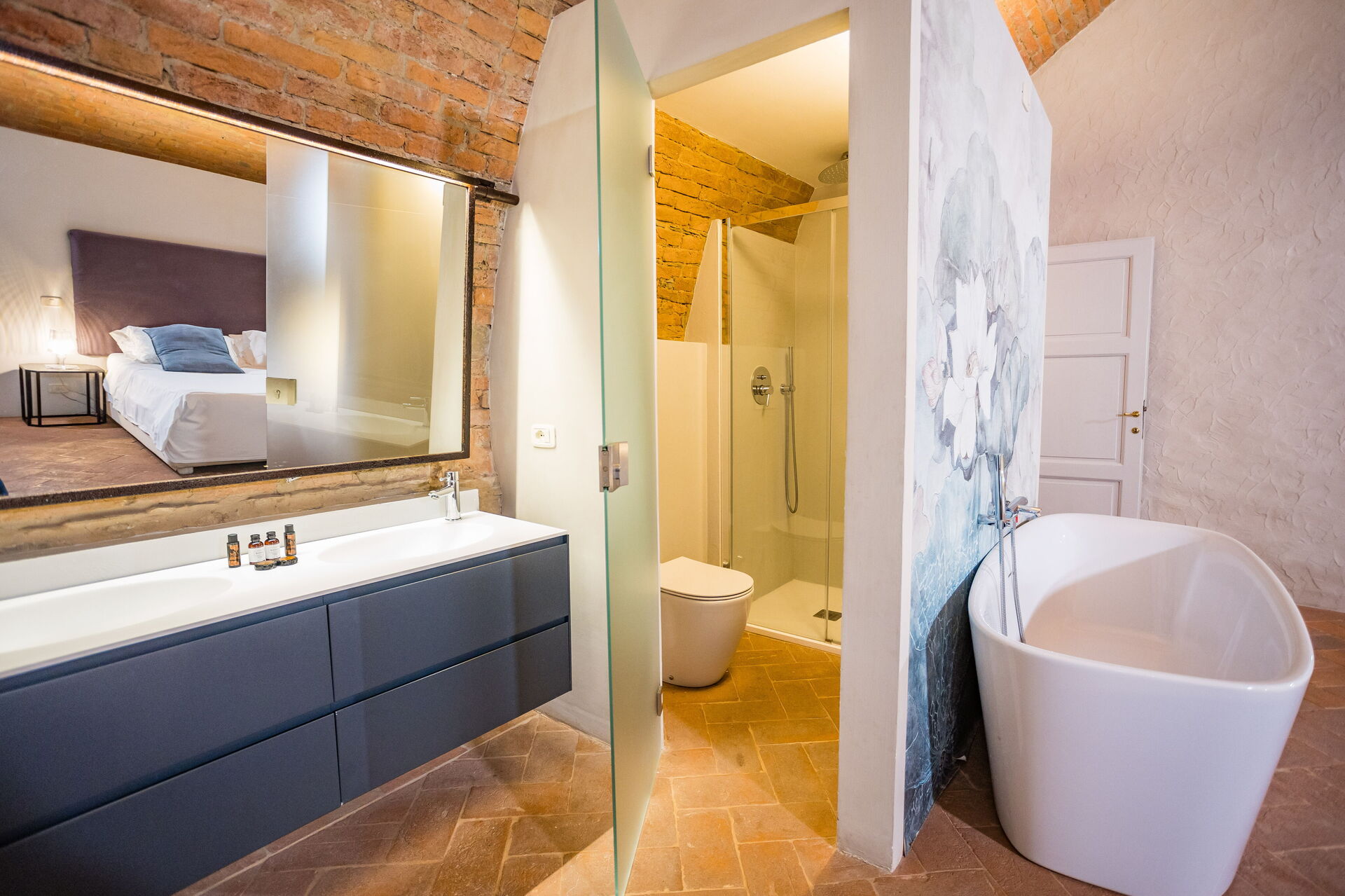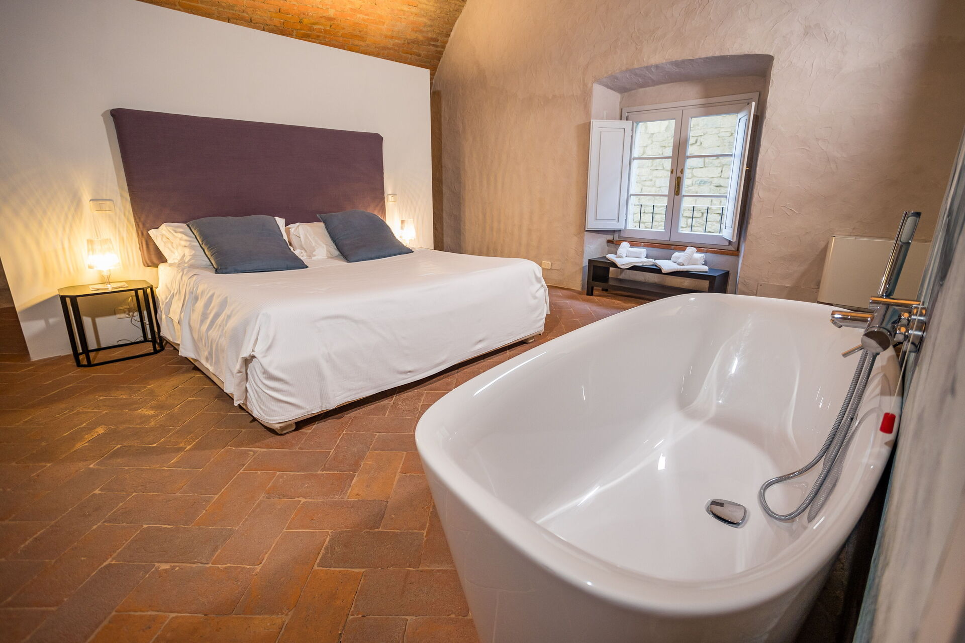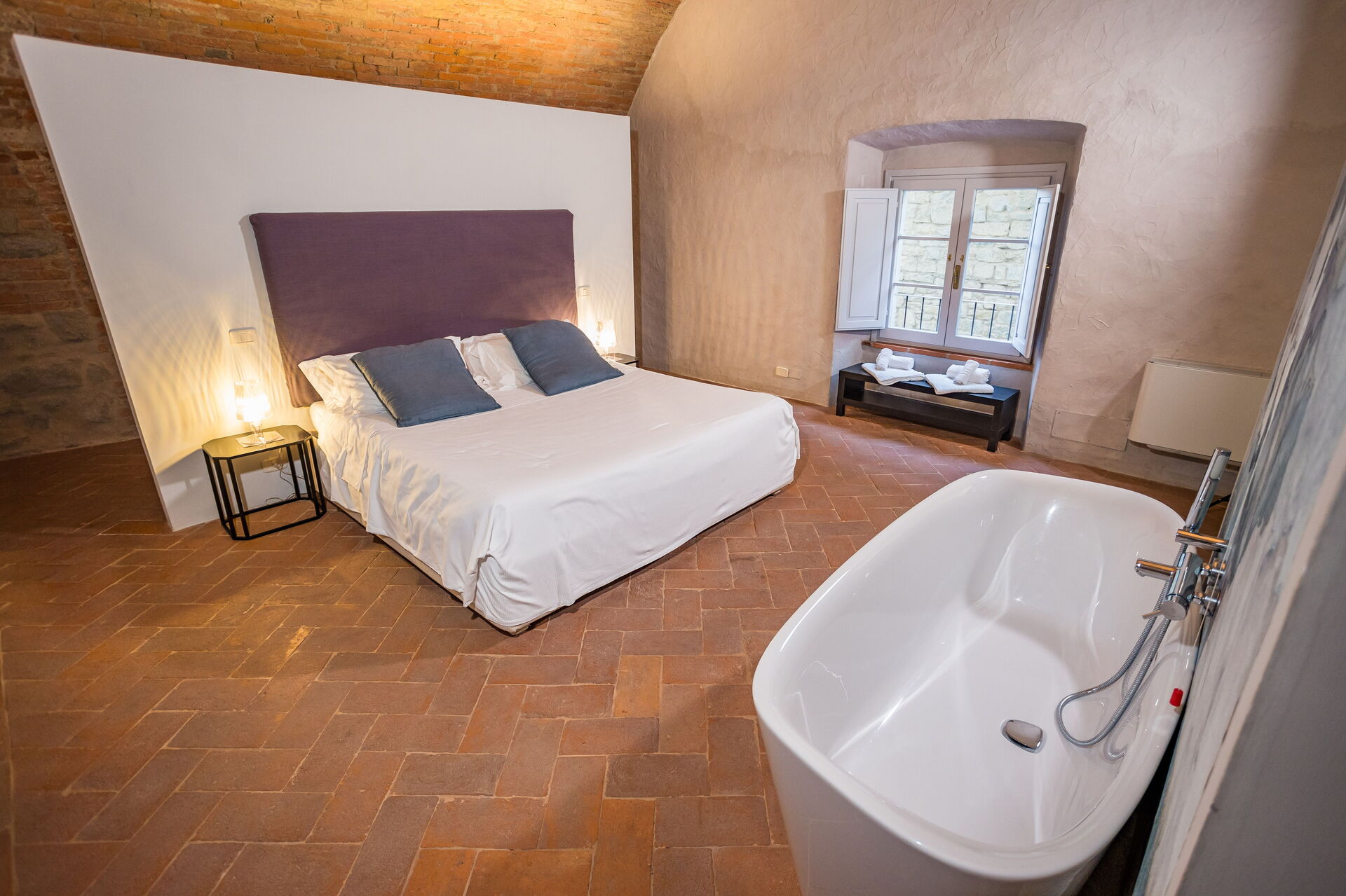 Habitación con baño: cama de matrimonio, WIFI internet, aire acondicionado, lavabo, baño, bidé, bañera, ducha, secador, baño sin ventana.