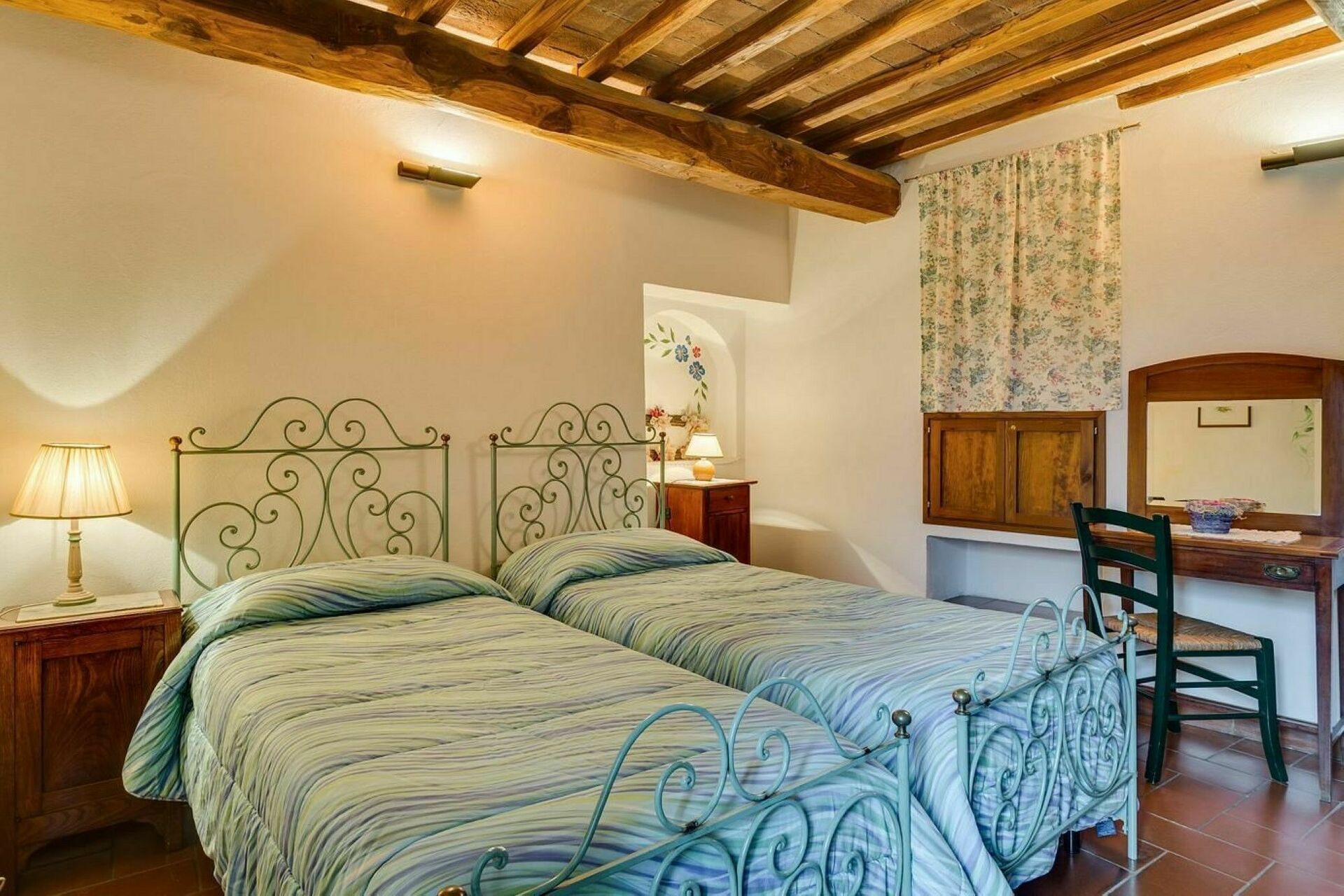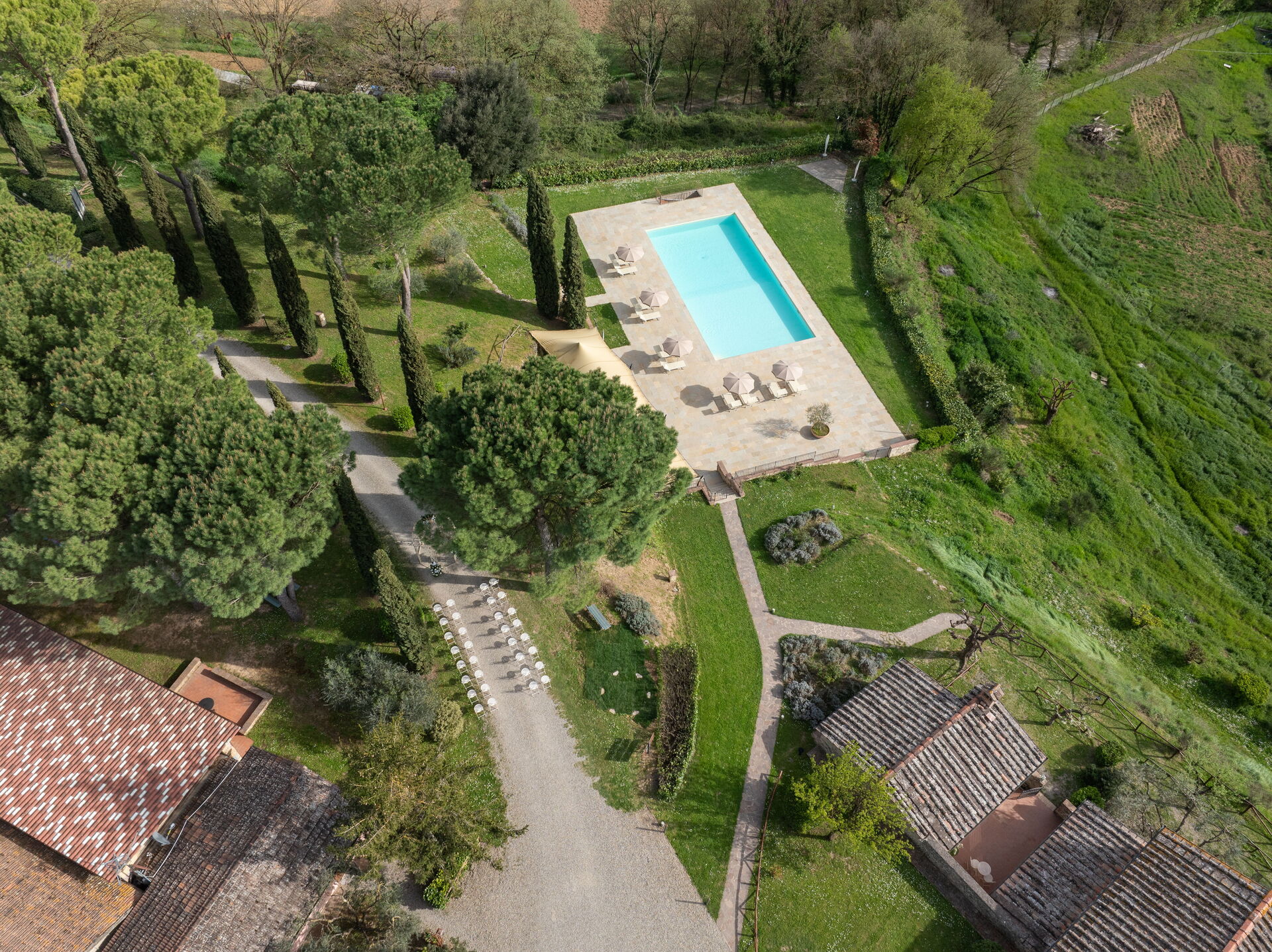 En los terrenos hay una piscina privada para disfrutar y descansar en los días cercanos a la ceremonia de la boda, una zona verde ideal para jugar, un jardín de estilo italiano donde se pueden celebrar ceremonias de boda y ceremonias simbólicas, una encantadora terraza de baldosas donde se pueden colocar mesas para bodas y cenas al aire libre, y un montón de pequeños rincones con mesas y asientos donde sus amigos y familiares pueden relajarse y descansar durante su estancia en la Toscana. La ventaja de una boda en Italia es que todo el mundo puede disfrutar de unas vacaciones.