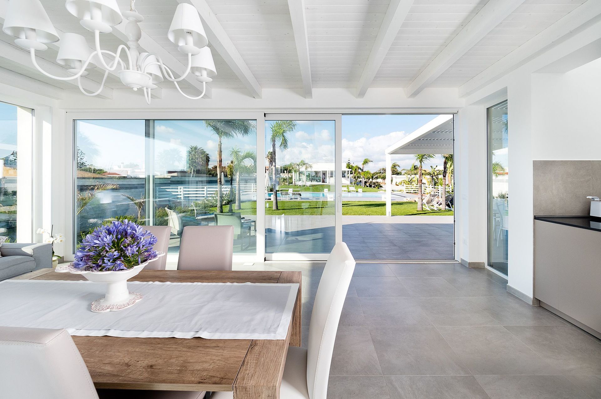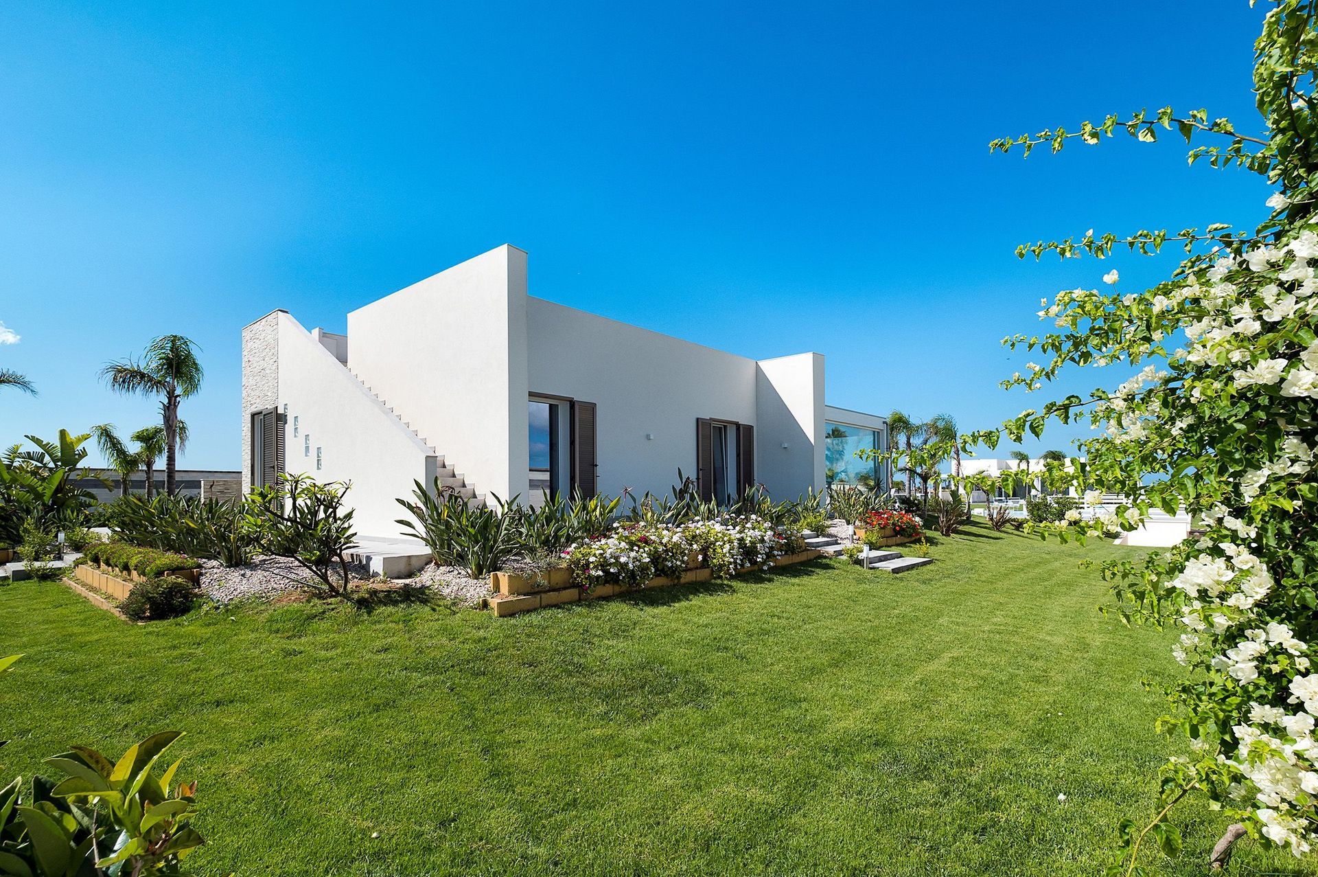 Spread over two non-connecting floors, Diantha is the largest apartment that includes on the ground floor a living-dining room with kitchen, three bedrooms, two bathrooms and a half-bath, and on the lower floor a further living-dining room with kitchen, two bedrooms and two bathrooms. Whilst Gaura includes a living-dining room with kitchen, three double bedrooms, two bathrooms, one with tub, one with shower, and a half-bath. Furnished with taste, these comfortable apartments come with private terrace, parking space, air conditioning, Wi-Fi, satellite TV, dishwasher and washing machine. The location of Evanthe Garden is also ideal for exploring the charming surrounding area. The salt pans, Trapani, Erice, Segesta, San Vito Lo Capo and the Zingaro nature reserve are all a few kilometres away.