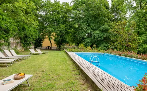 La piscina elevada mide 12 x 4 metros con una profundidad de 140 centímetros y está disponible del 15 de mayo al 15 de octubre; el propietario o su jardinero se encarga del mantenimiento. Una ducha exterior se encuentra en las proximidades del área de la piscina. Una terraza bien equipada sirve como espacio ideal para comer al aire libre y relajarse, amueblada con mobiliario de jardín. Hay un barbecue disponible para preparar cenas al aire libre durante las noches cálidas. Los amplios terrenos naturales abarcan 5.000 metros cuadrados de tierra vallada con céspedes, árboles y prados abiertos.