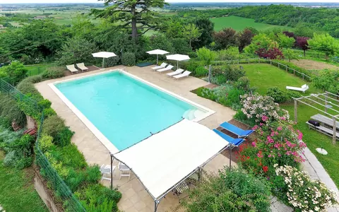 Casa de campo "Tenuta Montegrande". 4 apartamentos en la residencia. A 1.5 km del centro de San Salvatore Monferrato, en la periferia, a 11 km del centro de Alessandria, a 20 km del centro de Casale Monferrato, en una pendiente, a 80 km del mar. Comunitario: terreno 20'000 m2 (vallado) con árboles, pradera, terreno con árboles frutales, piscina vallada (12 x 6 m, 160 cm de profundidad, Disponible por temporada: 01.May.-01.Oct.). Ducha exterior, terraza-jardín, muebles de jardín, barbacoa, aparcamiento en el mismo terreno. Supermercado 1.5 km, estación de tren "Alessandria" 11 km. Campo de golf 6 km. A tener en cuenta: el propietario vive en el mismo terreno. Animales en los alrededores.