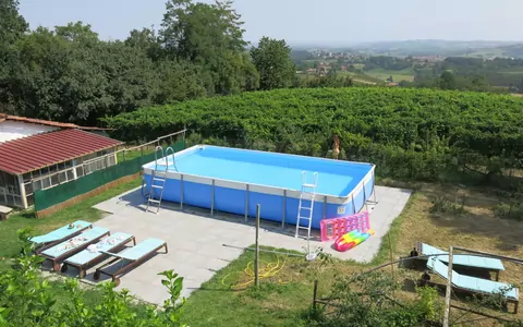 Casa de campo "Il Carroccio", individual, rodeada de prados y viñedos. 2 apartamentos en la residencia. En el barrio de Torrazzo, a 2 km del centro de San Damiano d'Asti, a 15 km del centro de Asti, a 25 km del centro de Alba, en una colina, en el campo. Comunitario: terreno 3'000 m2, jardín con plantas, pradera, Piscina elevada (10 x 5 m, 130 cm de profundidad, Disponible por temporada: 07.Jun. - 15.Sep.). Ducha/WC en zona de piscina, terraza-jardín, cenador, mantenimiento de la piscina a través del propietario/jardinero, Aparcamiento junto a la casa en el mismo terreno. Supermercado 2 km, parada autobús 2 km, estación de tren "Asti" 15 km, piscina 2 km. Campo de golf (9 hoyos) 16 km. El propietario no acepta grupos de adolescentes/jóvenes. Residencia con puertas de cierre eléctrico. Gorro de baño obligatorio.