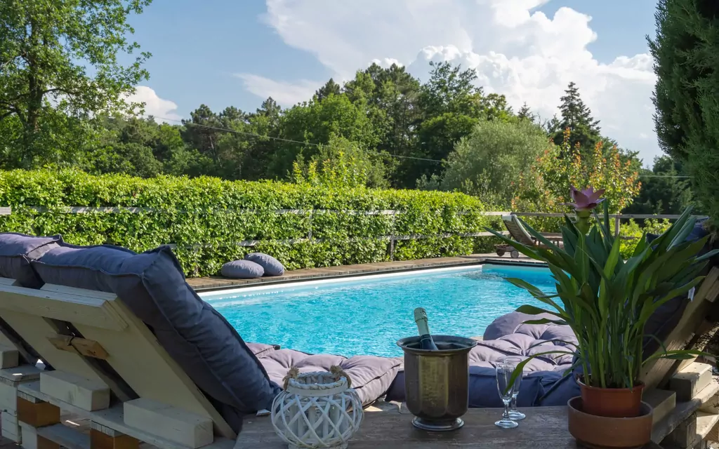 La piscina privada elevada mide 9 x 4 metros y está disponible del 1 de mayo al 30 de septiembre; cuenta con un tobogán. Una ducha exterior se encuentra en las proximidades. El jardín circundante está cuidadosamente mantenido, con céspedes verdes y un generoso dosel de árboles que ofrecen áreas sombreadas para descansar durante los días más cálidos. La finca entera está vallada, proporcionando un entorno seguro y privado.