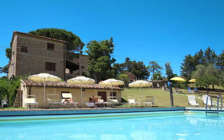 La piscina mide 4 x 9 m y está abierta del 21 de mayo al 2 de octubre. Una ducha exterior se encuentra cerca del área de la piscina. El amplio jardín, enmarcado por árboles y prados, proporciona un espacio tranquilo para relajarse y disfrutar del paisaje toscano. El aparcamiento está disponible directamente en la propiedad. Se ofrecen alquileres de bicicletas en el lugar.