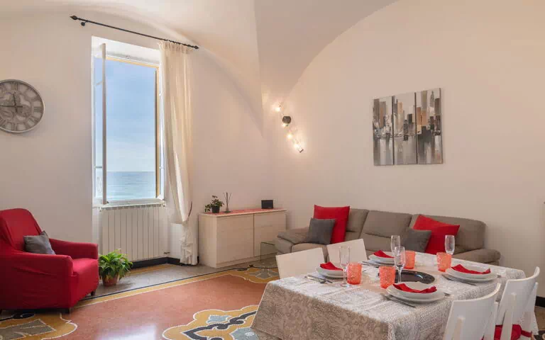 "Boggiano", apartamento de 3 estancias 90 m2 en el 1° piso. Con mobiliario moderno y de buen gusto: planta superior: (escalera empinada) salón con mesa de comedor, TV y aire acondicionado. 1 dorm. con 1 cama doble (160 cm), aire acondicionado. 1 dorm. con 2 camas-nido (2 pers. 2 x 80 cm). Pequeña cocina abierta (horno, lavavajillas, 2 placas de vitrocerámica, 2 fuegos, tostadora, hervidor de agua eléctrico, microondas, congelador, cafetera eléctrica). Baño/bidet/WC. Calefacción de gas. Suelo de piedra natural. Vista al mar. El alojamiento dispone de: lavadora, plancha, trona, cuna. Internet (Wifi, gratis). A tener en cuenta: apartamento para no fumadores. Permitido máximo 1 mascota / perro. La disponibilidad de las camas es flexible. Aunque haya más camas disponibles que la ocupación máxima, esta no se puede exceder. IT009001C2GL4CN7S9