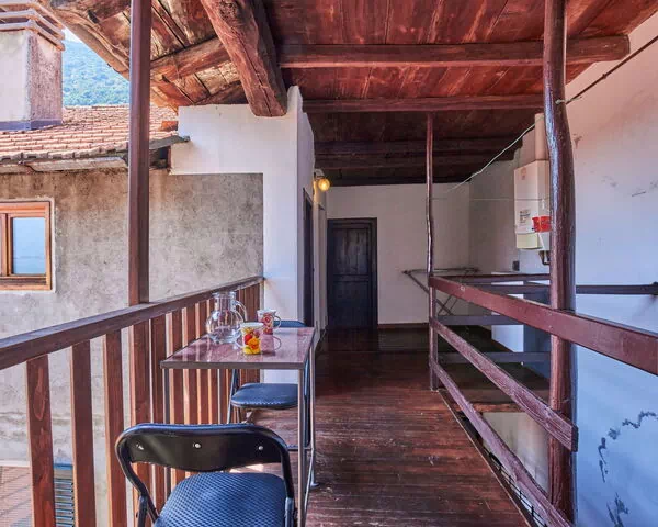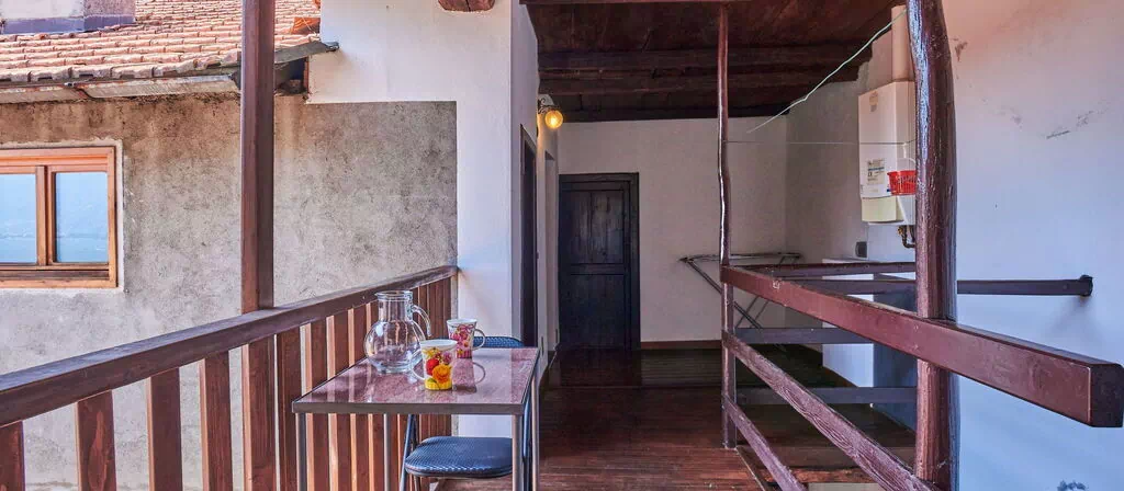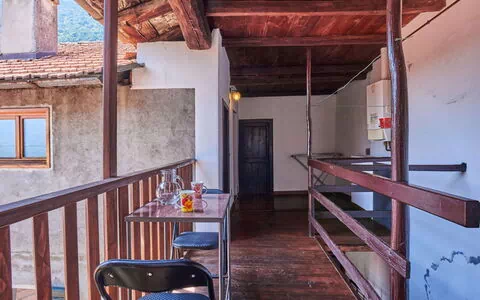 Este apartamento de vacaciones tiene una superficie de 55 m² distribuida en una planta, con capacidad para 4 huéspedes, 1 dormitorio y 1 baño. La zona de estar y dormir cuenta con 1 cama y una chimenea de hogar abierto de carácter decorativo, desde la cual se accede directamente al balcón. El dormitorio está amueblado con 1 cama individual y 1 cama doble, y también dispone de acceso al balcón. La cocina abierta se integra con una mesa y rincón de comedor. El baño incluye bañera y WC. El apartamento presenta suelos de piedra natural en toda su extensión. Un pequeño balcón amueblado con mobiliario de exterior completa la distribución.