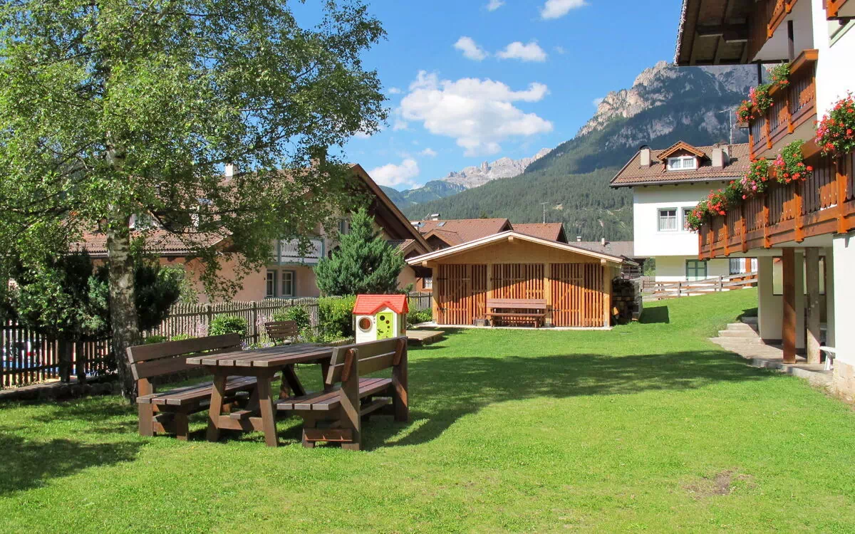 El jardín compartido está amueblado con cómodo mobiliario de jardín, creando un entorno tranquilo para el descanso al aire libre, desayunos relajados o simplemente disfrutar del aire fresco de la montaña y las vistas panorámicas de la pendiente. Los terrenos bien mantenidos ofrecen un refugio tranquilo tras un día explorando los Dolomitas; la posición soleada de la propiedad garantiza que los espacios exteriores sean luminosos e acogedores durante todas las estaciones.