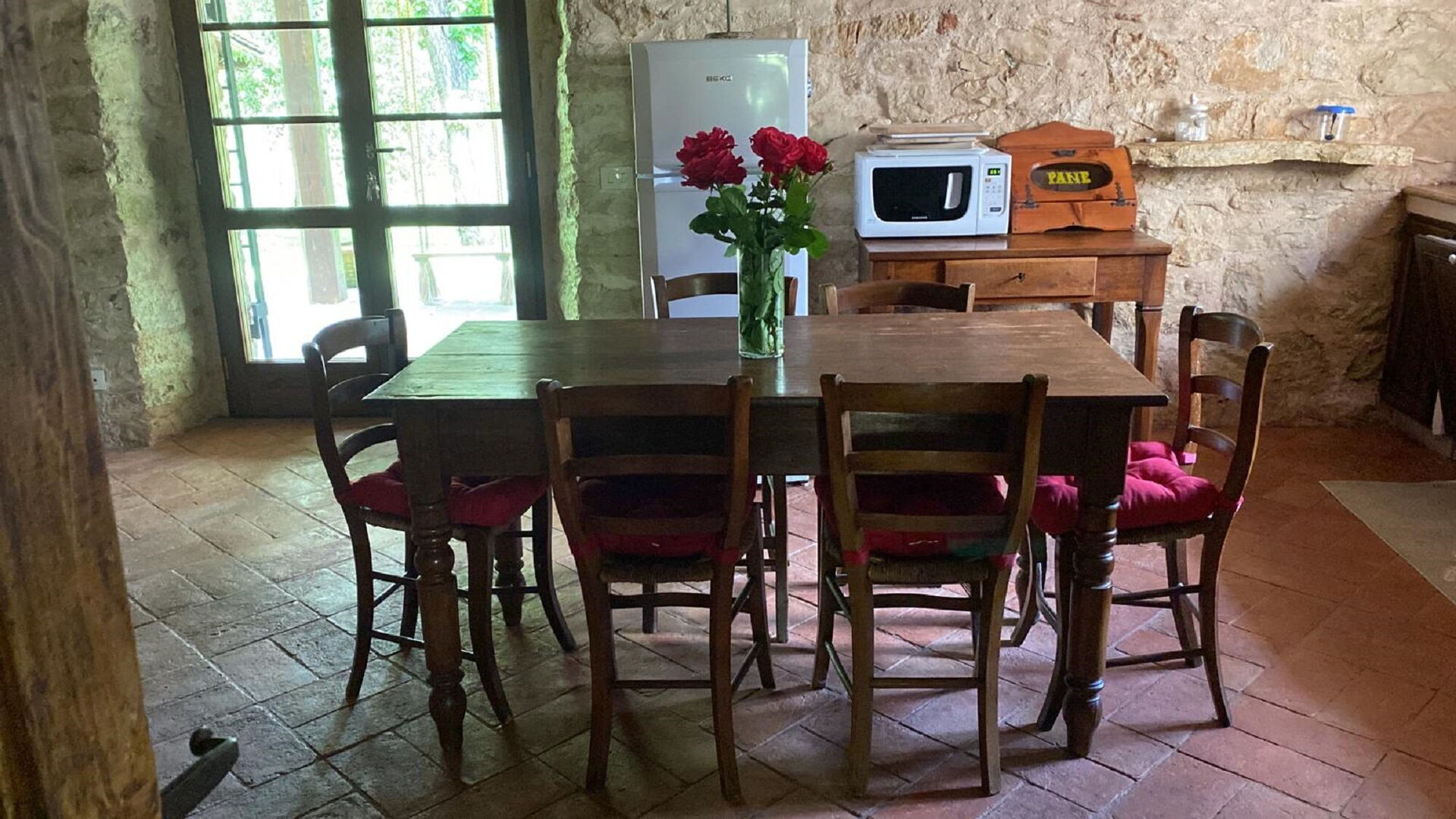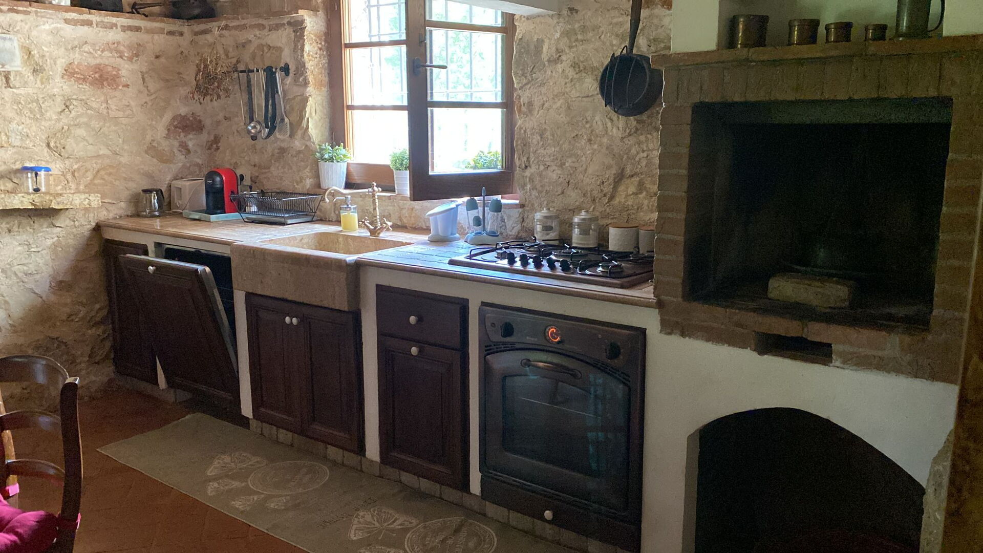 Cocina (24 m2): cocina bien equipada, mesa de comedor, lavavajillas, frigorífico, congelador, microondas, cocina de gas, estufa de leña, horno, tostadora, máquina de café italiana, WIFI internet, mosquitero, estéreo hifi, acceso al jardín, acceso a la terraza.