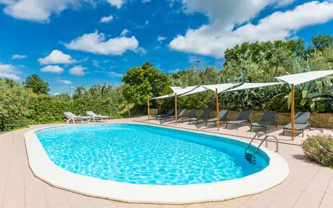 La villa "Tegliaia" ocupa 155 metros cuadrados distribuidos en 2 plantas y aloja a un máximo de 10 huéspedes en 5 dormitorios y 5 baños. La planta baja concentra la mayor parte del espacio habitable, con una sala de estar y comedor que funciona como centro de la vivienda, equipada con chimenea de hogar abierto y cocina abierta completamente equipada con horno, lavavajillas, tostadora, hervidor, microondas y congelador. Una veranda se abre directamente desde este espacio. En la planta baja se encuentran 4 de los 5 dormitorios, cada uno con aire acondicionado individual. El dormitorio principal es una habitación doble con baño en suite que dispone de bañera, bidé e inodoro. El segundo dormitorio contiene 2 camas individuales, mientras que el tercero es otra habitación doble. El cuarto dormitorio de esta planta también cuenta con 2 camas individuales y acceso a un baño con ducha de hidromasaje, bidé e inodoro. Dos baños adicionales con ducha, bidé e inodoro se localizan en la planta baja. En la primera planta, el quinto dormitorio es una habitación doble con baño en suite con ducha, bidé e inodoro, y goza de vistas panorámicas del paisaje circundante, complementadas por una terraza privada.