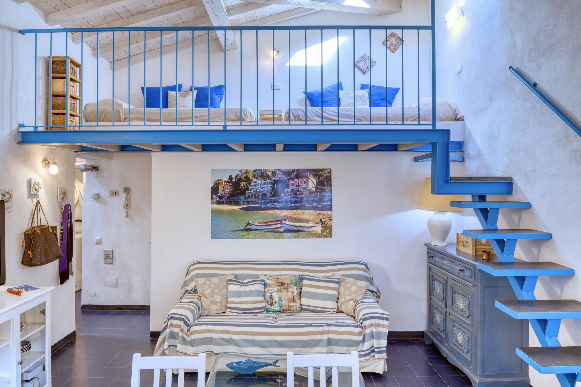 El apartamento tiene capacidad para 3 personas, con un dormitorio doble y dos camas individuales en la sala de estar, en el entrepiso.