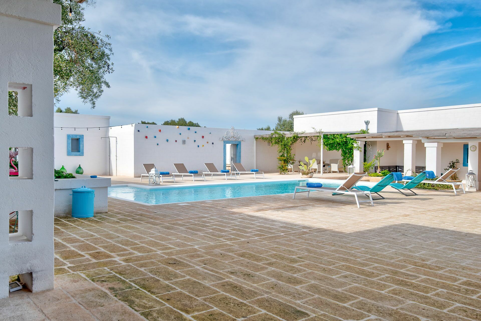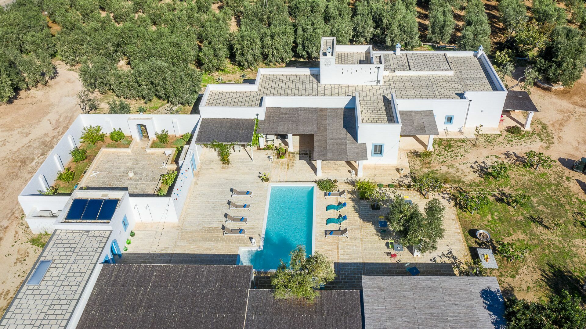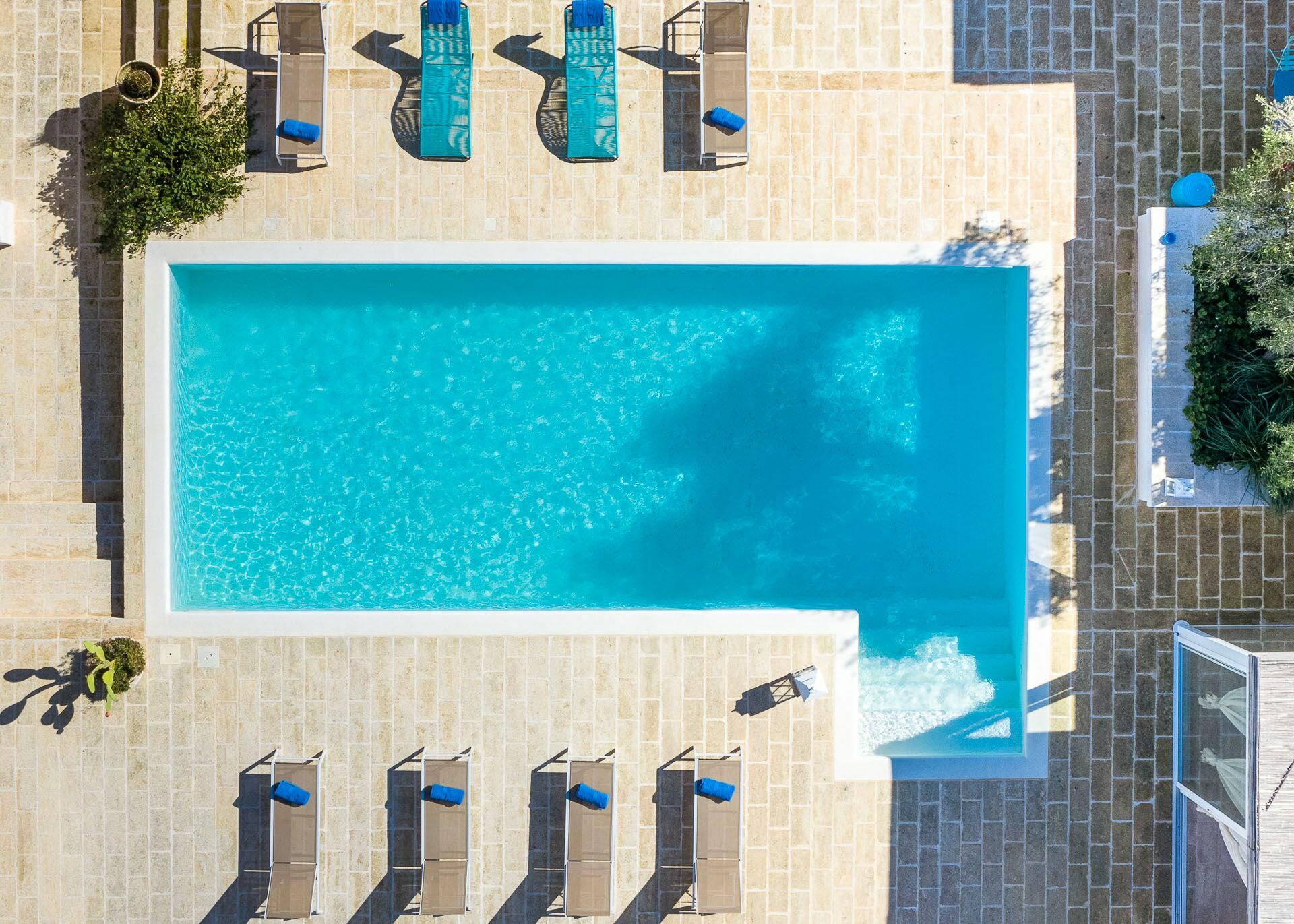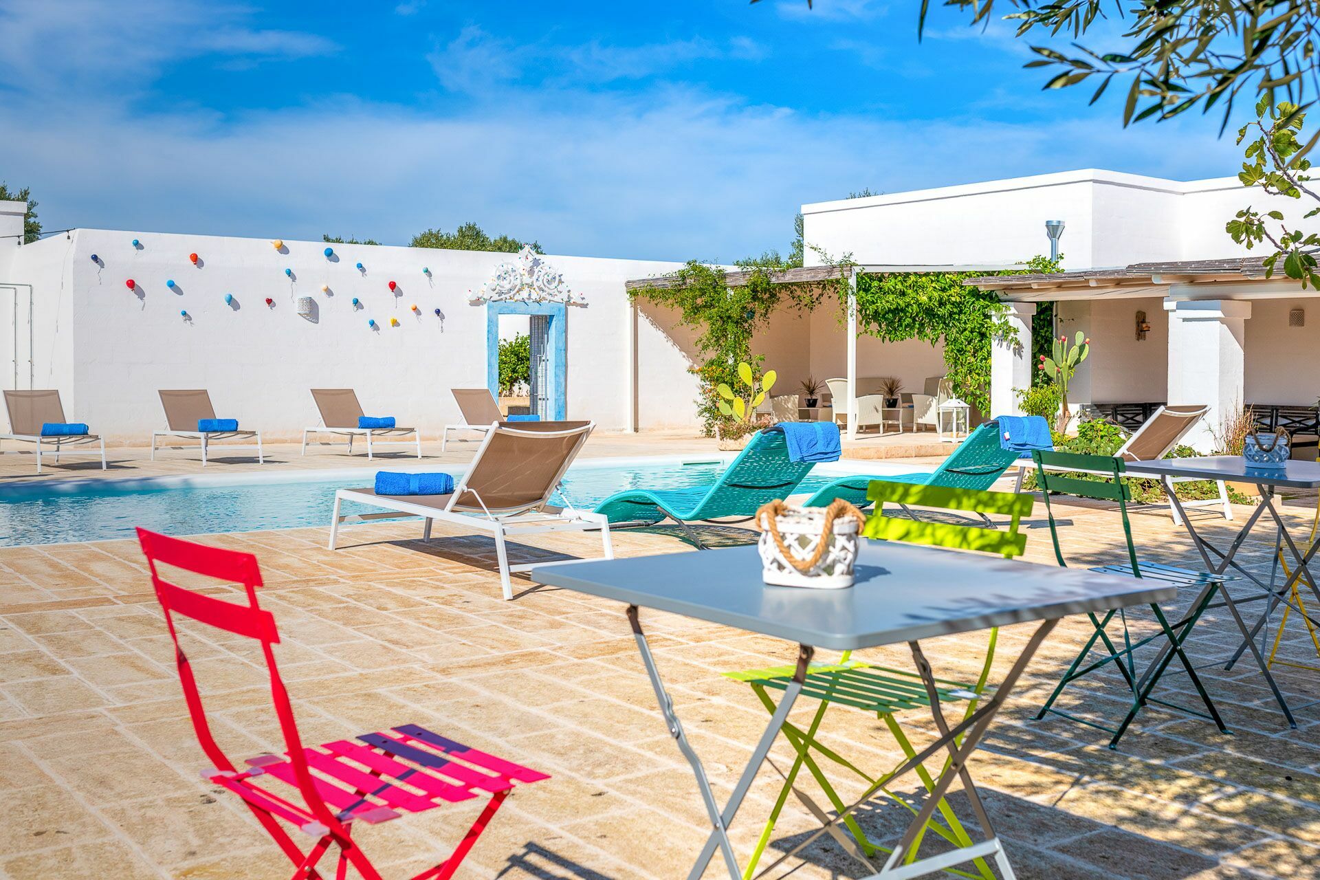 The swimming pool with skimmer, for the exclusive use of guests, measures 10m x 4m with a depth of 1.50m and access via Roman steps. On the sides of the pool, lying on the pavement with typical local stones, there are 10 sun loungers.