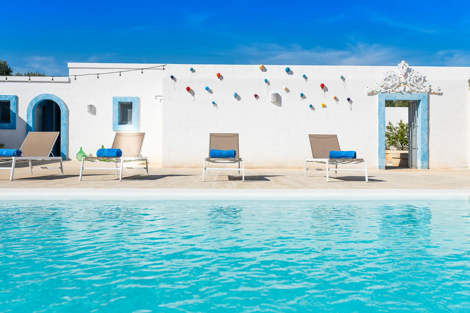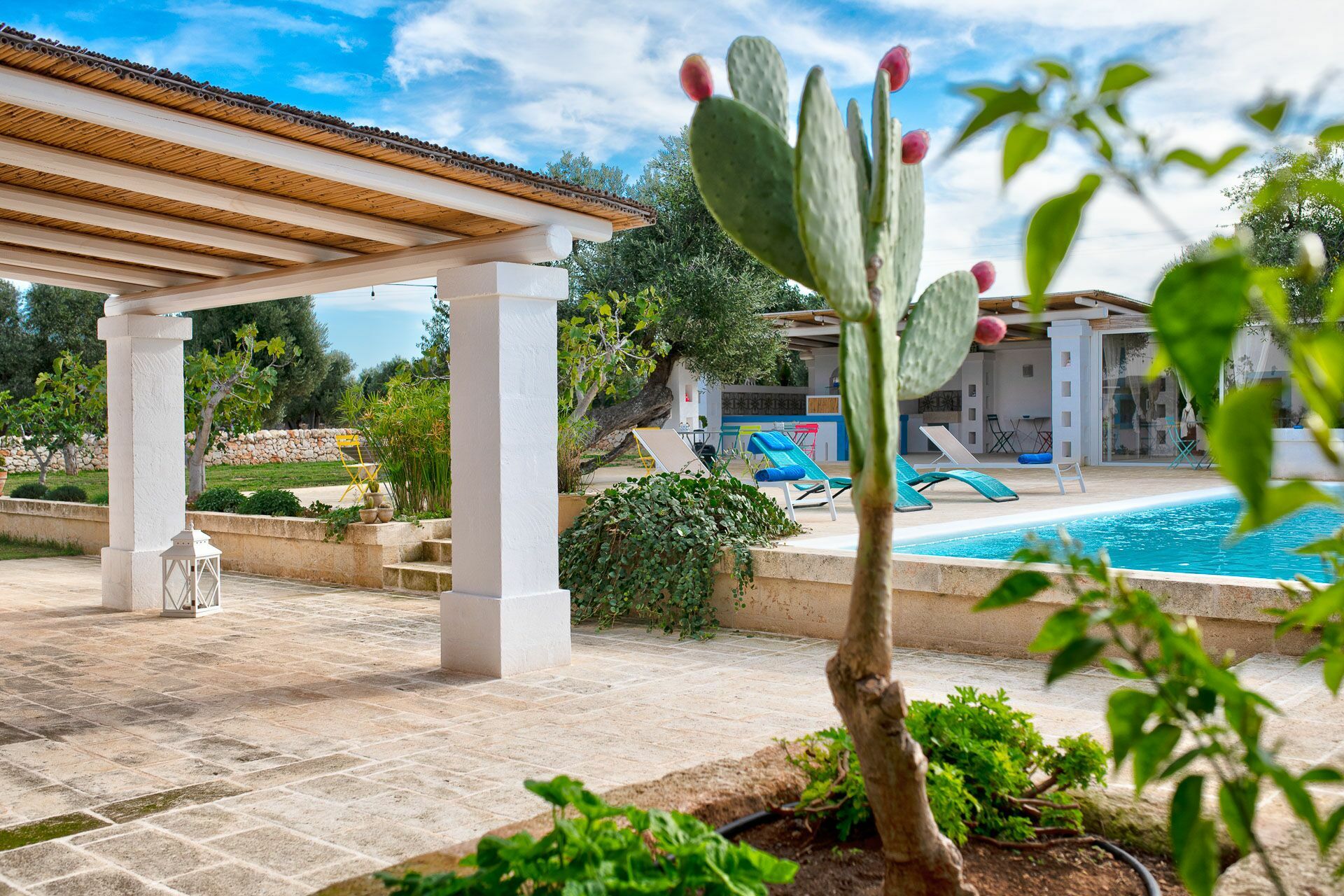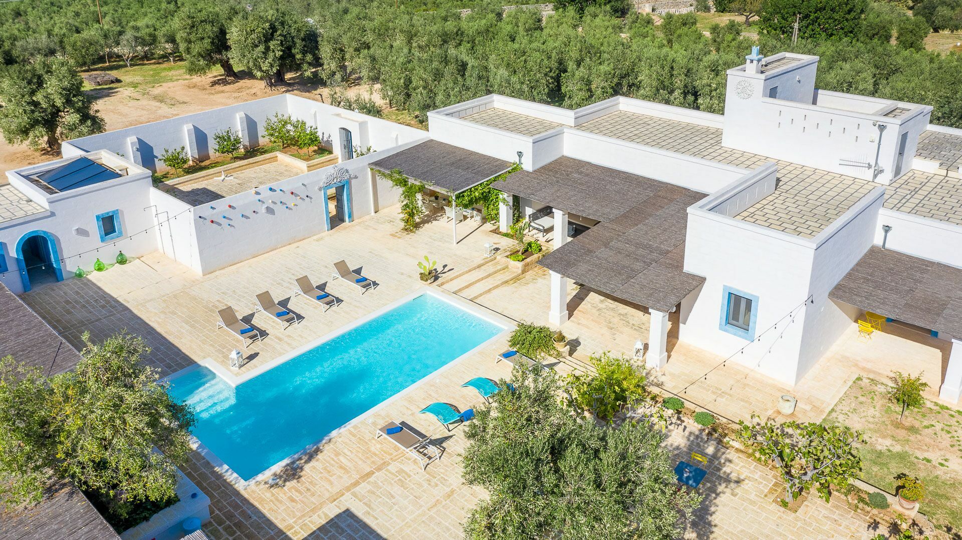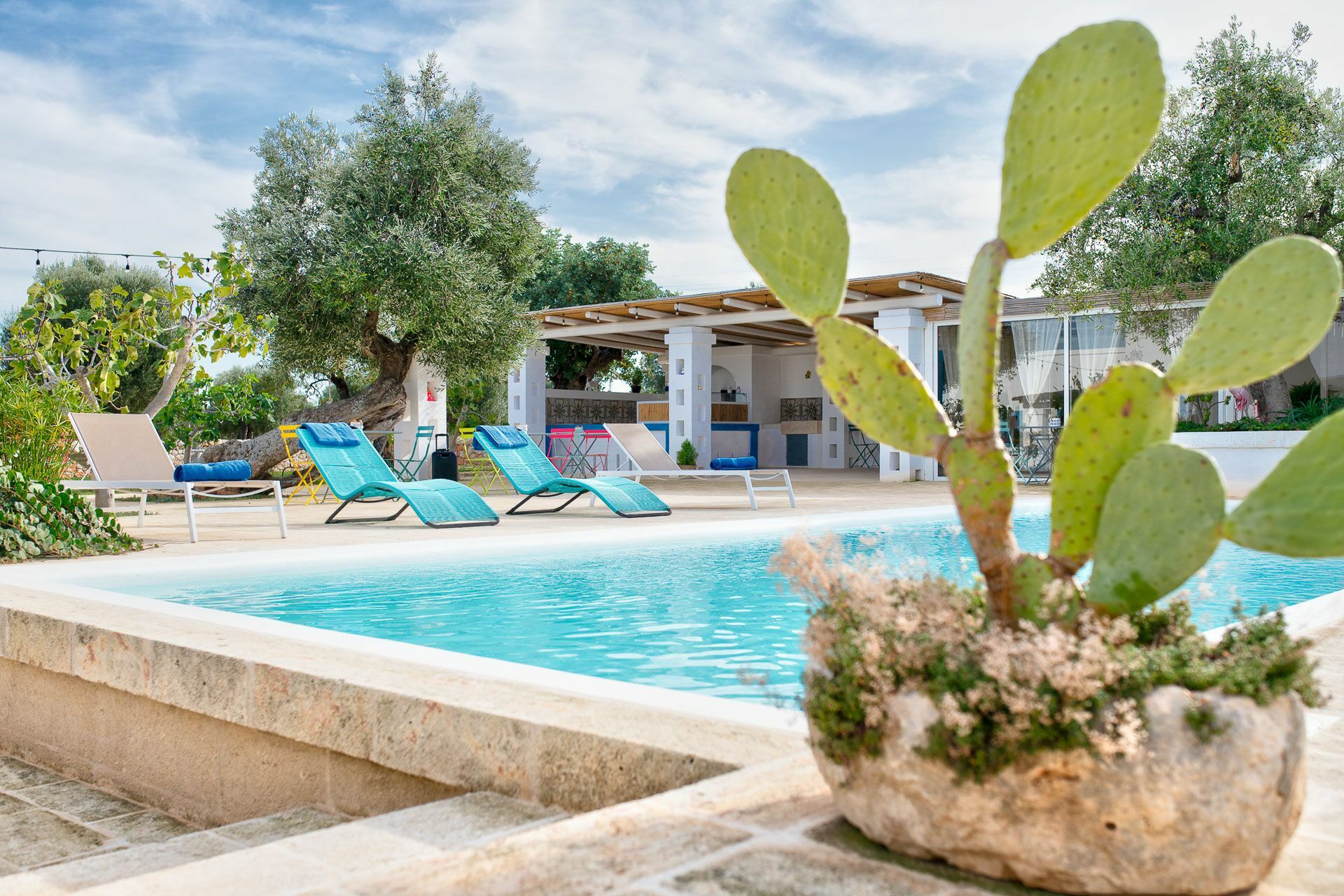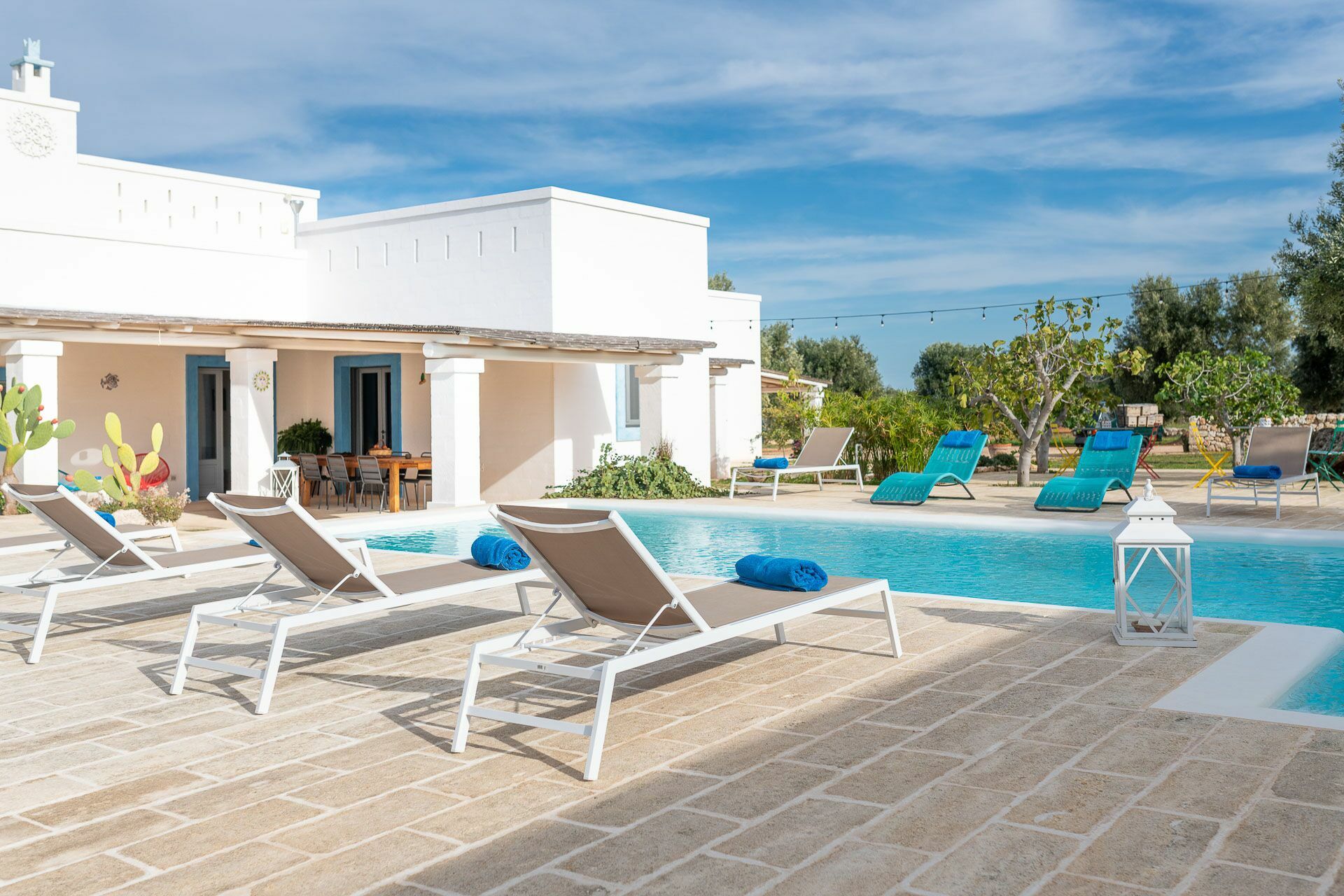 The swimming pool with skimmer, for the exclusive use of guests, measures 10m x 4m with a depth of 1.50m and access via Roman steps. On the sides of the pool, lying on the pavement with typical local stones, there are 10 sun loungers.