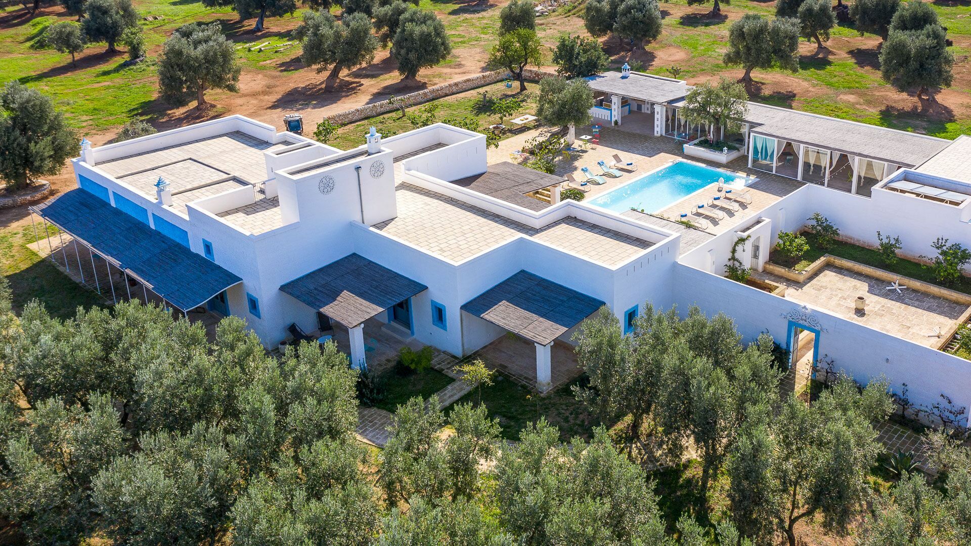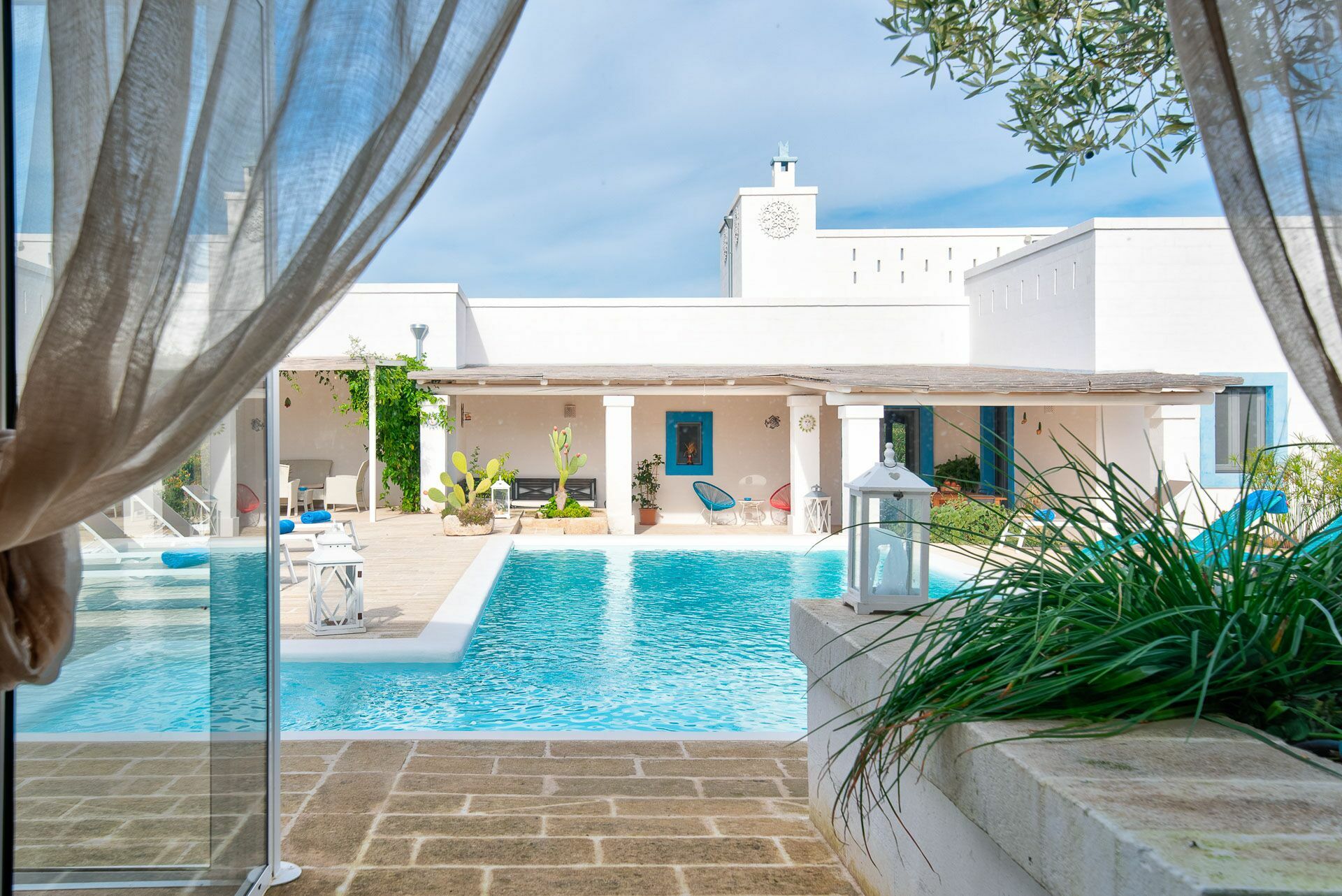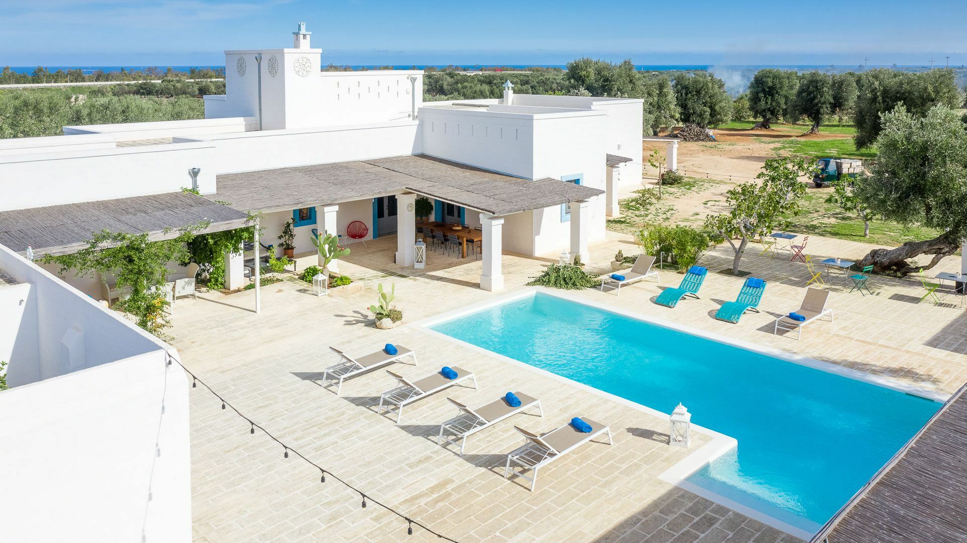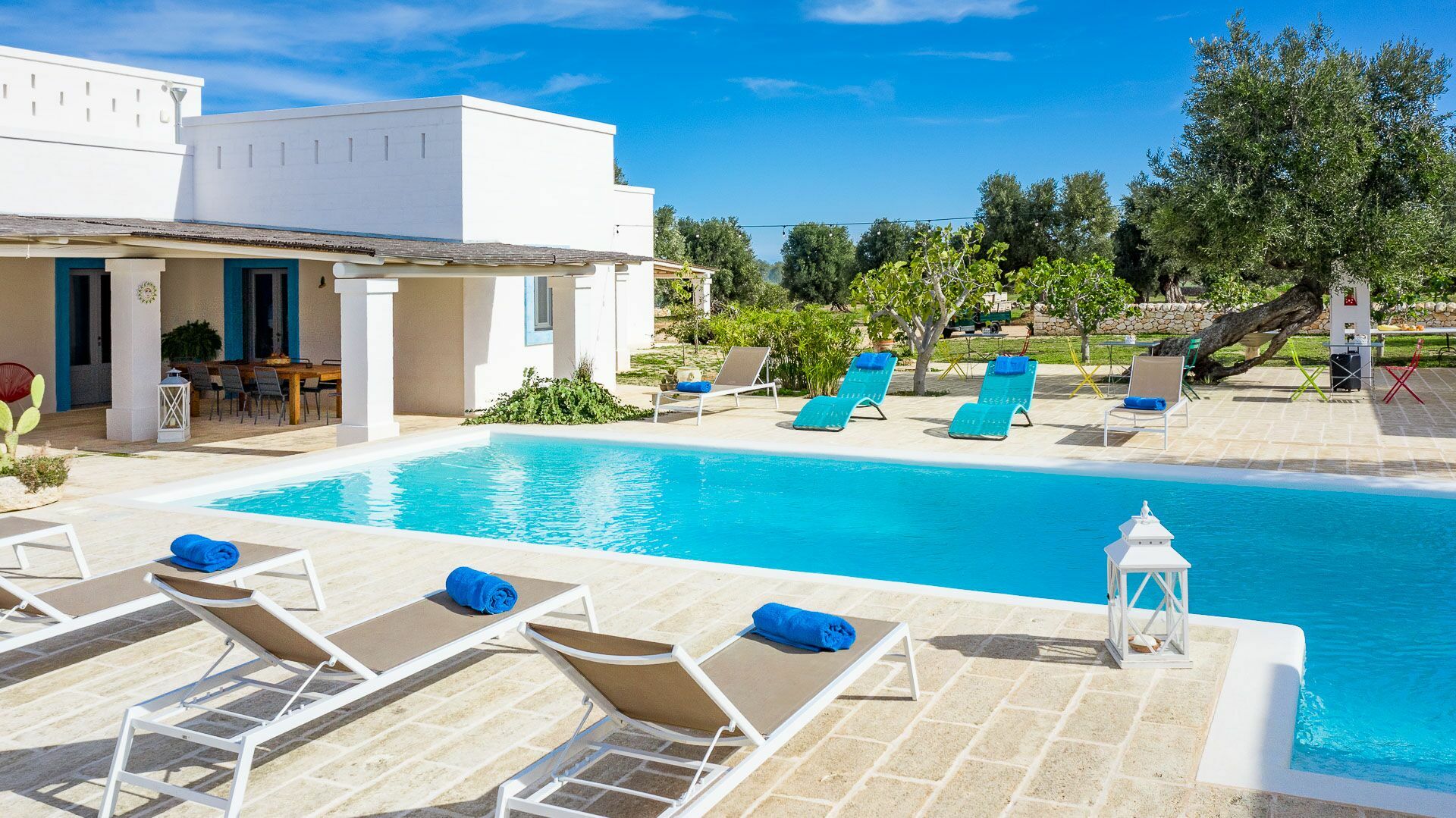 The swimming pool with skimmer, for the exclusive use of guests, measures 10m x 4m with a depth of 1.50m and access via Roman steps. On the sides of the pool, lying on the pavement with typical local stones, there are 10 sun loungers.