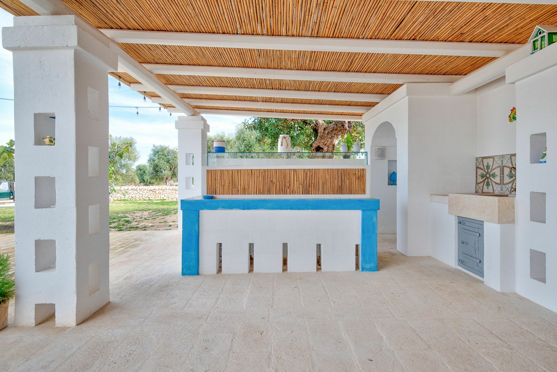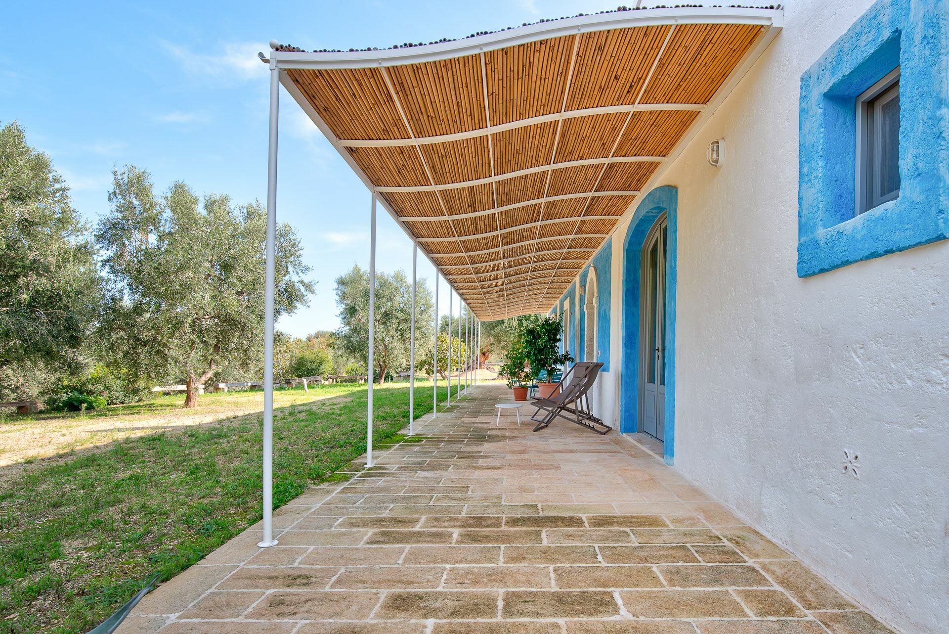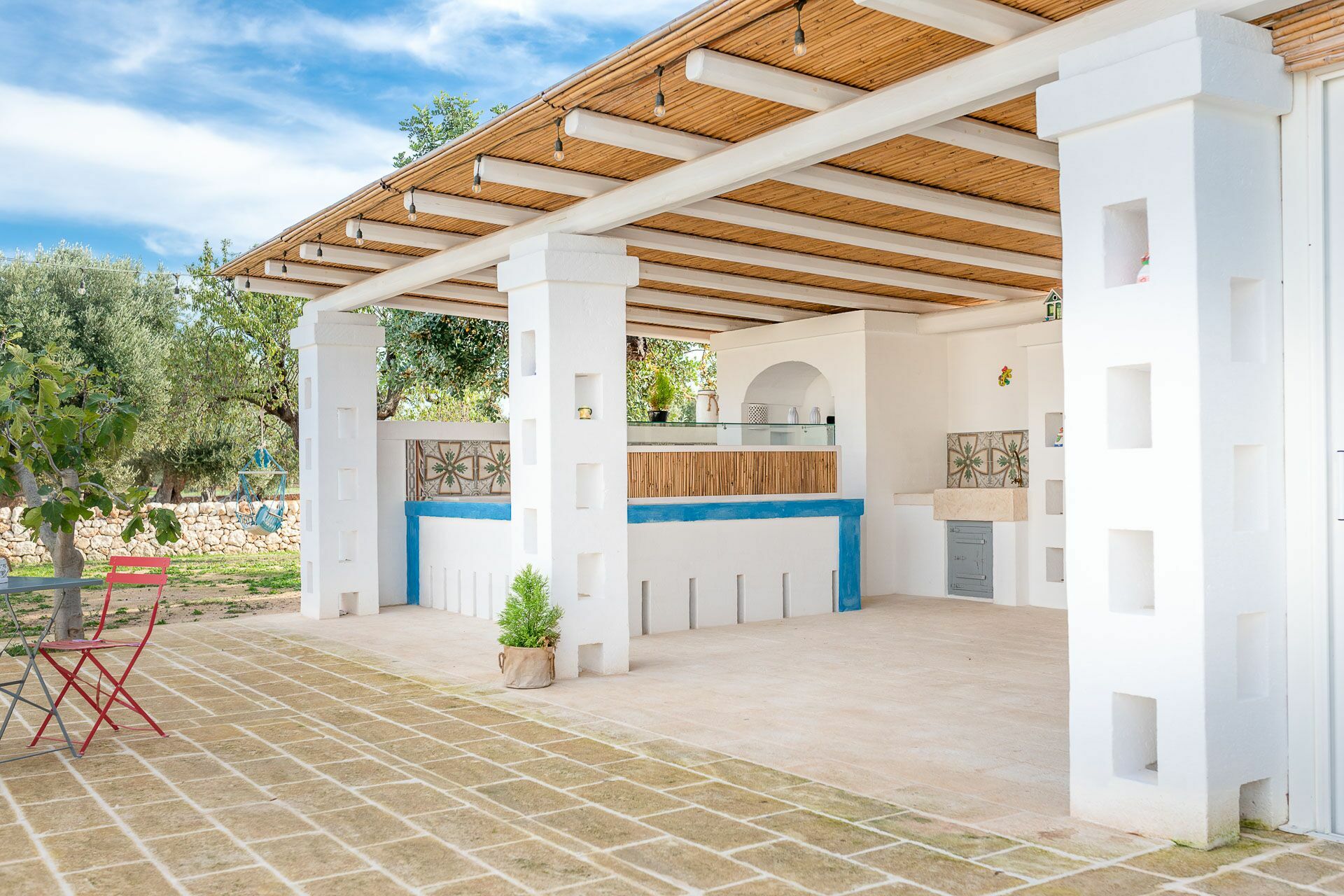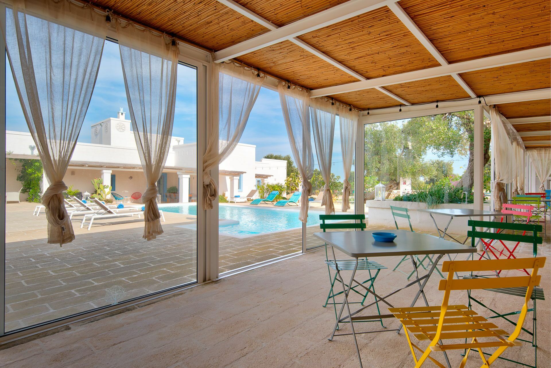 You will be able to access the garden and the pool area, both from the kitchen and from the living room. Under a large veranda, covered with the characteristic reeds, you will find the dining table and various relaxation corners furnished with comfortable seats and sofas, such as the orange grove with umbrellas.
