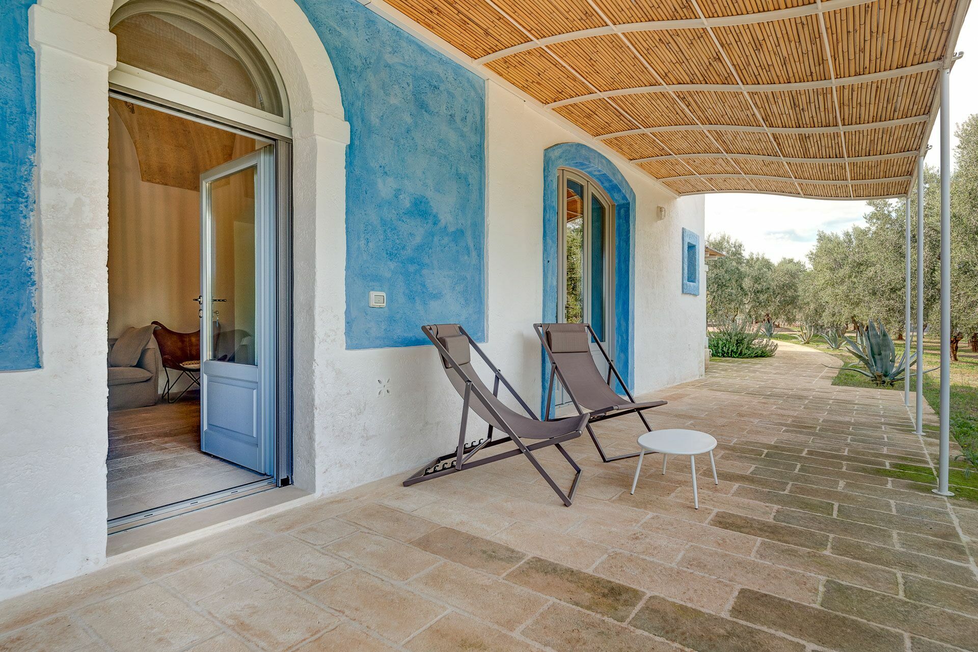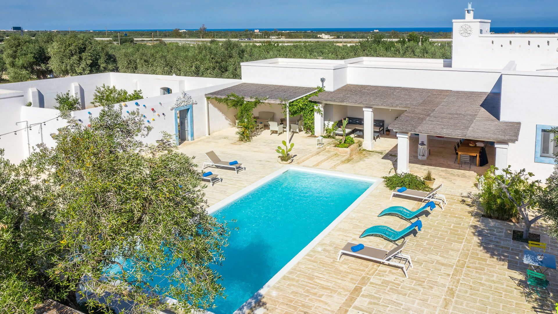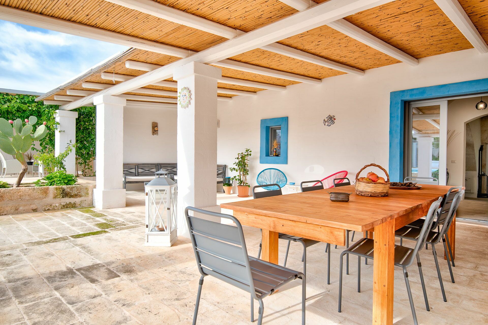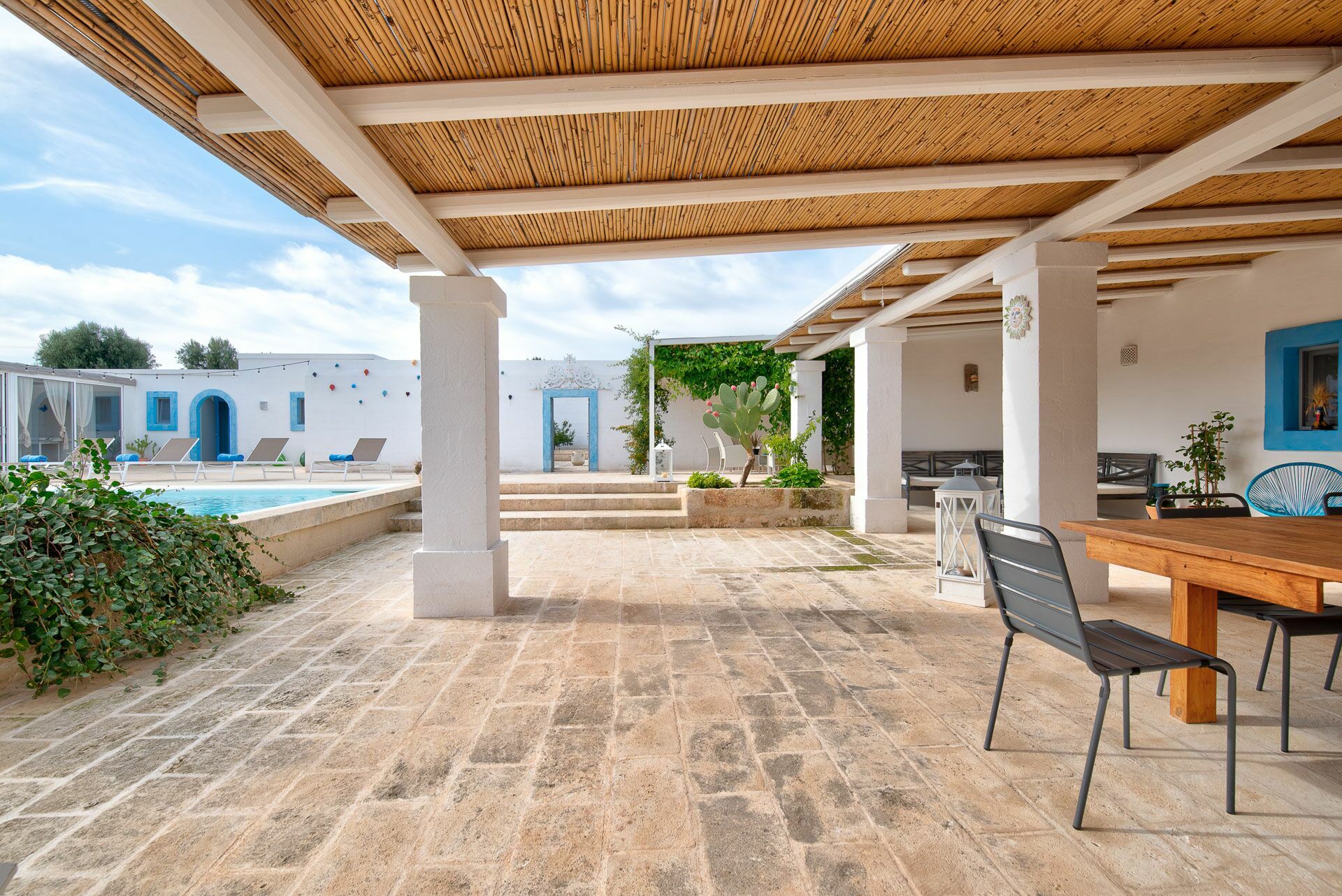 You will be able to access the garden and the pool area, both from the kitchen and from the living room. Under a large veranda, covered with the characteristic reeds, you will find the dining table and various relaxation corners furnished with comfortable seats and sofas, such as the orange grove with umbrellas.