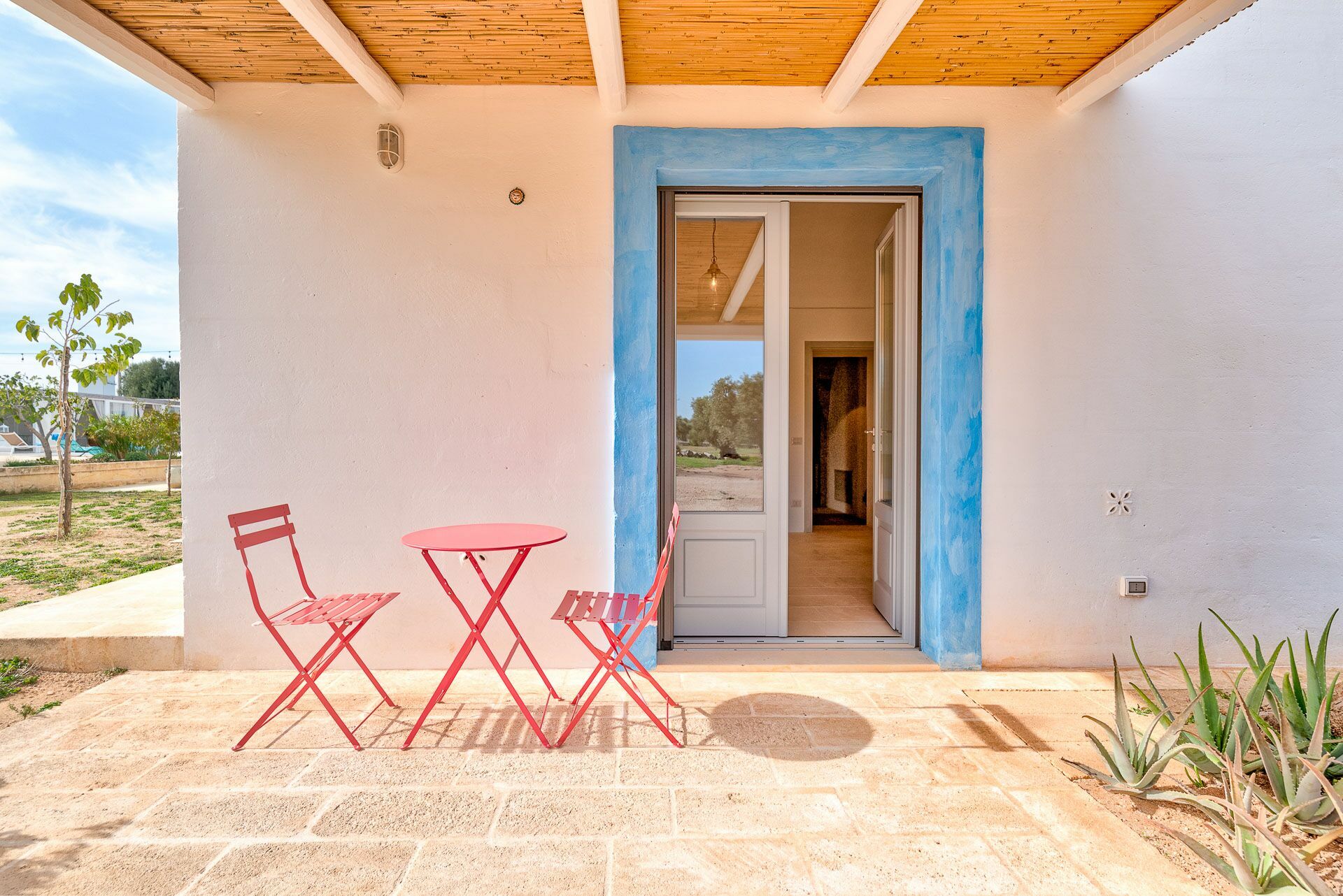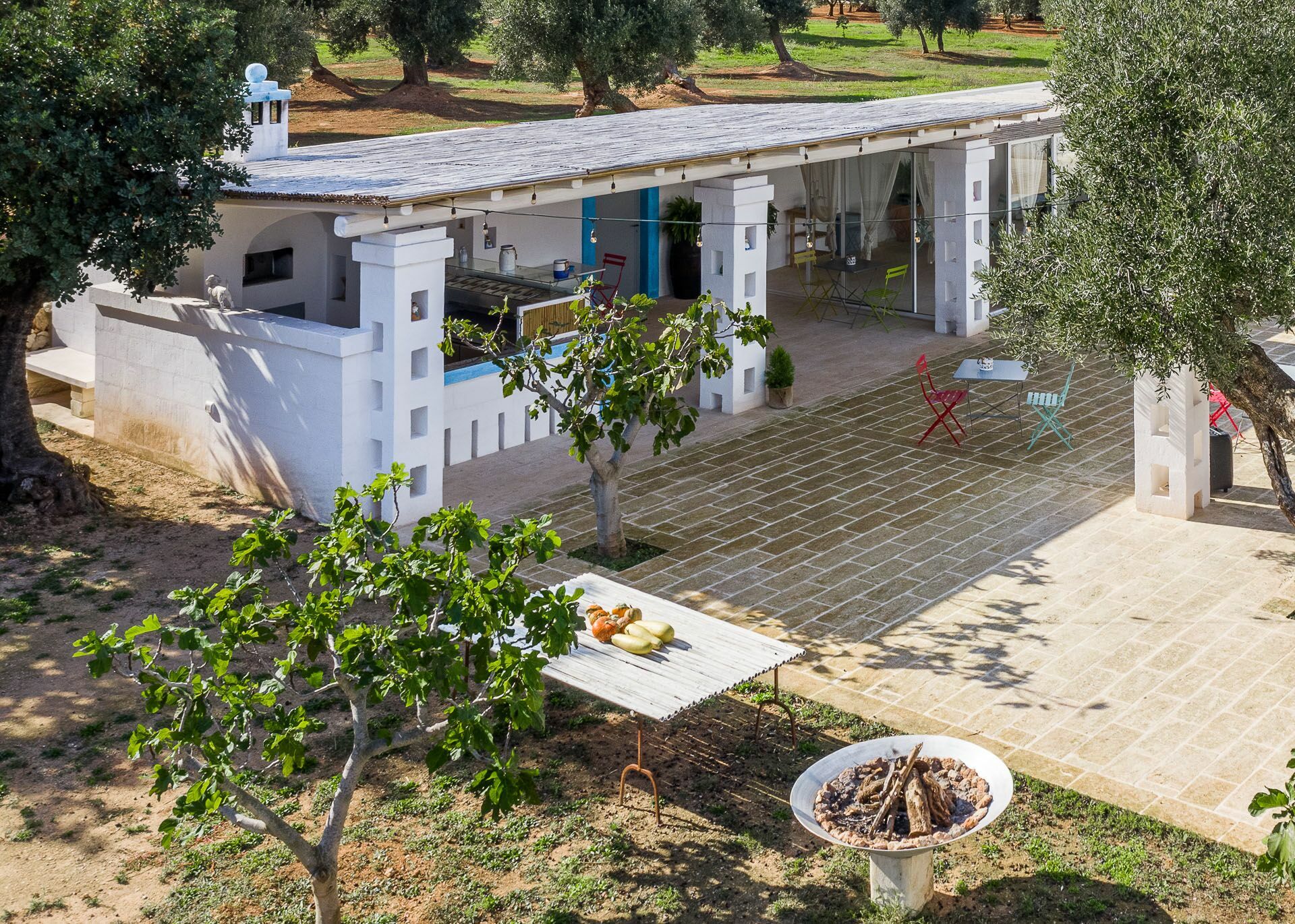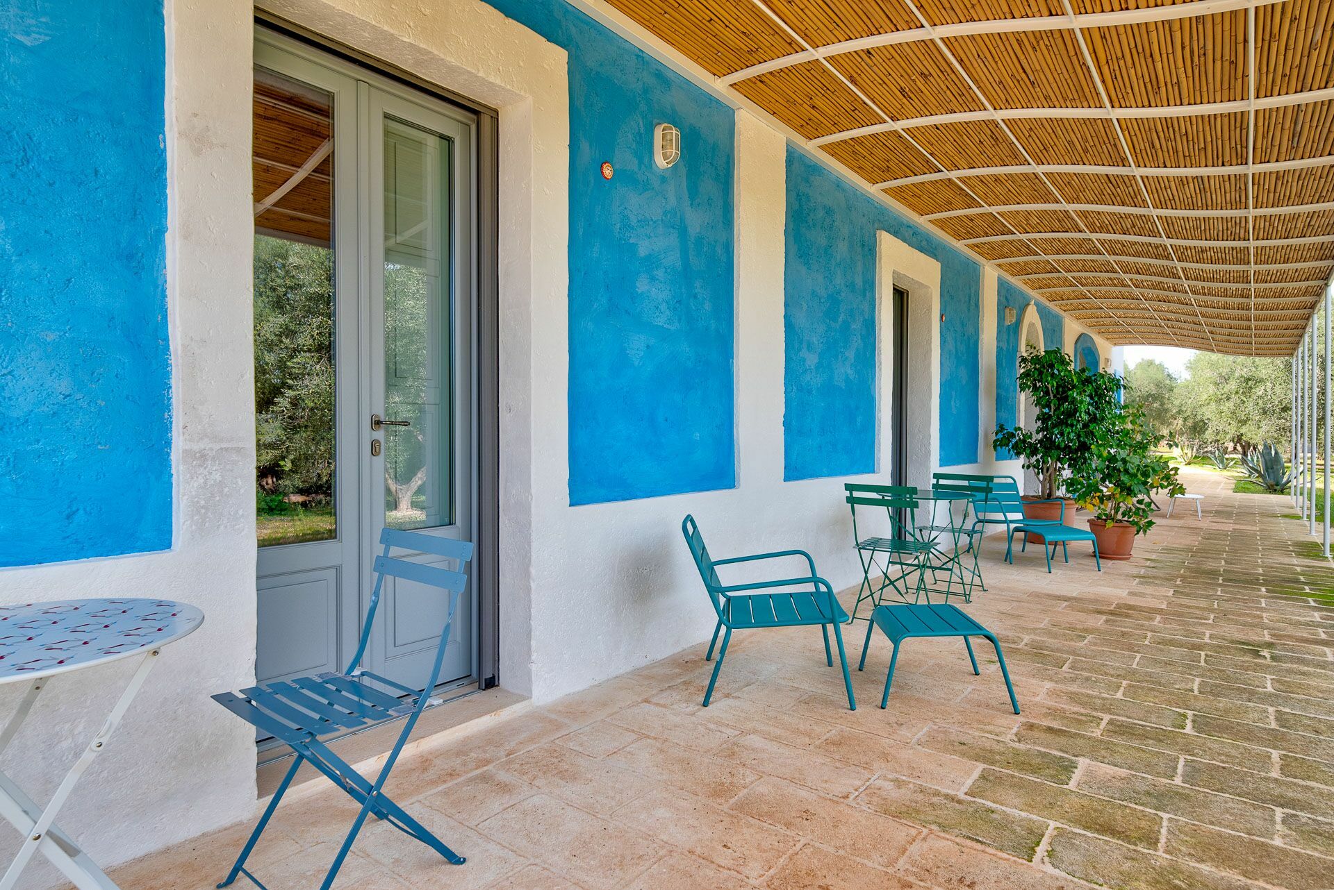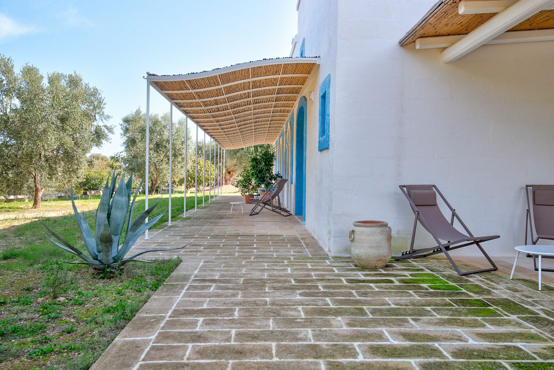 You will be able to access the garden and the pool area, both from the kitchen and from the living room. Under a large veranda, covered with the characteristic reeds, you will find the dining table and various relaxation corners furnished with comfortable seats and sofas, such as the orange grove with umbrellas.