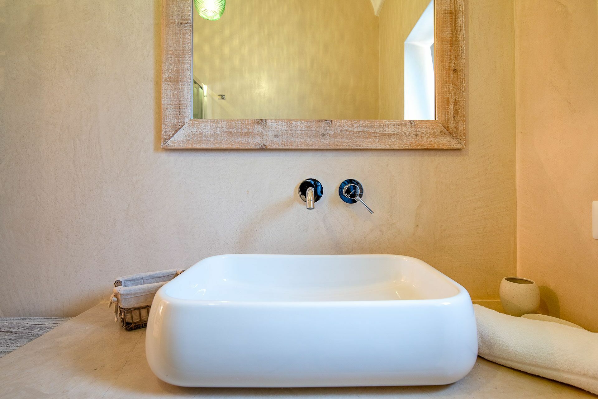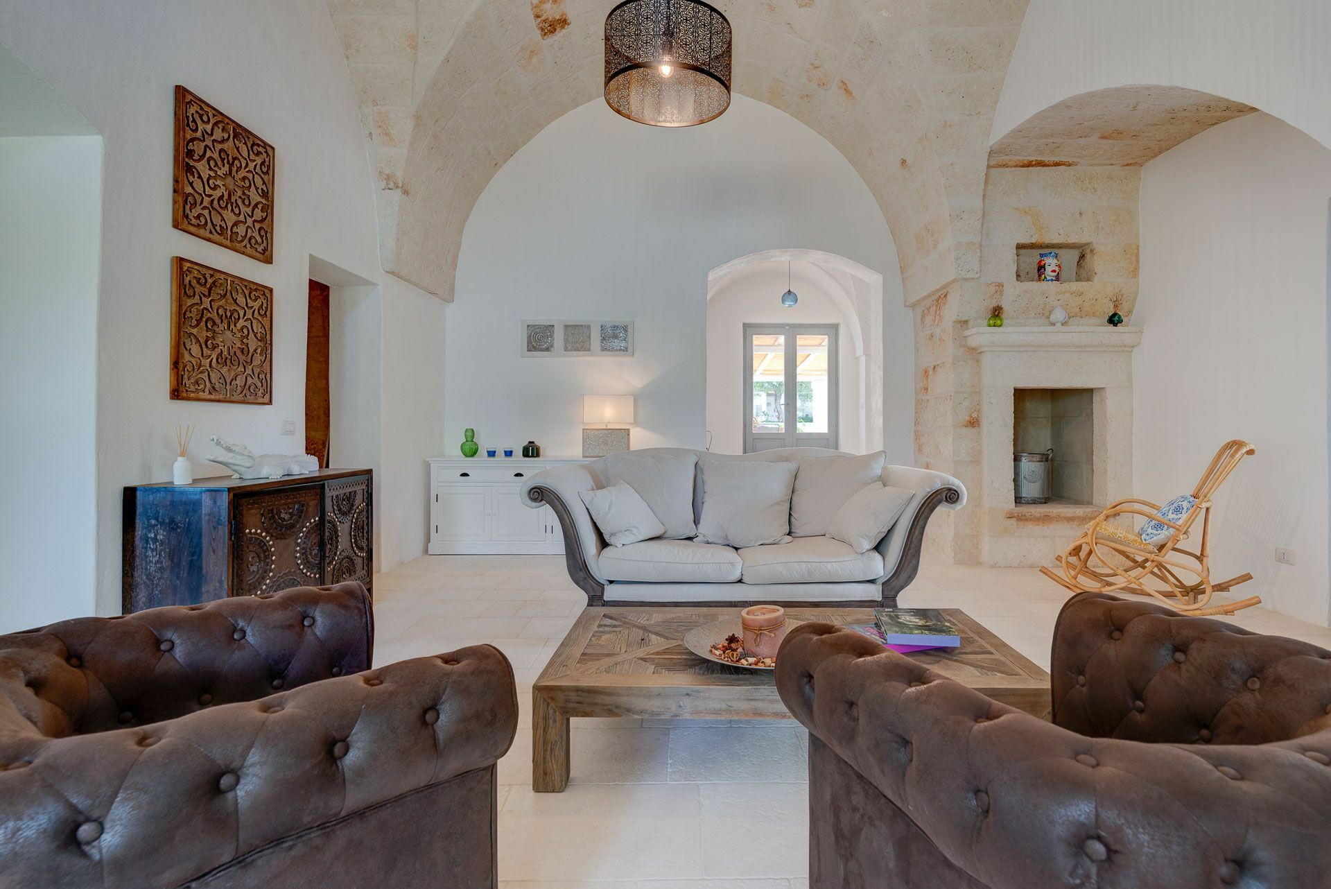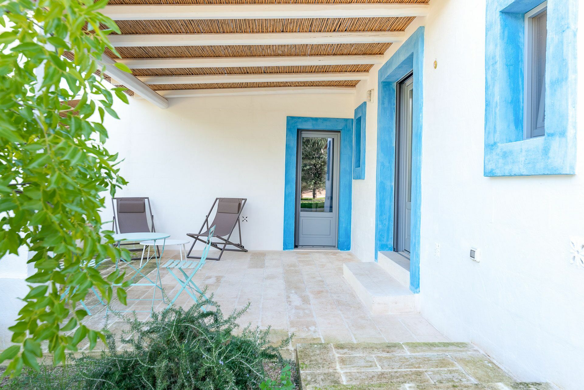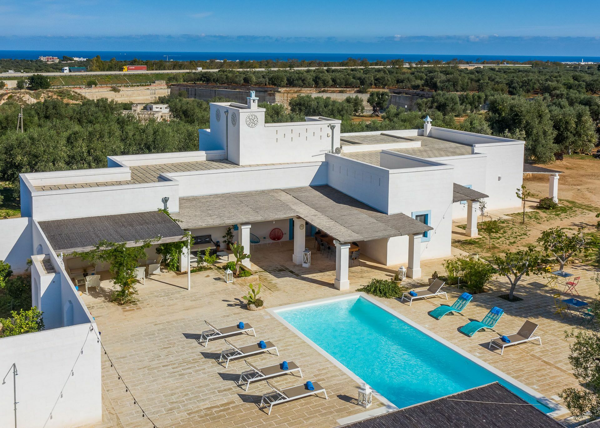 You will be able to access the garden and the pool area, both from the kitchen and from the living room. Under a large veranda, covered with the characteristic reeds, you will find the dining table and various relaxation corners furnished with comfortable seats and sofas, such as the orange grove with umbrellas.