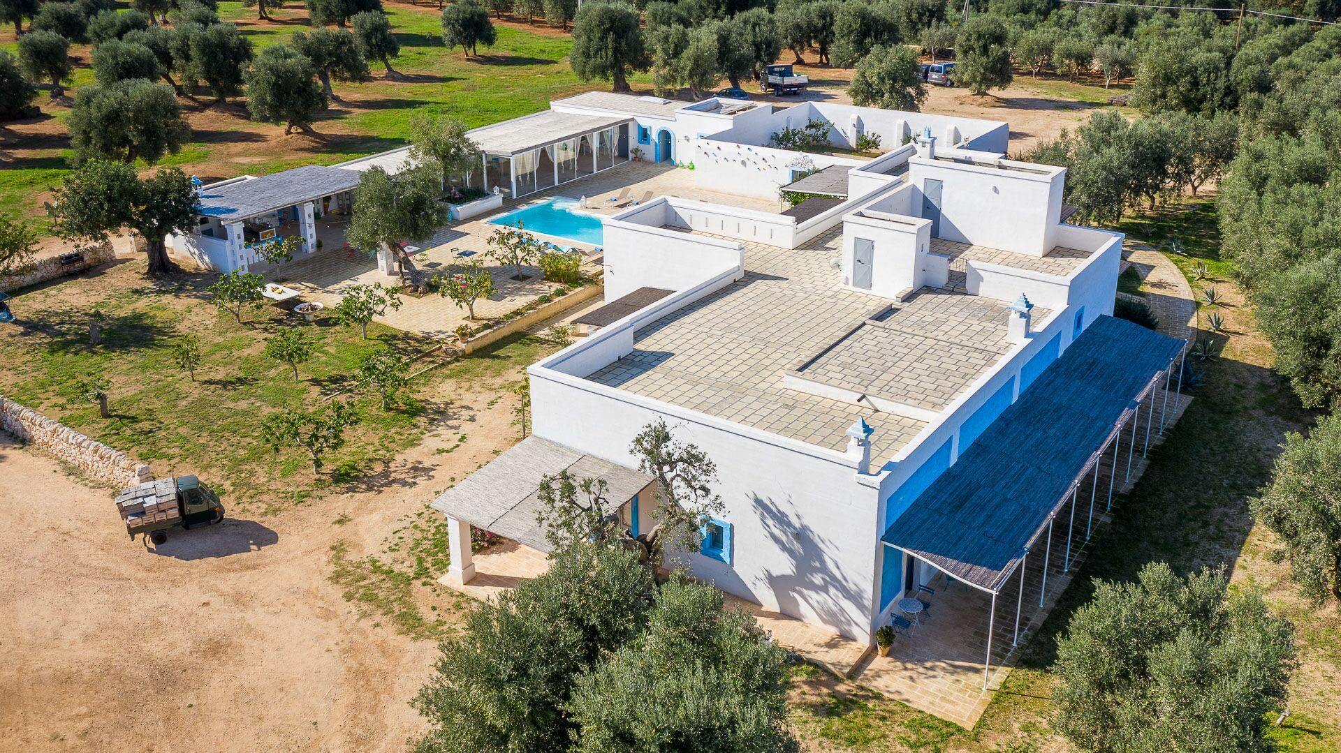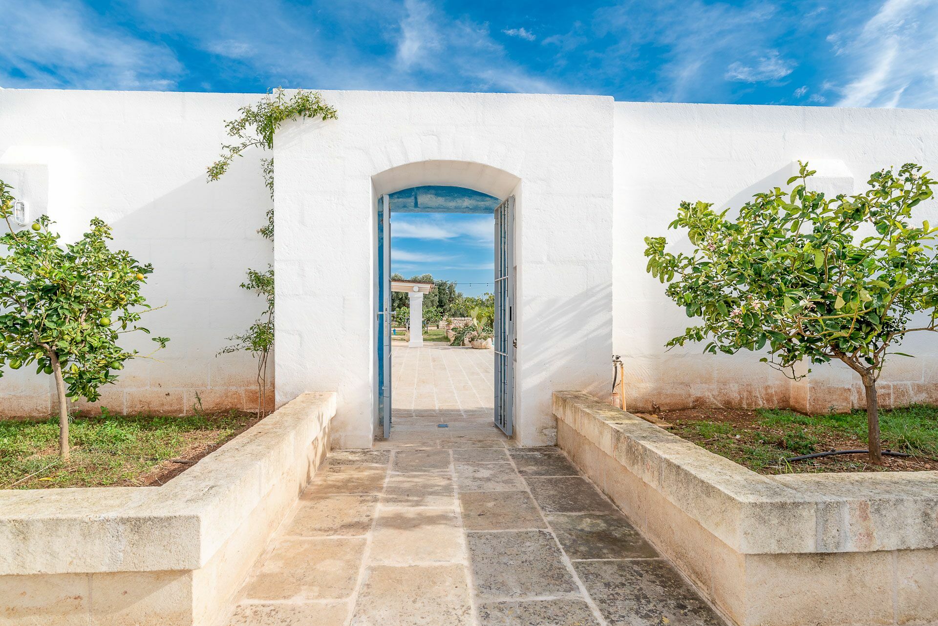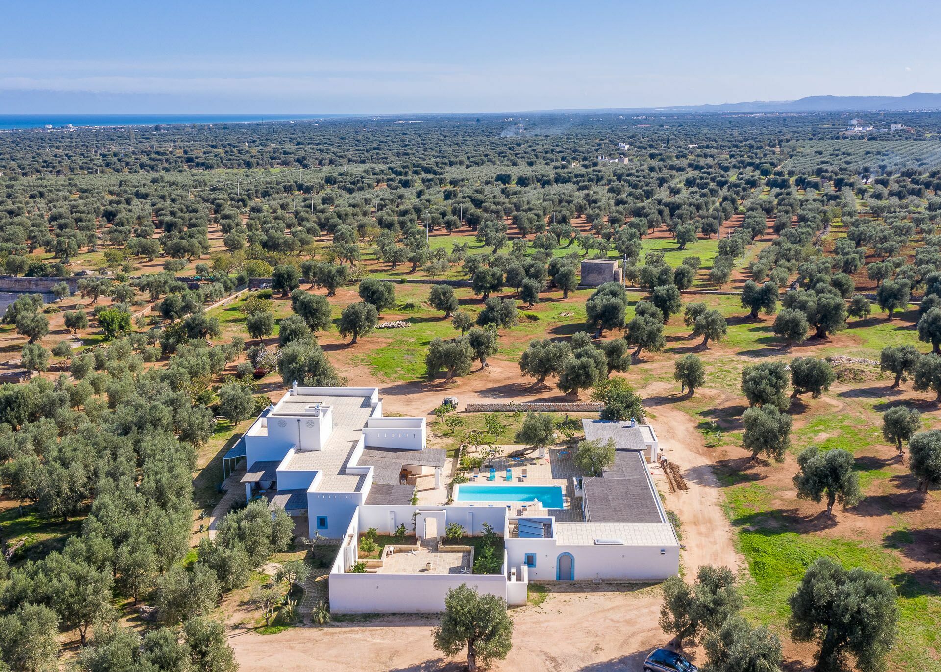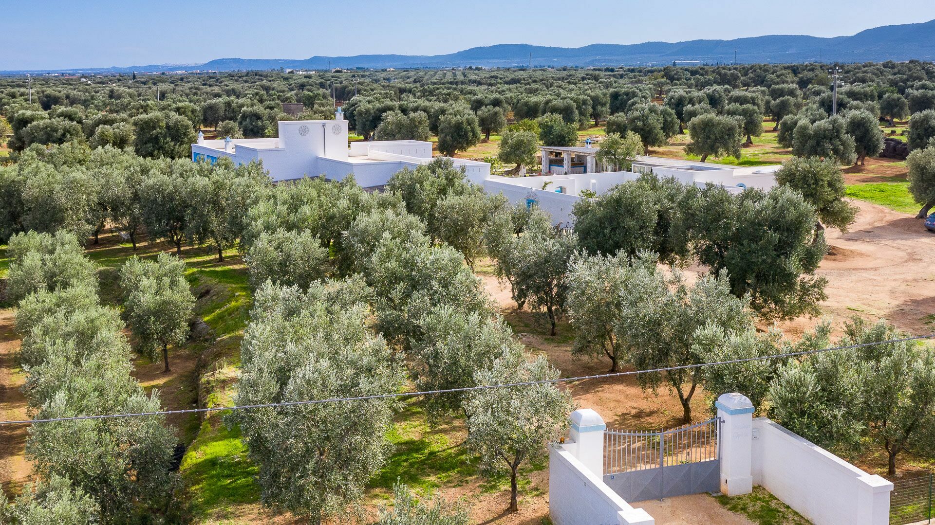 When you arrive at the historic villa for rent, Masseria Tufo Bianco, after crossing the short country road, lined with dry stone walls and olive trees, you will find yourself in front of the electric gate. You can choose to park the car in the large dirt area or bring it to the access at the back to conveniently store your suitcases.