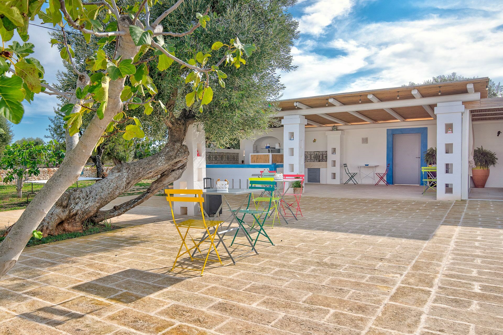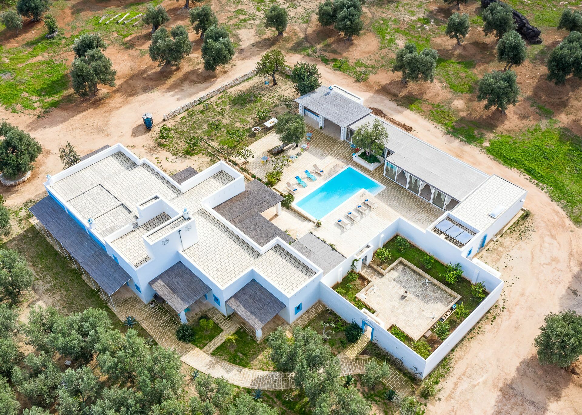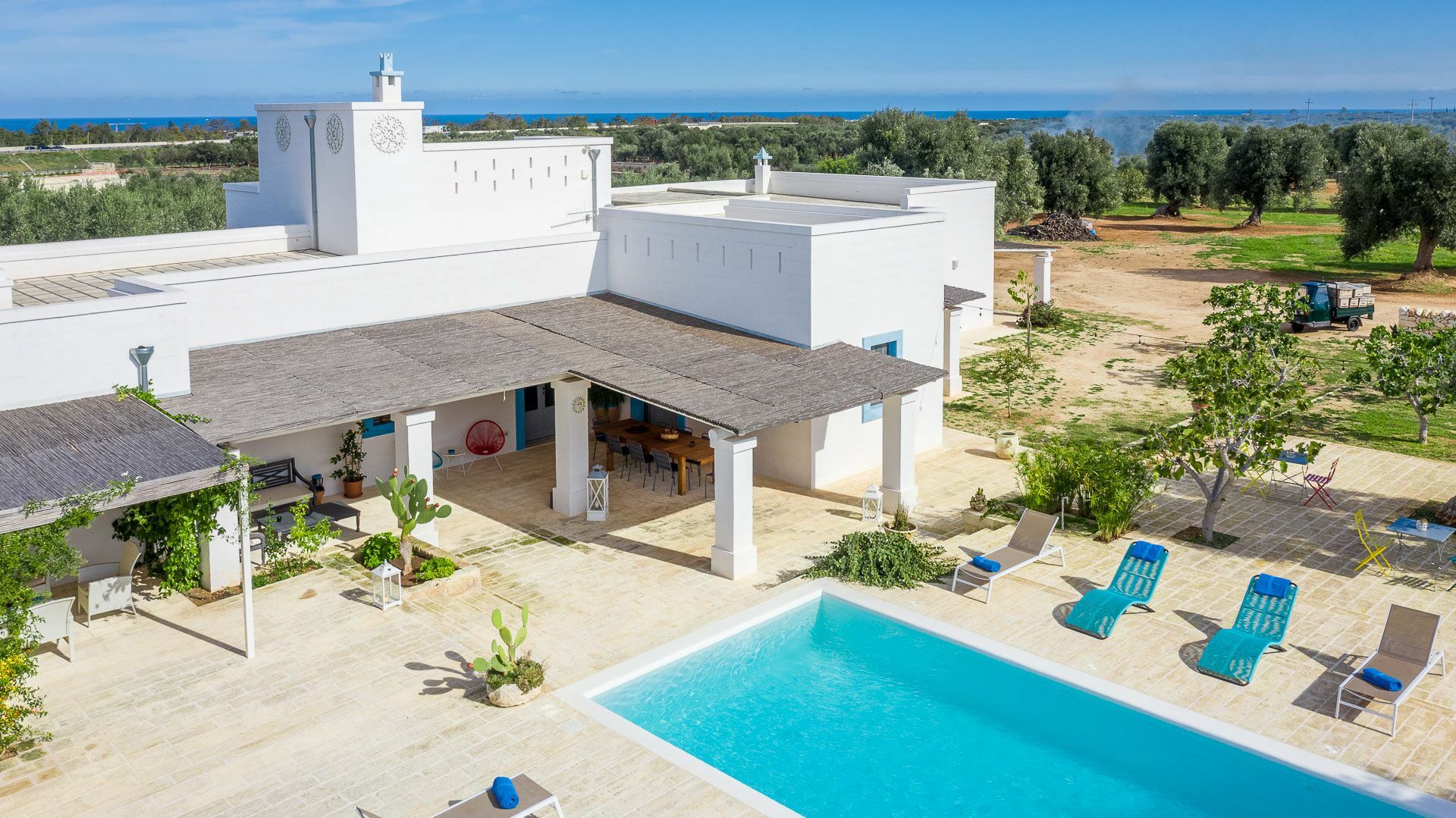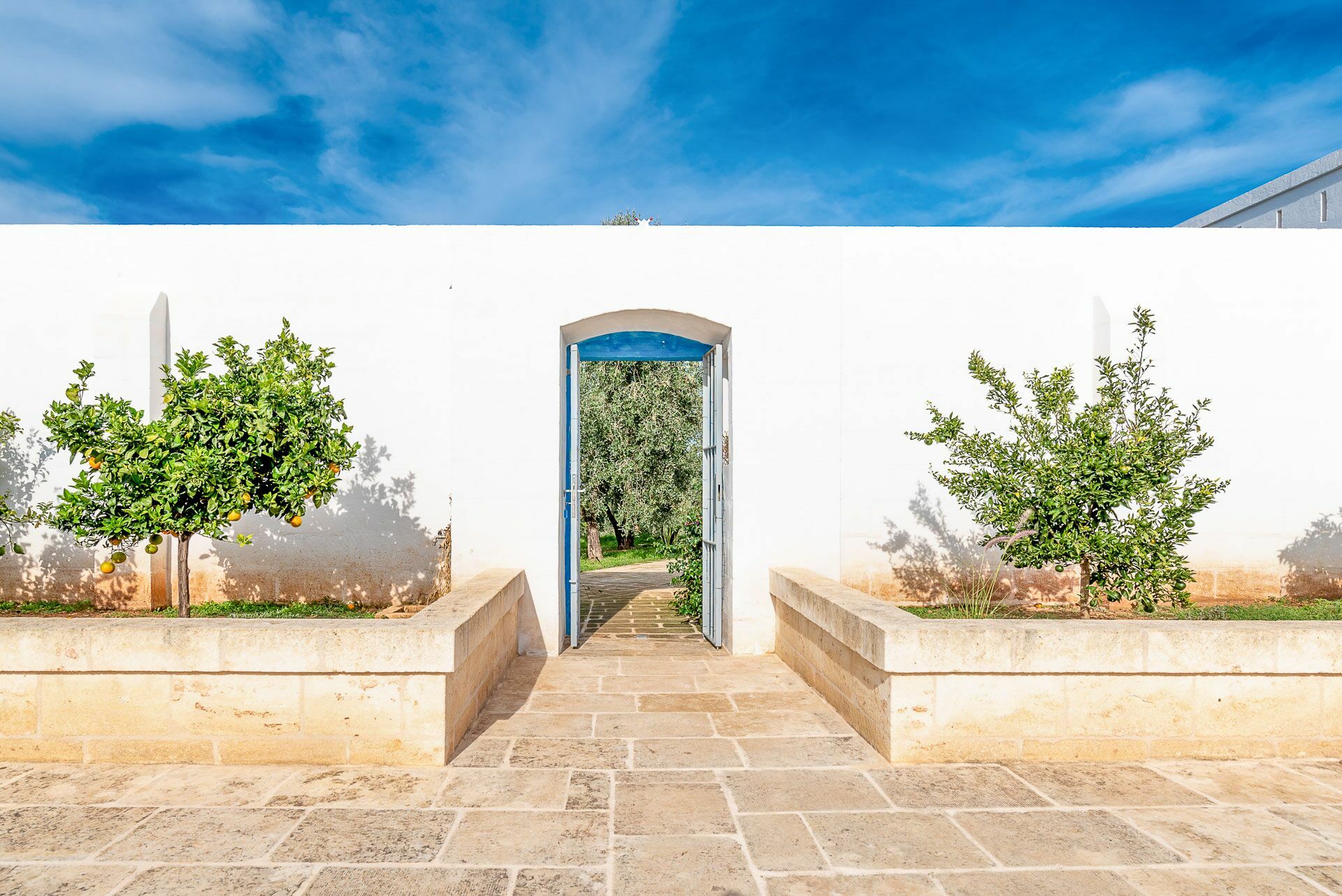 When you arrive at the historic villa for rent, Masseria Tufo Bianco, after crossing the short country road, lined with dry stone walls and olive trees, you will find yourself in front of the electric gate. You can choose to park the car in the large dirt area or bring it to the access at the back to conveniently store your suitcases.