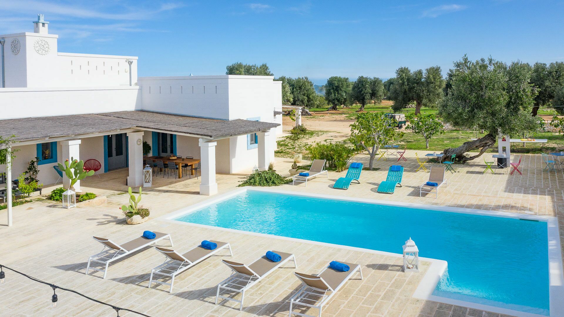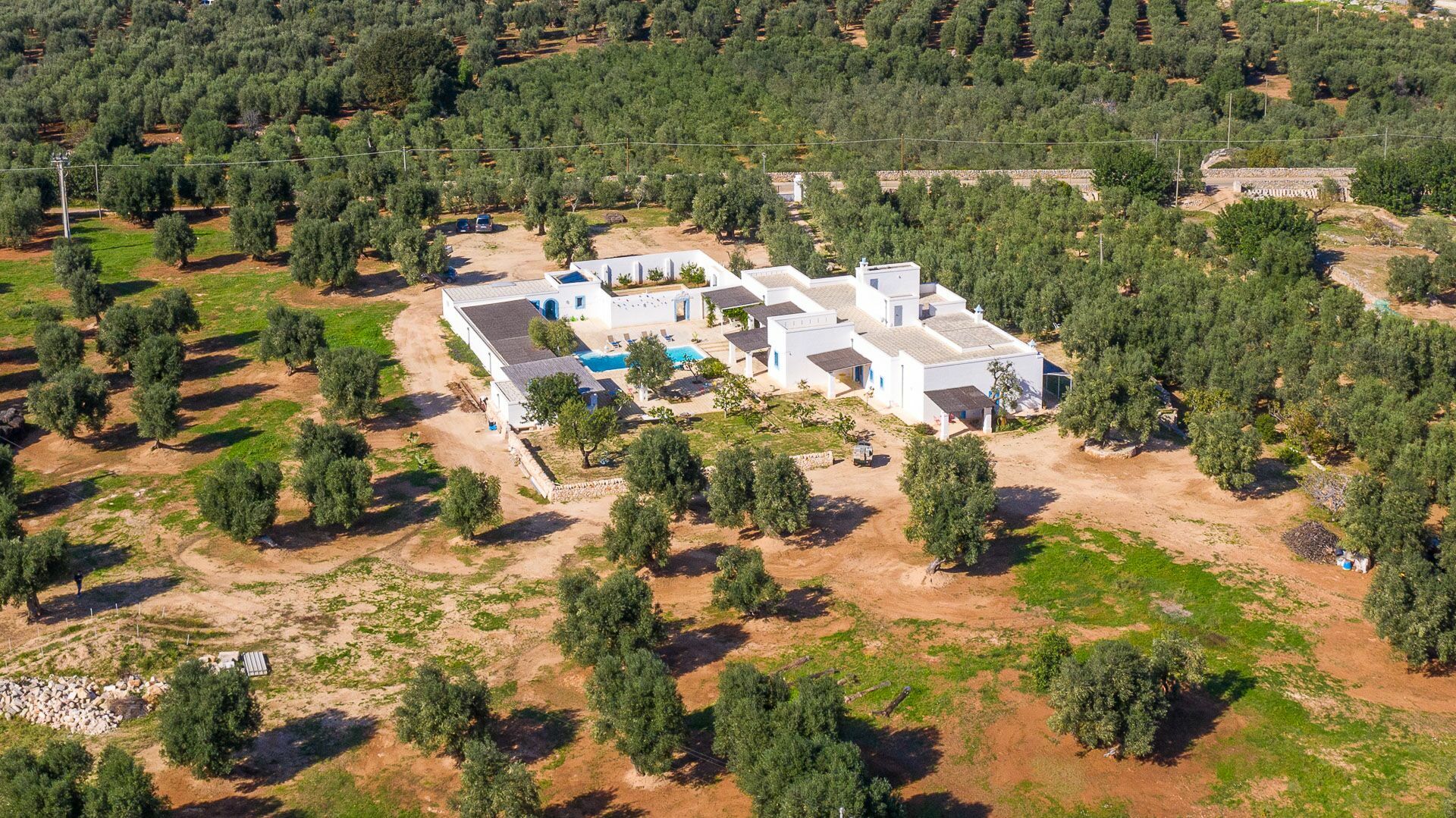 Masseria Tufo Bianco is a historic villa for rent for holidays in Puglia. The villa for rent with swimming pool, a few minutes from the sea and the nearby Pezze di Greco (inhabited fraction of the city of Fasano), consists of a living room with bathroom, kitchen, 5 double bedrooms with en-suite bathroom, and garden with swimming pool.