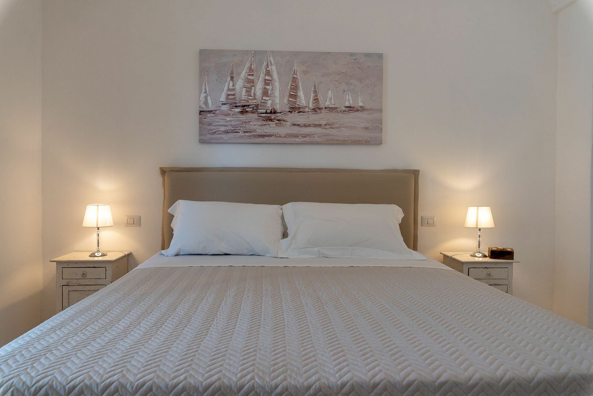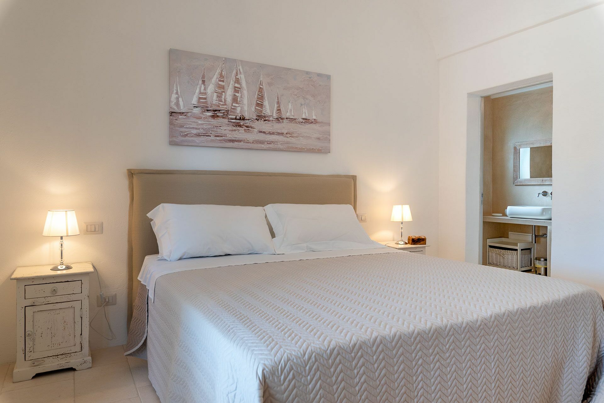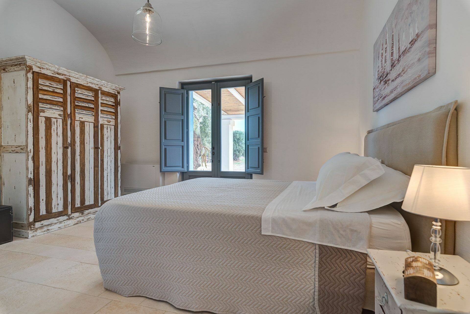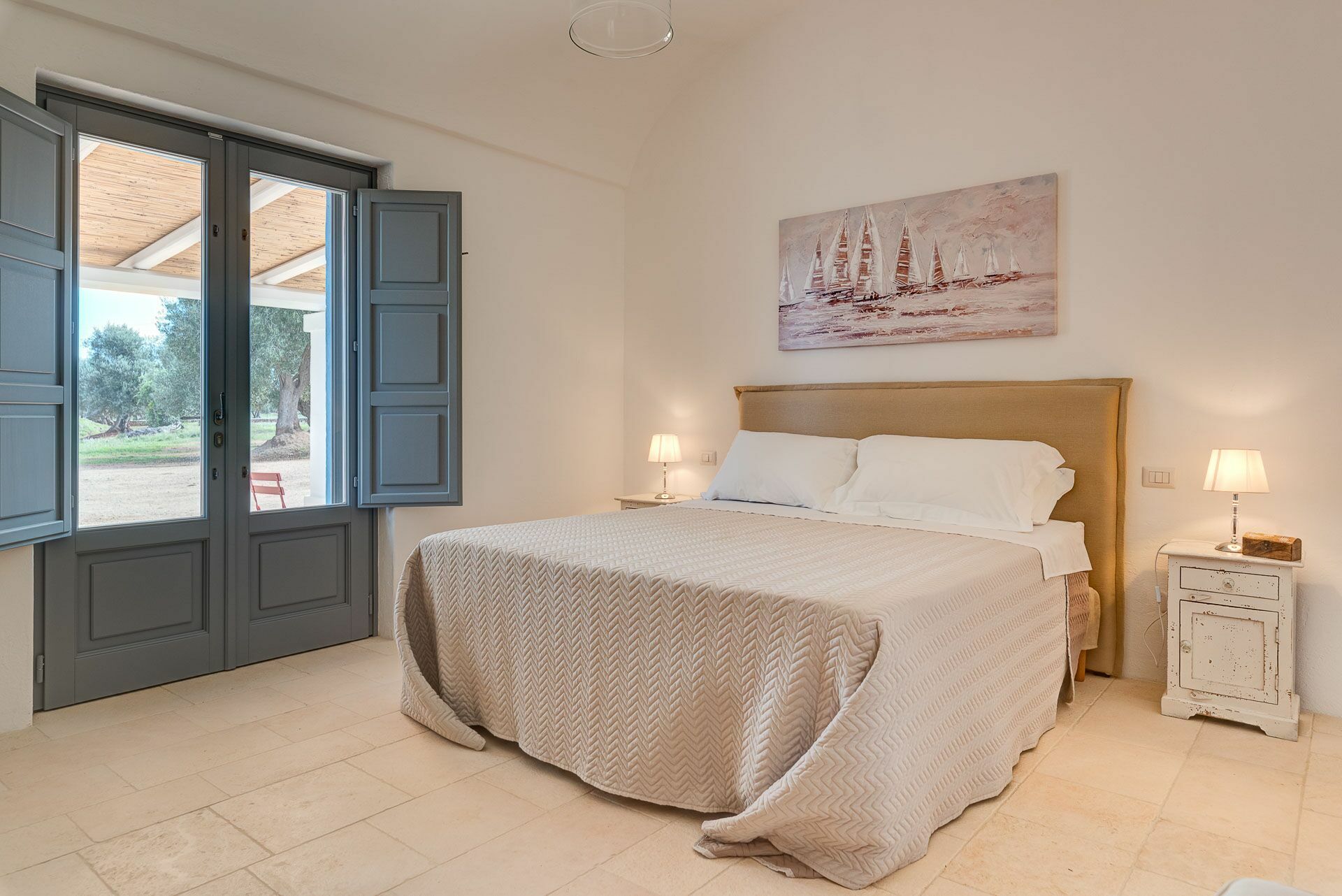 Bedroom 2 has a barrel ceiling, a double bed with headboard, four cushions, and two bedside tables with light points on the side. On the main wall a painting that reminds us of the proximity to the sea with, inlaid in the wood, of sailing boats. Here, too, the pool area is easy to access thanks to the double-leaf French door that opens onto the outside.