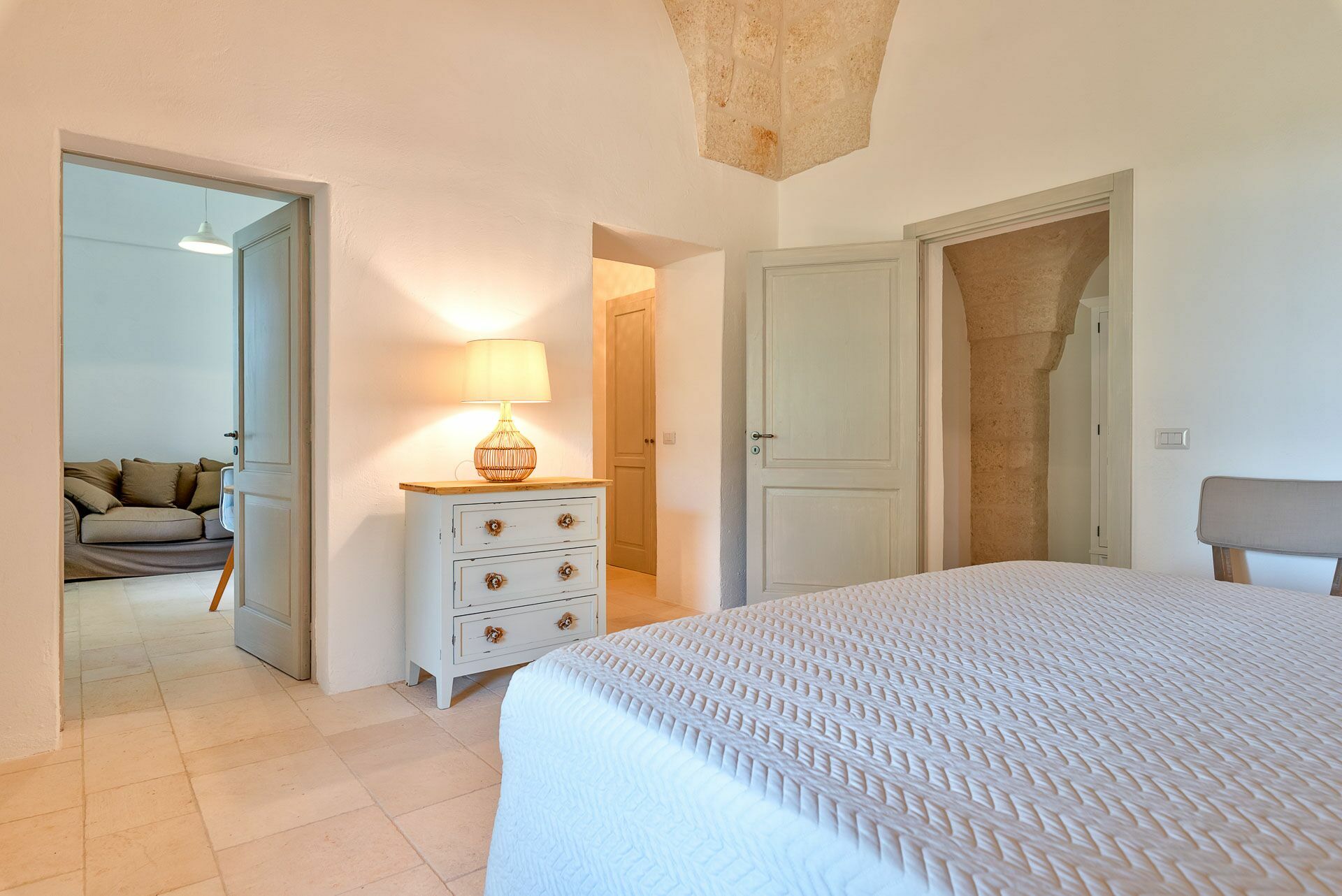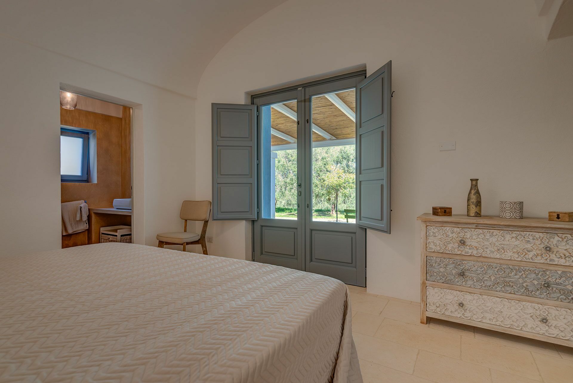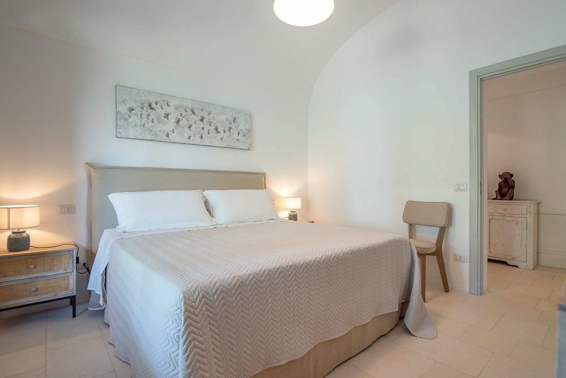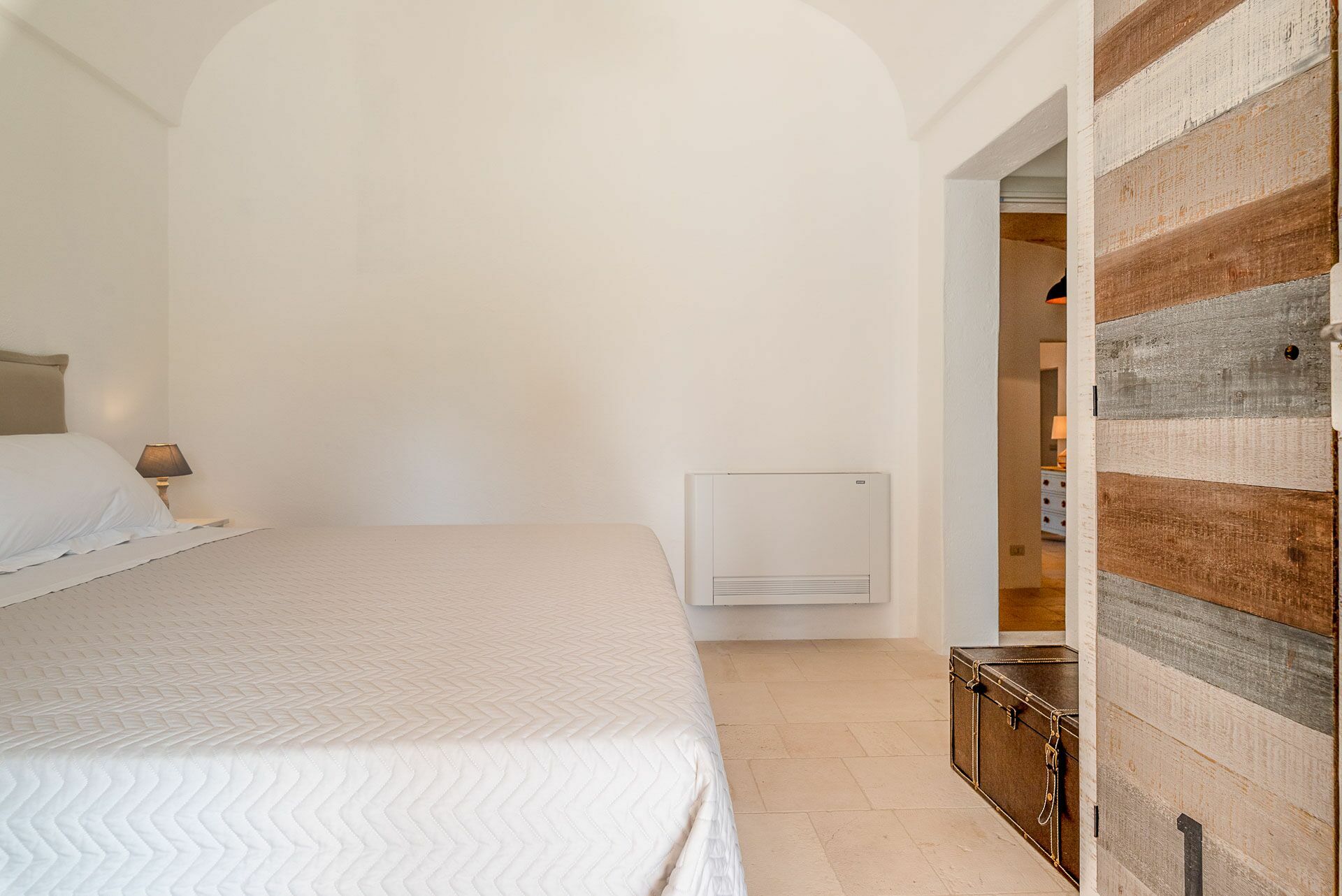 Bedroom 2 has a barrel ceiling, a double bed with headboard, four cushions, and two bedside tables with light points on the side. On the main wall a painting that reminds us of the proximity to the sea with, inlaid in the wood, of sailing boats. Here, too, the pool area is easy to access thanks to the double-leaf French door that opens onto the outside.