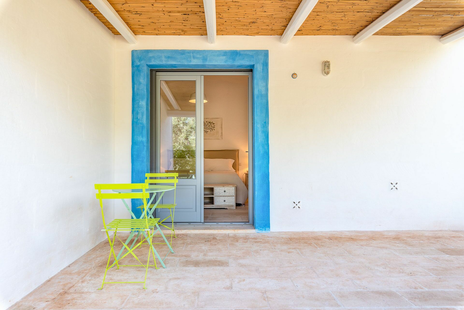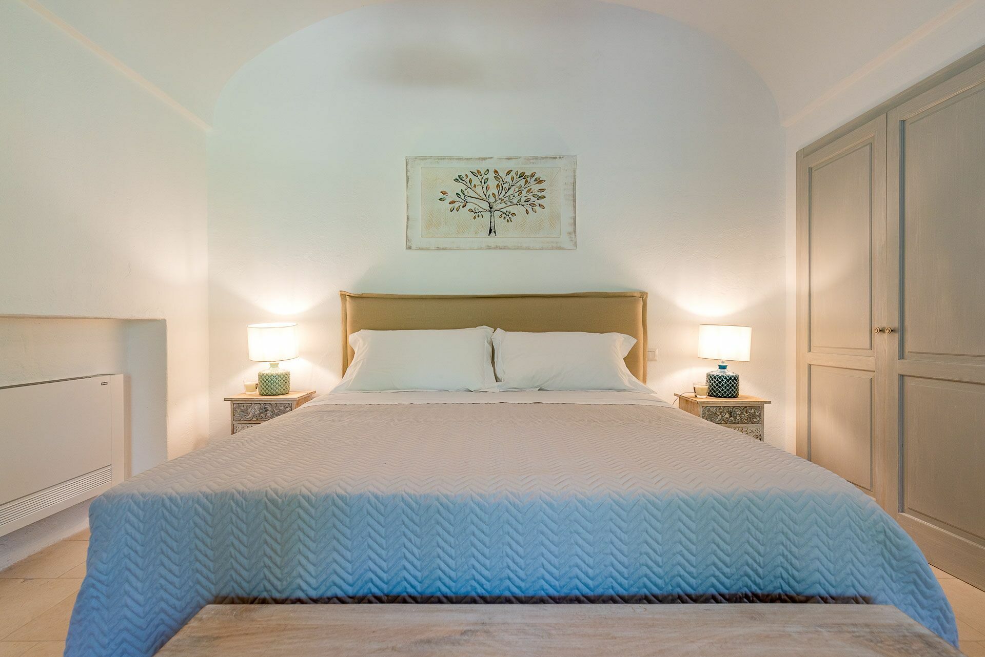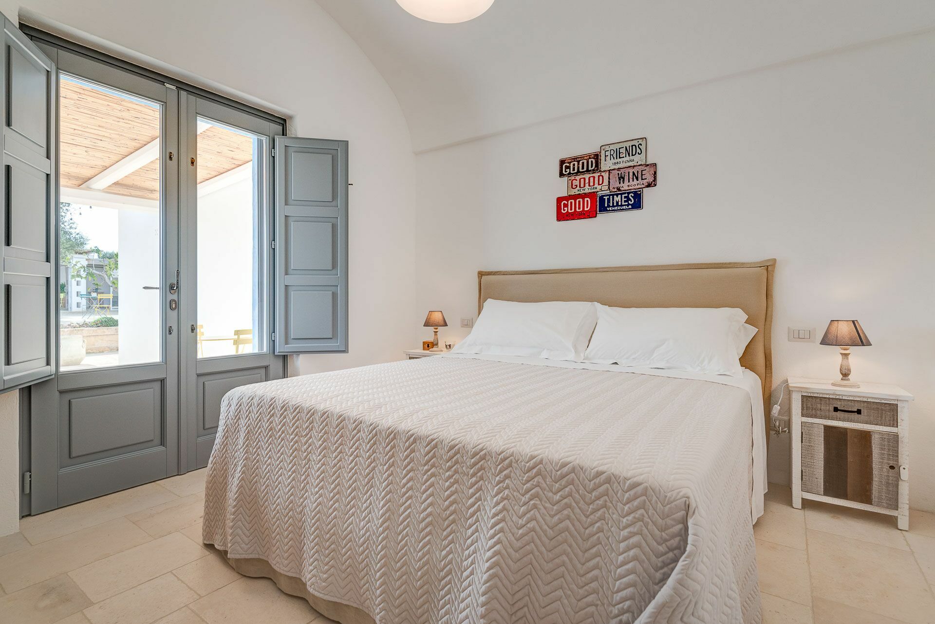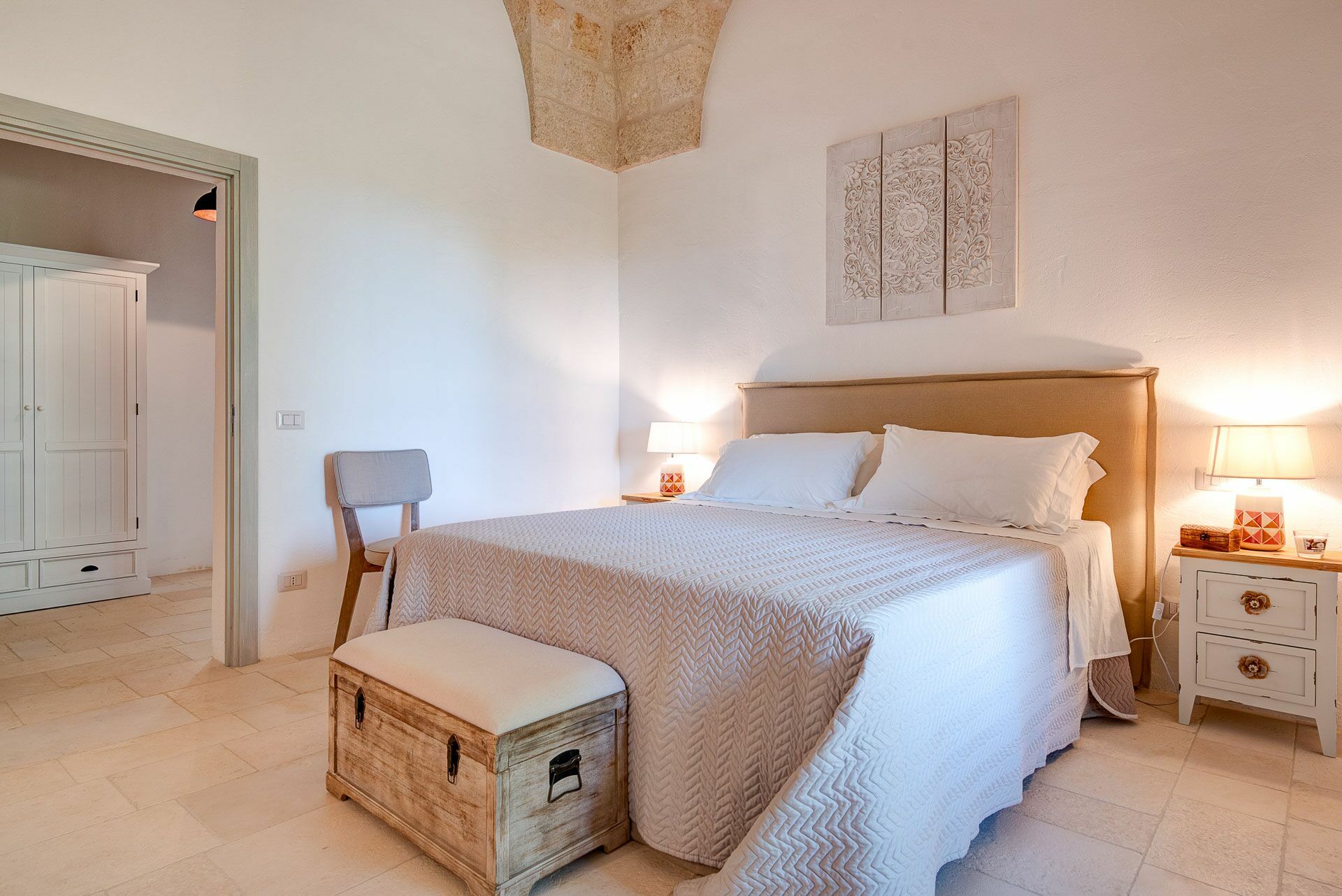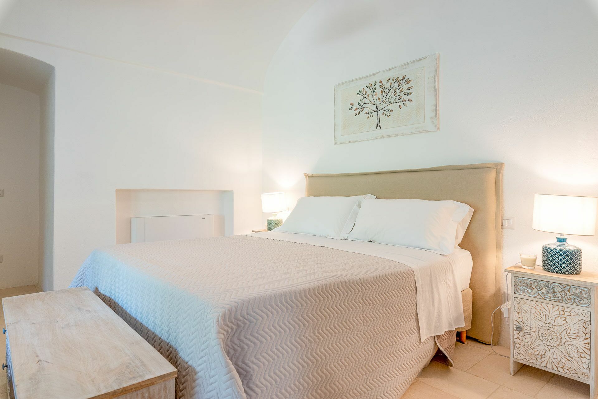 Bedroom 2 has a barrel ceiling, a double bed with headboard, four cushions, and two bedside tables with light points on the side. On the main wall a painting that reminds us of the proximity to the sea with, inlaid in the wood, of sailing boats. Here, too, the pool area is easy to access thanks to the double-leaf French door that opens onto the outside.