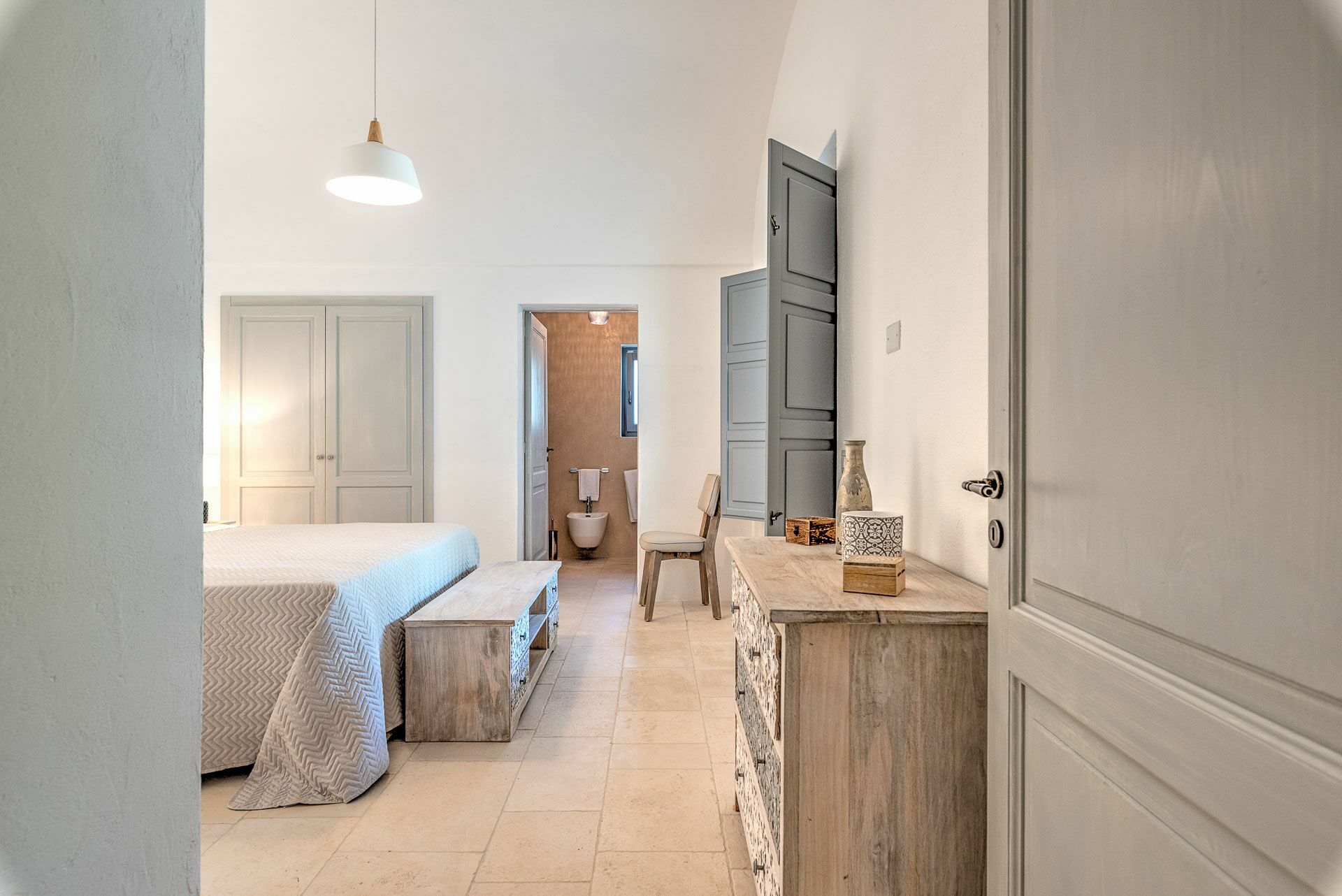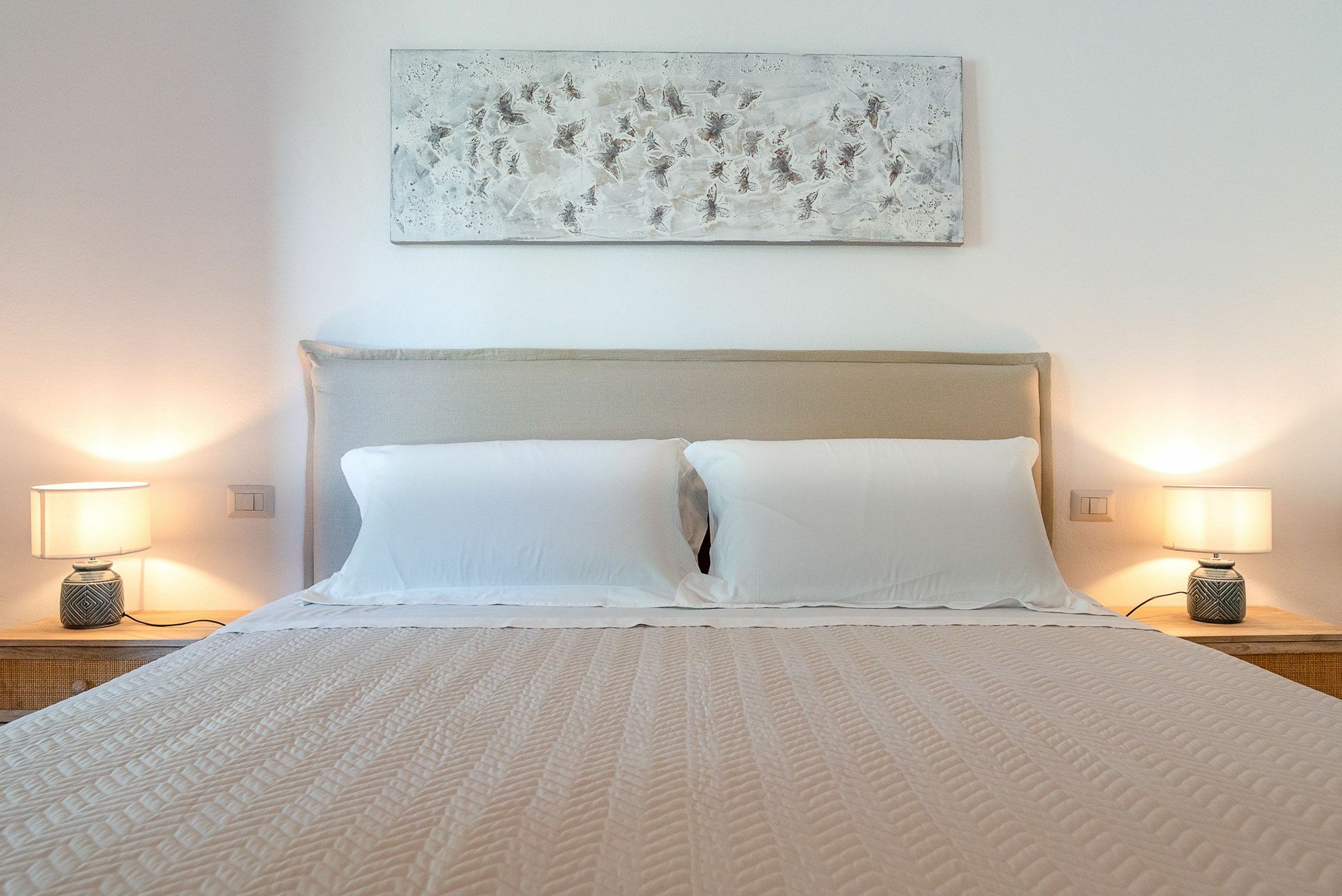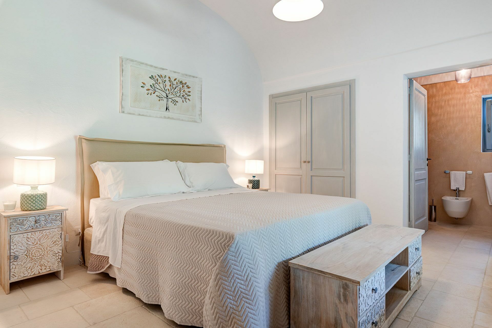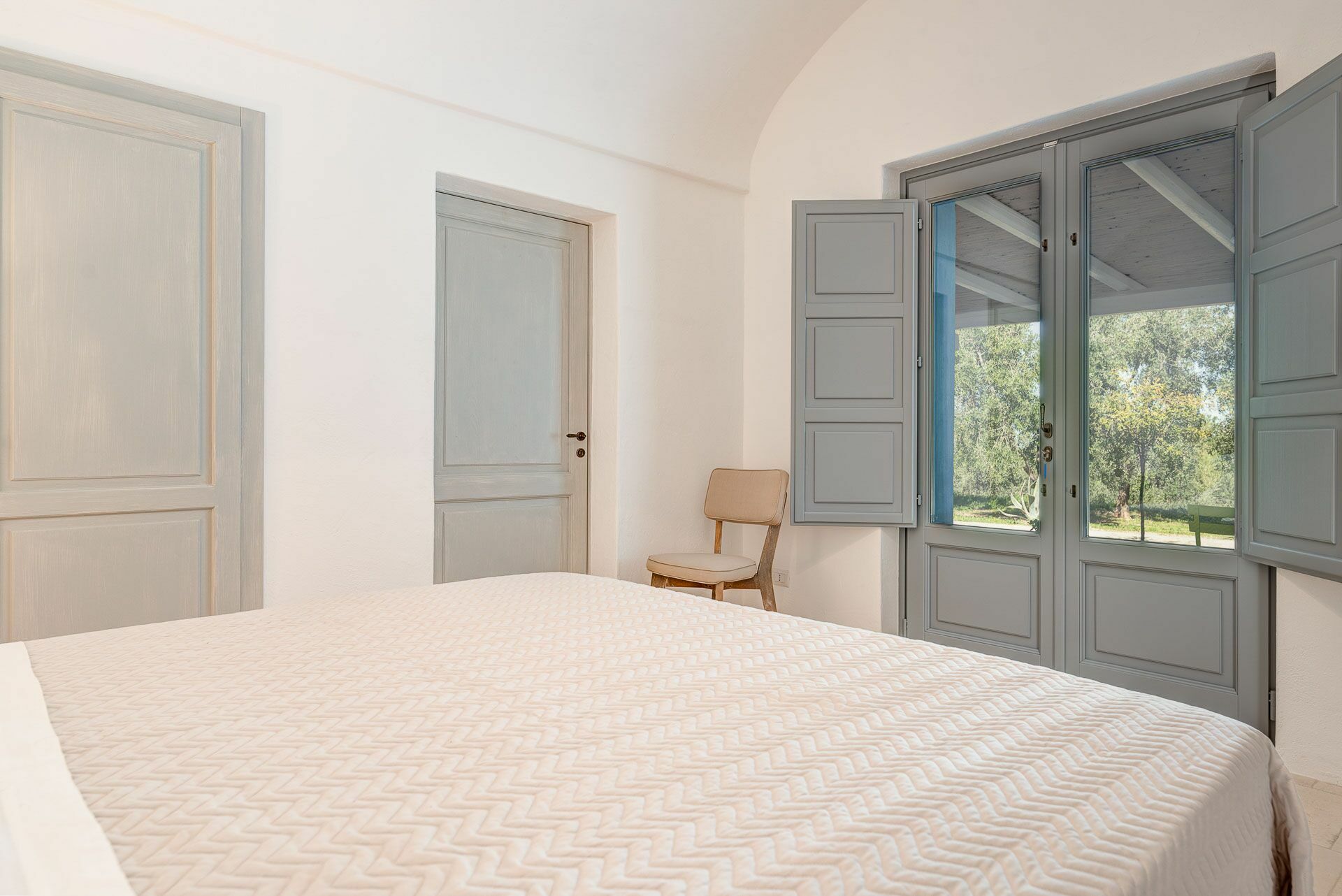 Bedroom 2 has a barrel ceiling, a double bed with headboard, four cushions, and two bedside tables with light points on the side. On the main wall a painting that reminds us of the proximity to the sea with, inlaid in the wood, of sailing boats. Here, too, the pool area is easy to access thanks to the double-leaf French door that opens onto the outside.