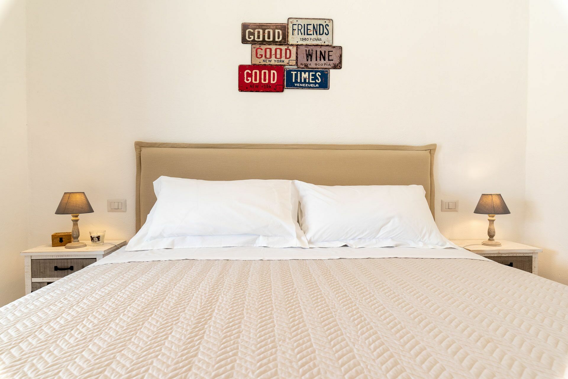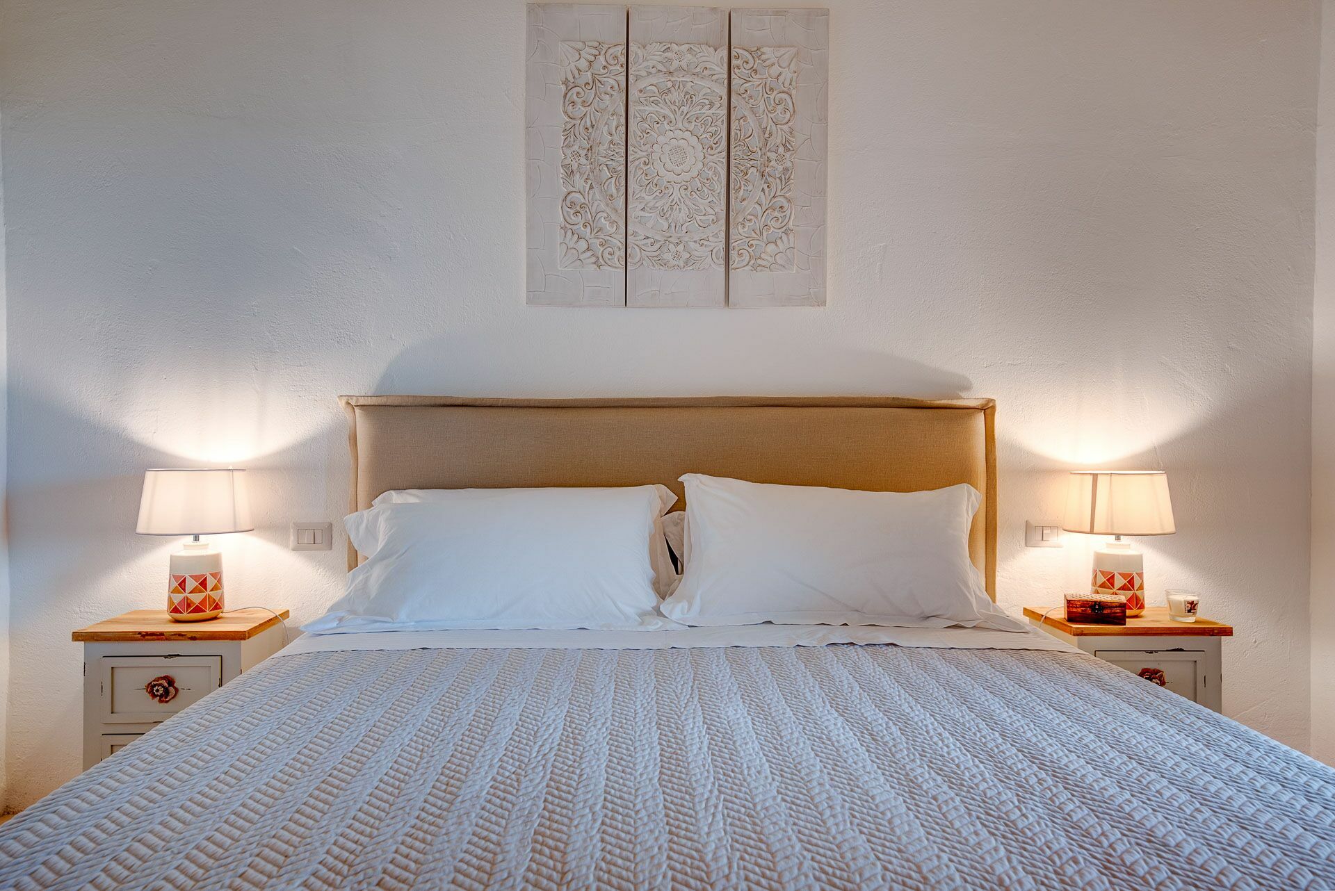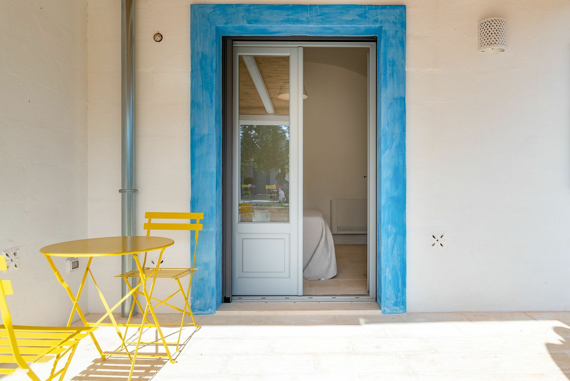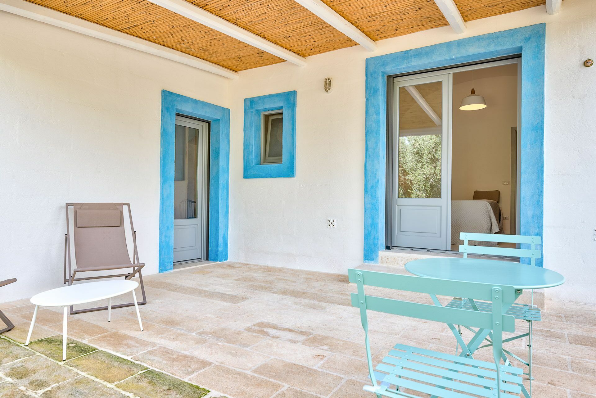 Bedroom 2 has a barrel ceiling, a double bed with headboard, four cushions, and two bedside tables with light points on the side. On the main wall a painting that reminds us of the proximity to the sea with, inlaid in the wood, of sailing boats. Here, too, the pool area is easy to access thanks to the double-leaf French door that opens onto the outside.