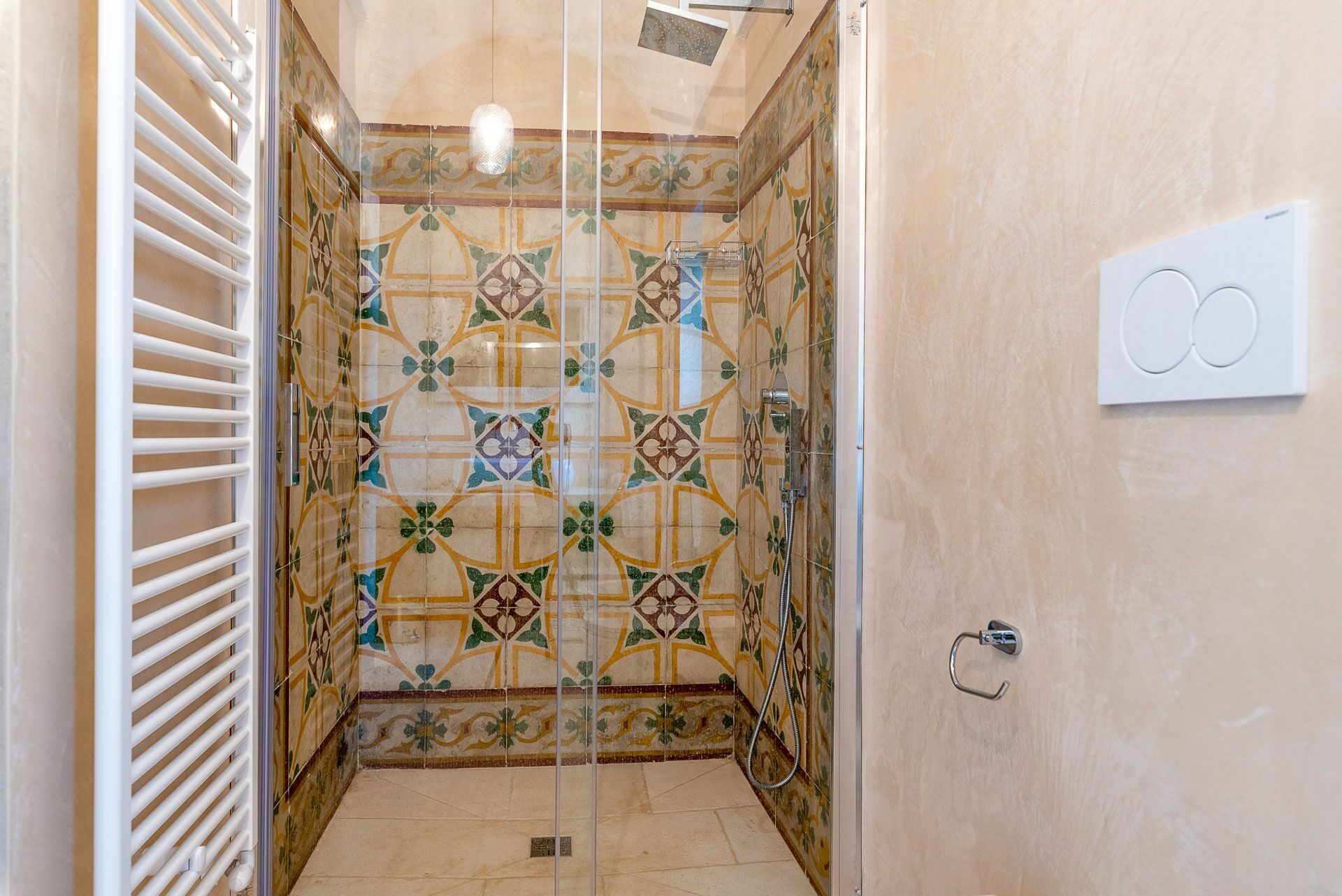 Continuing on you will finally find the fifth bedroom with a double bed with two bedside tables and light points and the bathroom complete with a large shower, sink with a mirror, toilet, bidet, and access to the outside thanks to the French door.