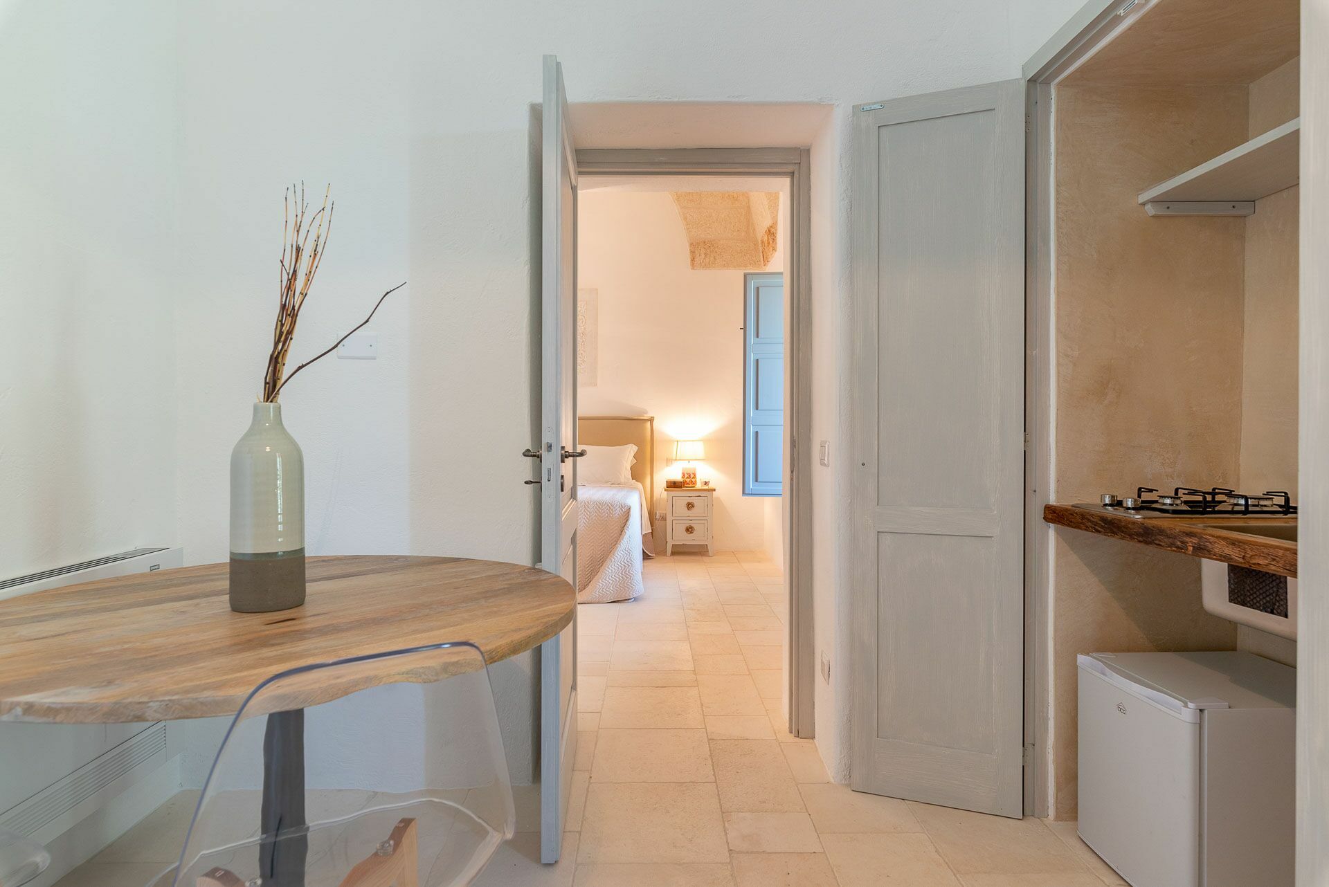 The first room, which you will find on the left, is a room with a star ceiling. A suite with a double bed with two bedside tables with light points on either side, a small desk, a courtesy chair, and a bathroom connected to it. On the main wall, a picture carved in wood. the room with a relaxation area and sofa bed and a kitchenette hide the circular dining table in the furniture. On the right is the bathroom complete with a sink with a mirror, toilet, bidet, and a large shower.