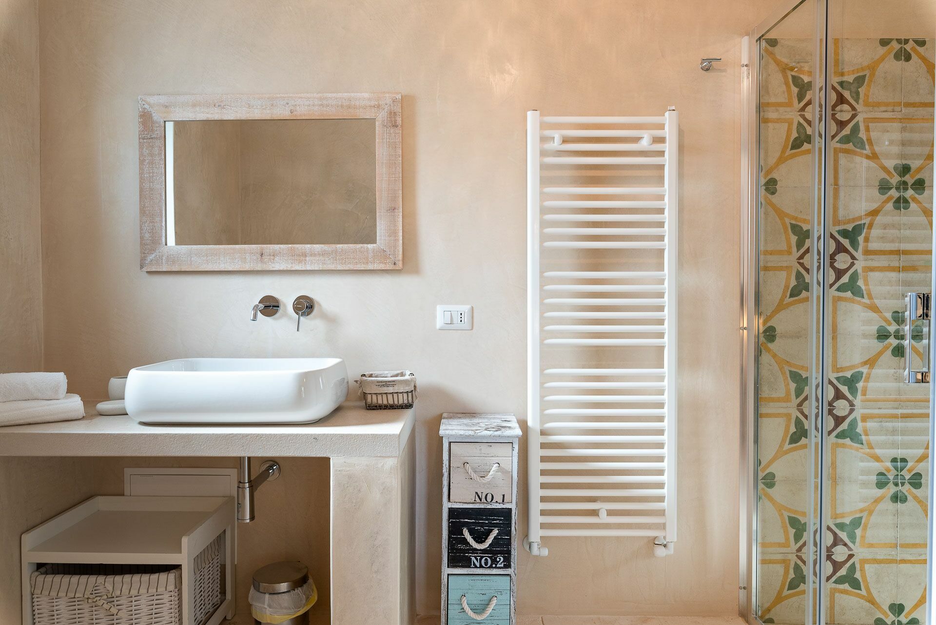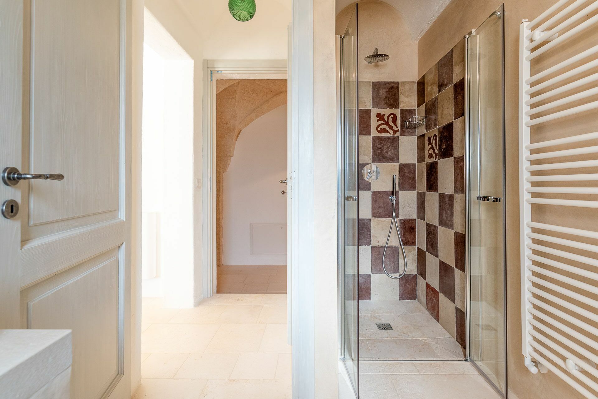Bedroom 3 has a barrel ceiling, a double bed with a headboard, four cushions, and two bedside tables with light points on the side. On the main wall of the nice metal graphics, the wooden wardrobe, and the double door French window with access to the outside. The ensuite bathroom, with a window, consists of a sink with a mirror, a toilet, a bidet, and a large shower with a checkerboard wall.