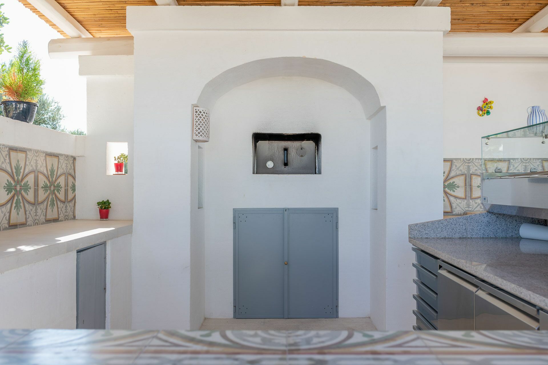 Behind the pool, there is a large wood-burning oven for professional use to accommodate the best pizza chefs at home and, an additional covered veranda closed with windows.
