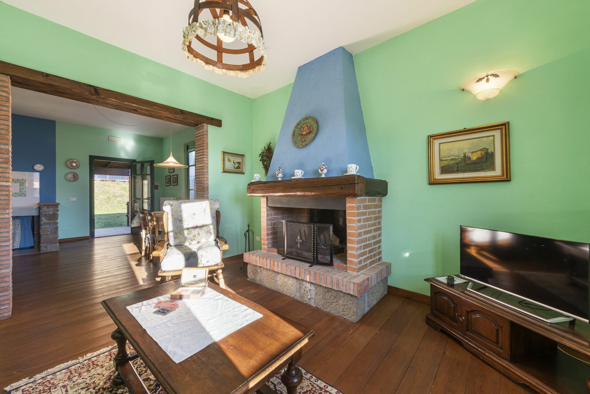 Salón: sofa, sillón, mesa de comedor (gente: 6), internet, televisión, acceso al jardín.