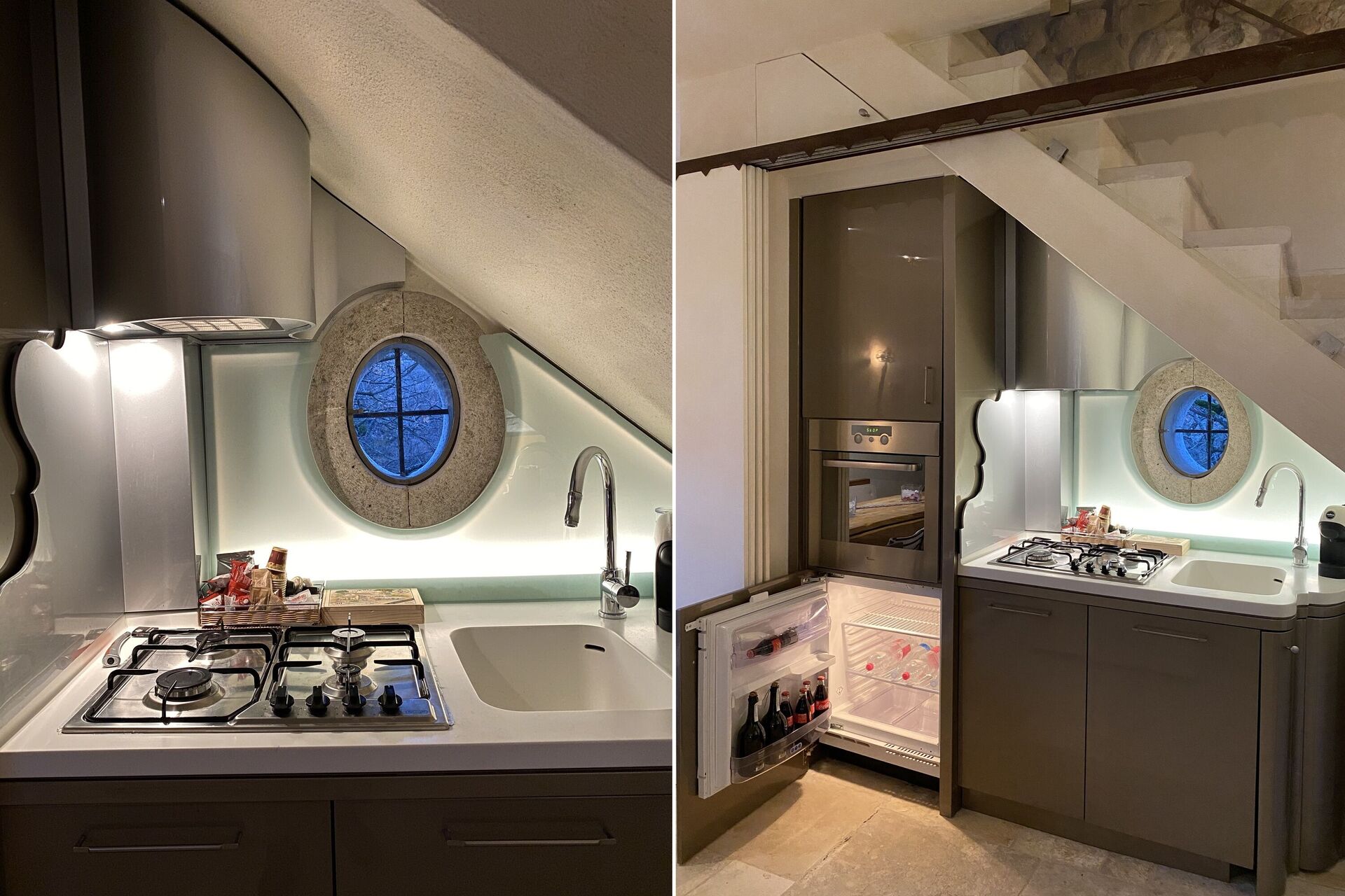 b) El apartamento 2 está situado en diferentes niveles (en la primera, segunda y tercera planta) y puede alojar hasta 5 personas. Sólo se accede a él a través de una pequeña escalera exterior de hierro (4 escalones).