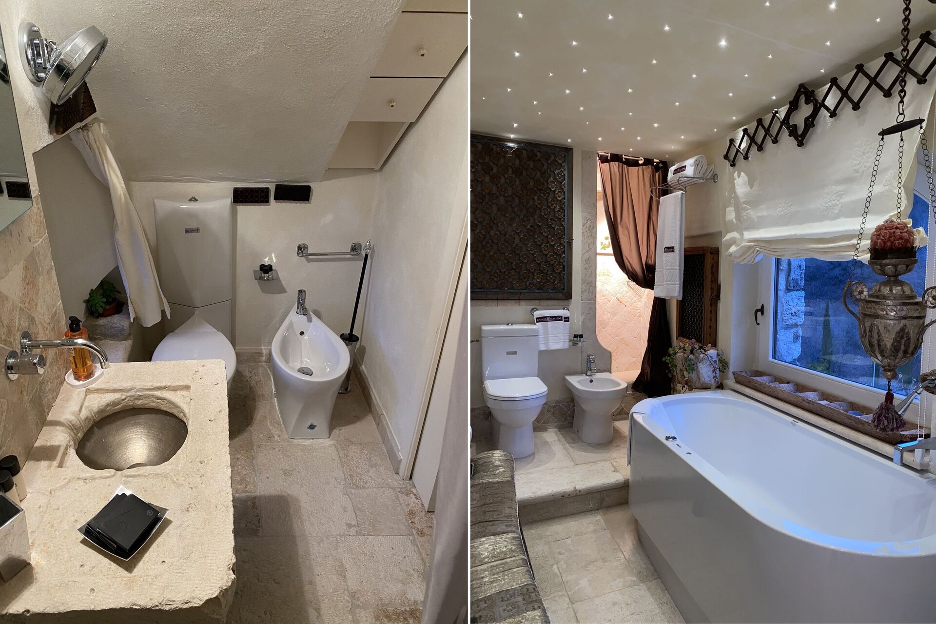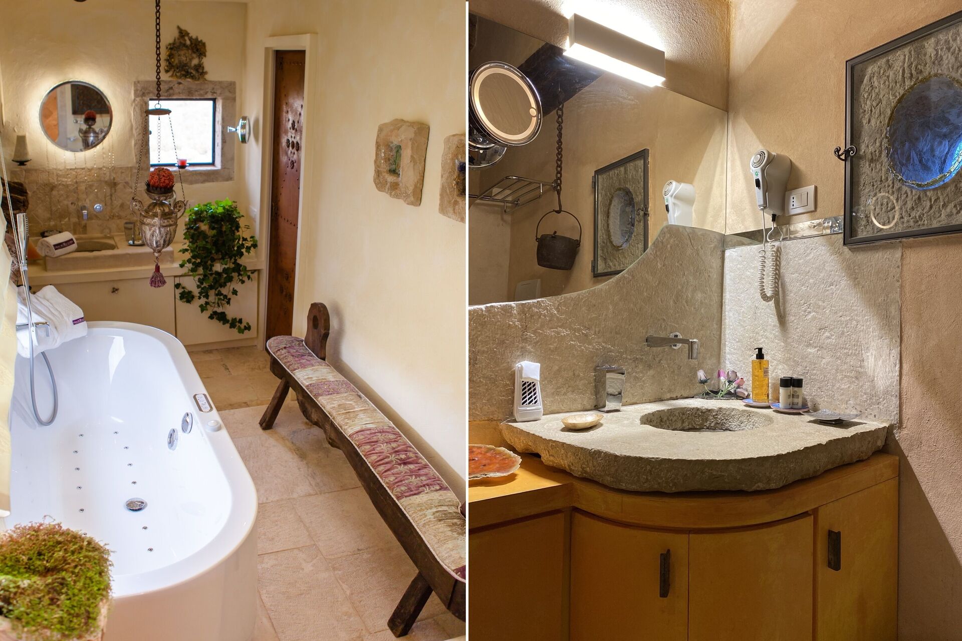 Habitación con baño: cama doble, WIFI internet, aire acondicionado, televisión, sofa, jacuzzi, lavabo, baño, bidé, ducha.